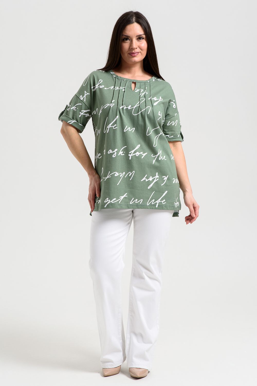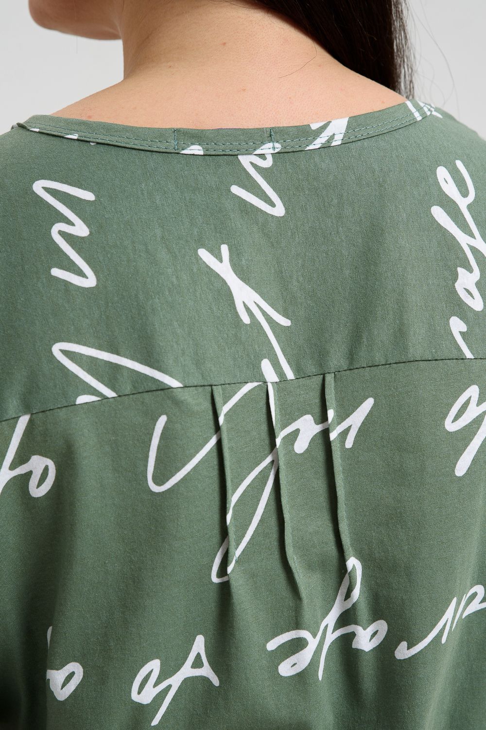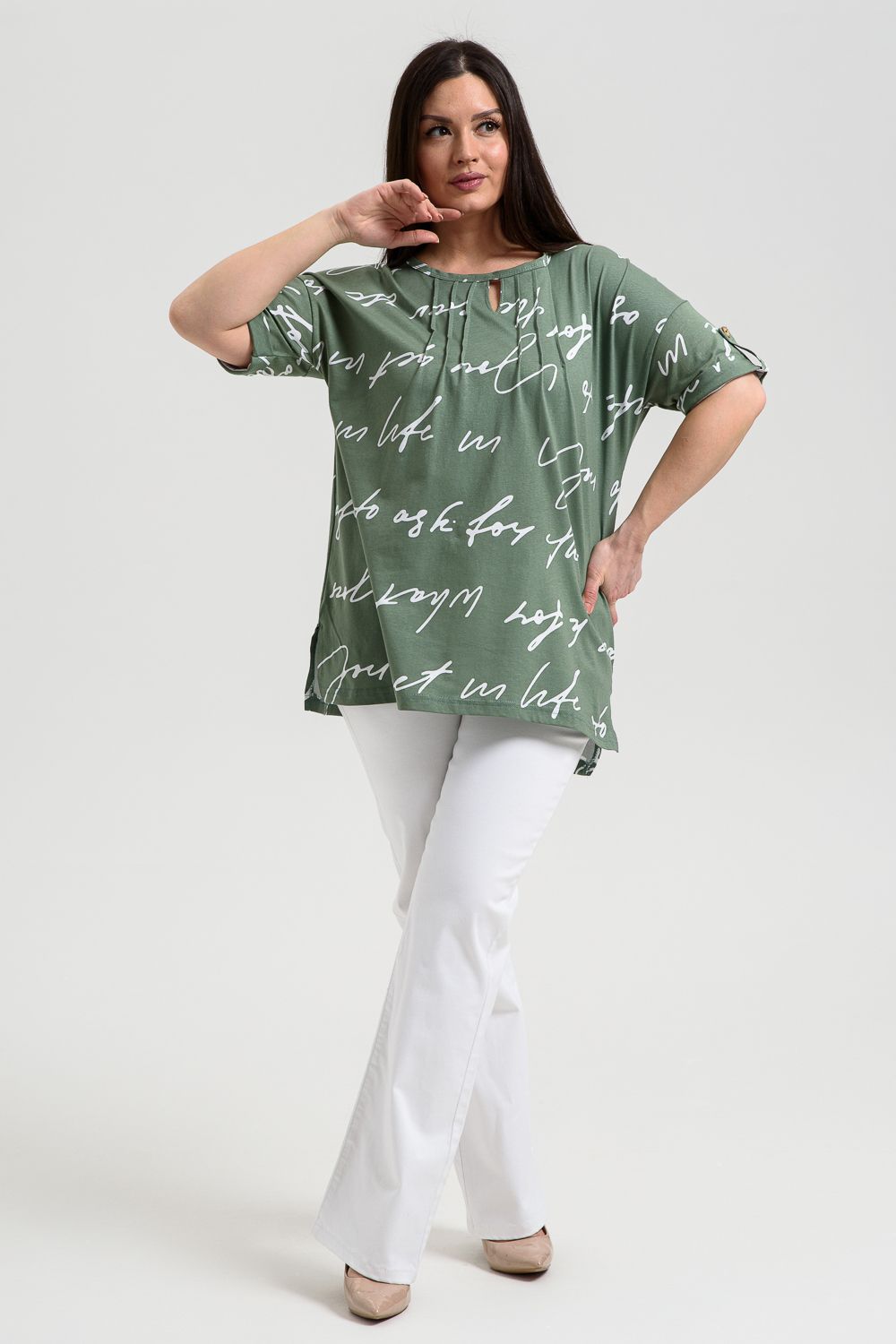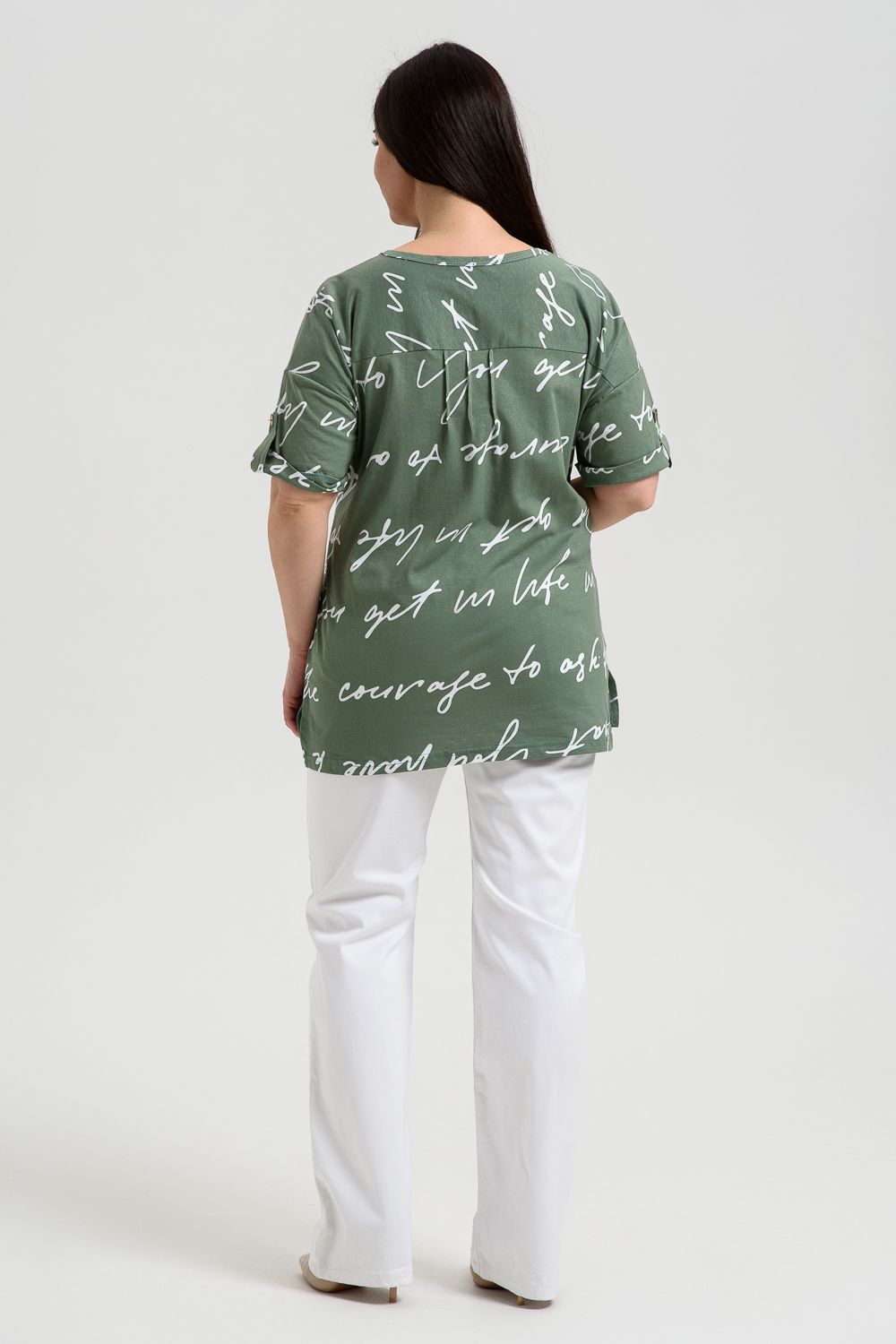 Туника прямая, свободная, с округлой горловиной, с удлиненной спинкой. Рукав короткий, с манжетом и хлястом с пуговицей. В верхней части полочки обработаны декоративные защипы. Спинка с кокеткой. В нижней части боковых швов расположены разрезы. Горловина обработана бейкой из основного полотна.