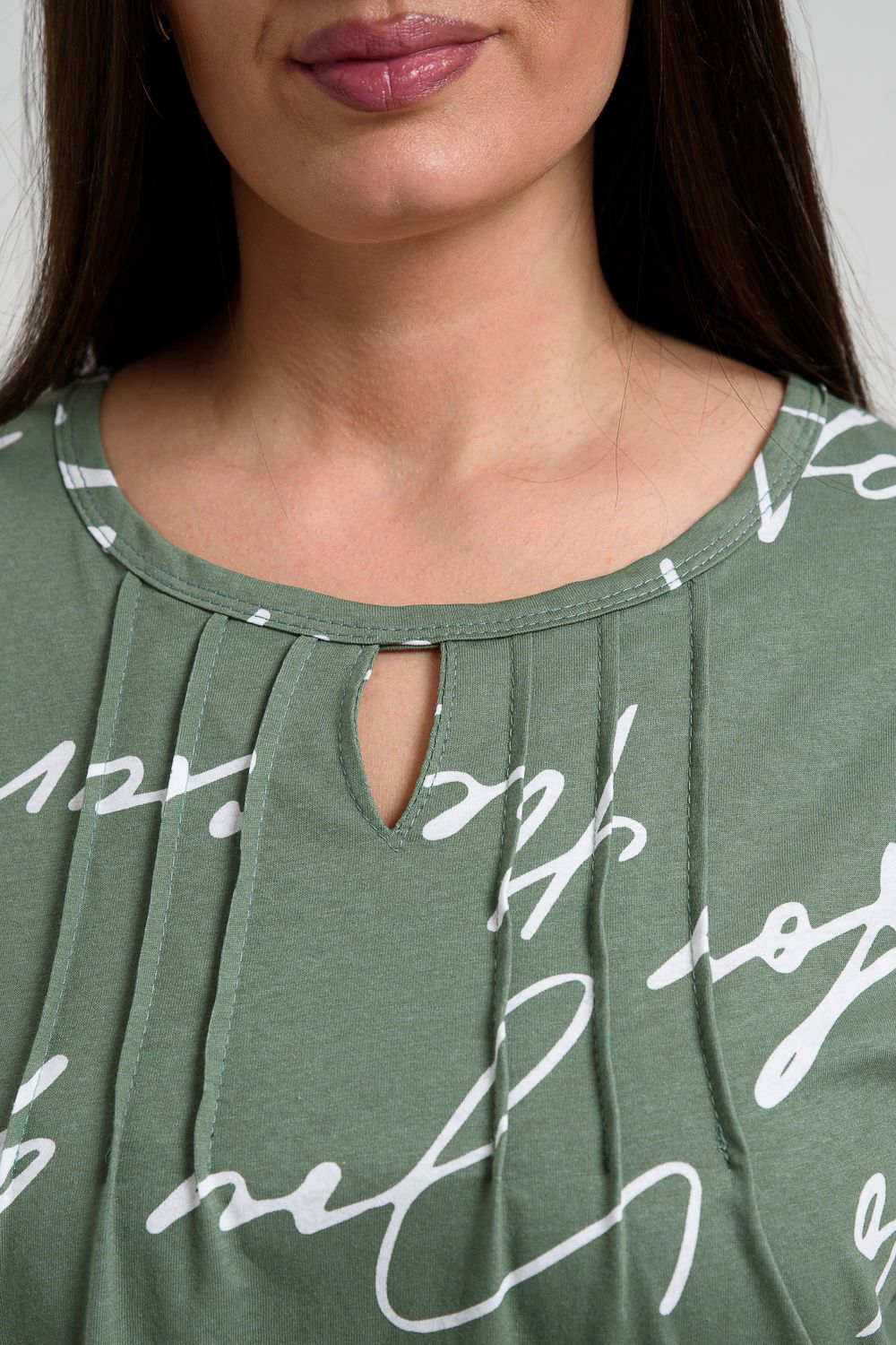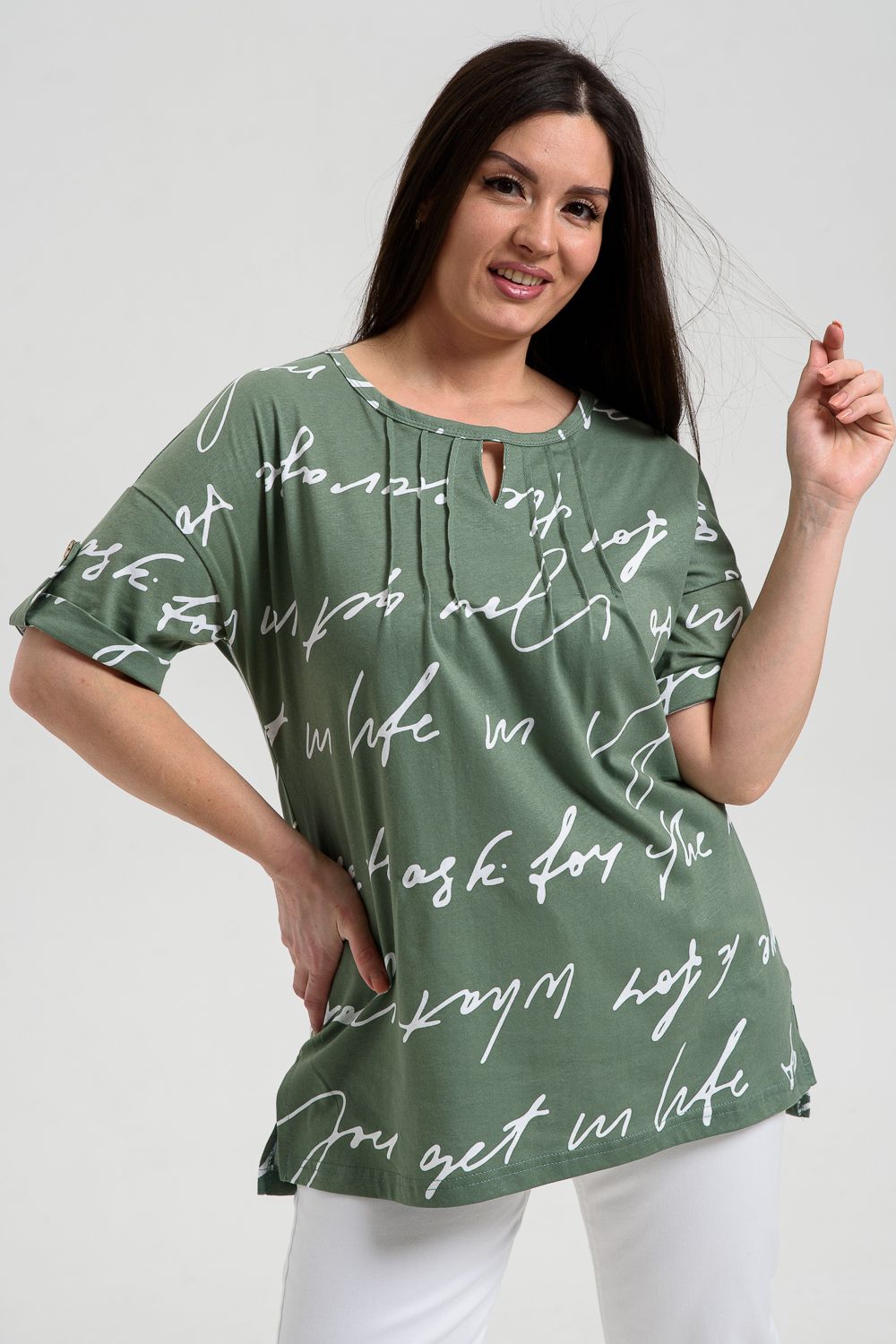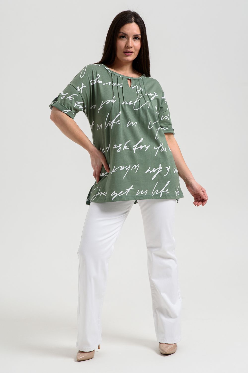 Туника прямая, свободная, с округлой горловиной, с удлиненной спинкой. Рукав короткий, с манжетом и хлястом с пуговицей. В верхней части полочки обработаны декоративные защипы. Спинка с кокеткой. В нижней части боковых швов расположены разрезы. Горловина обработана бейкой из основного полотна.
