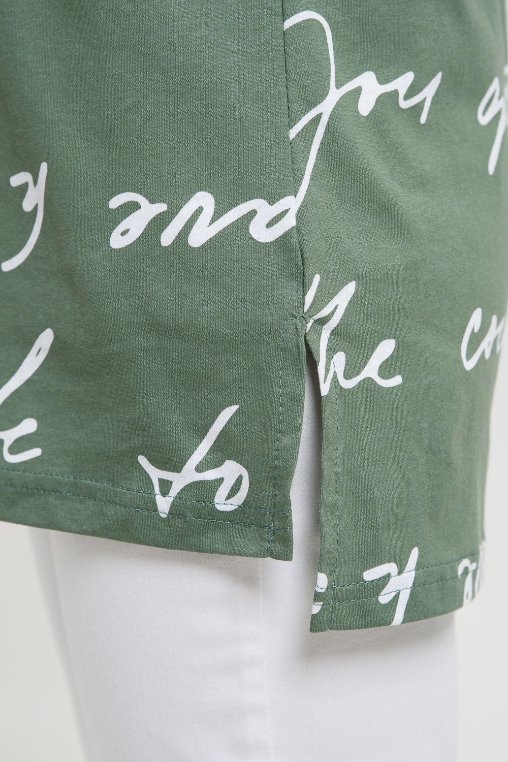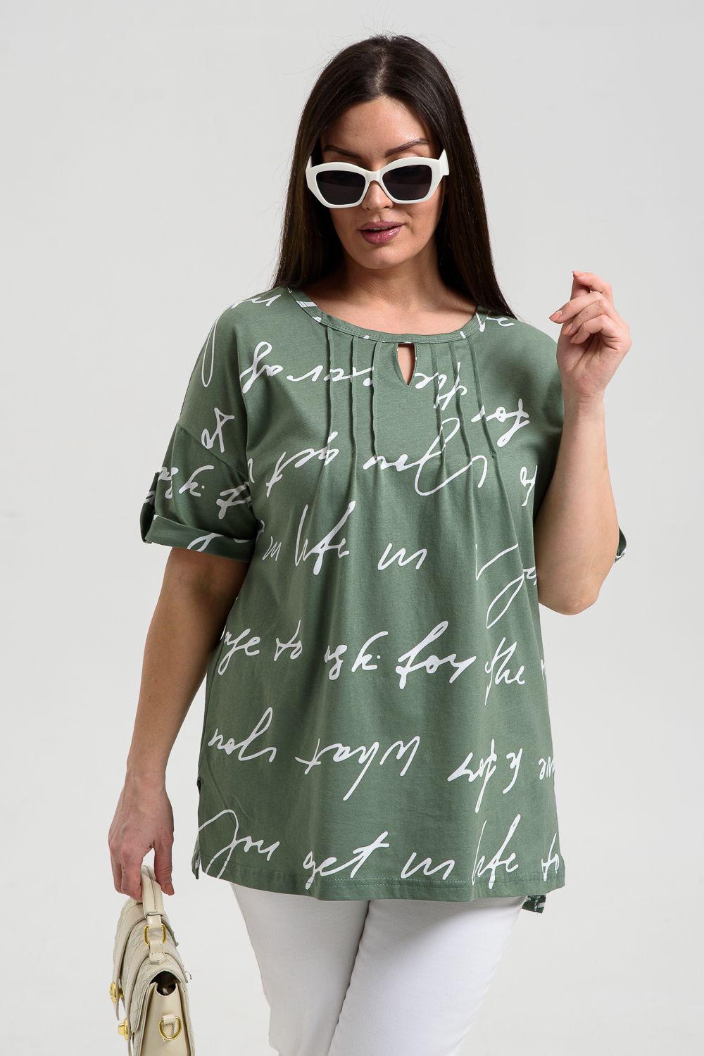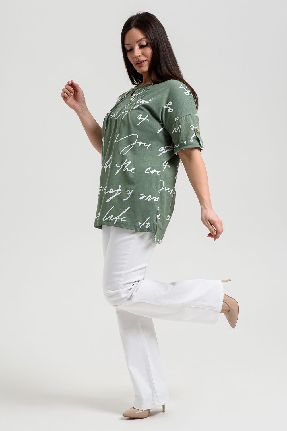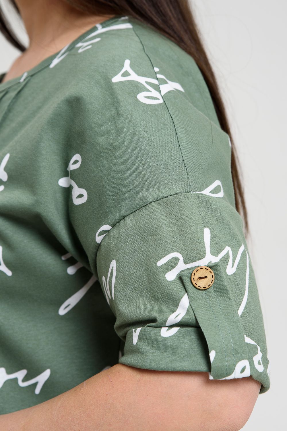Туника прямая, свободная, с округлой горловиной, с удлиненной спинкой. Рукав короткий, с манжетом и хлястом с пуговицей. В верхней части полочки обработаны декоративные защипы. Спинка с кокеткой. В нижней части боковых швов расположены разрезы. Горловина обработана бейкой из основного полотна.