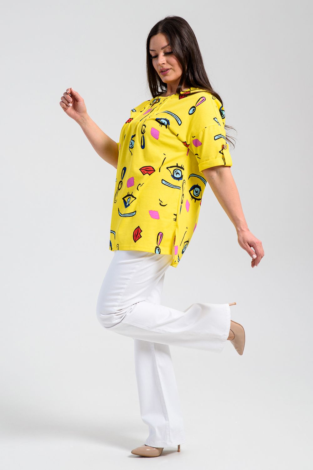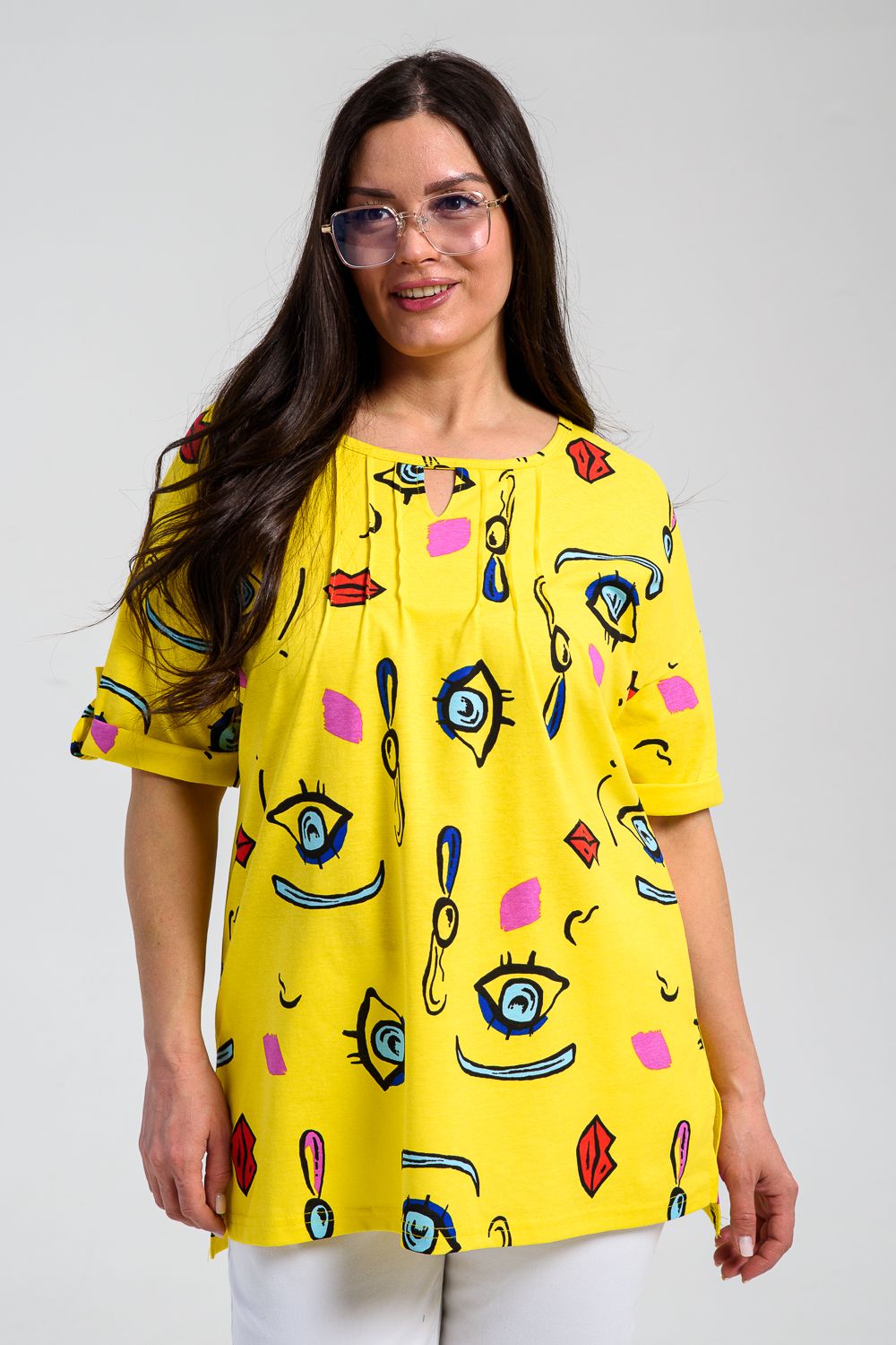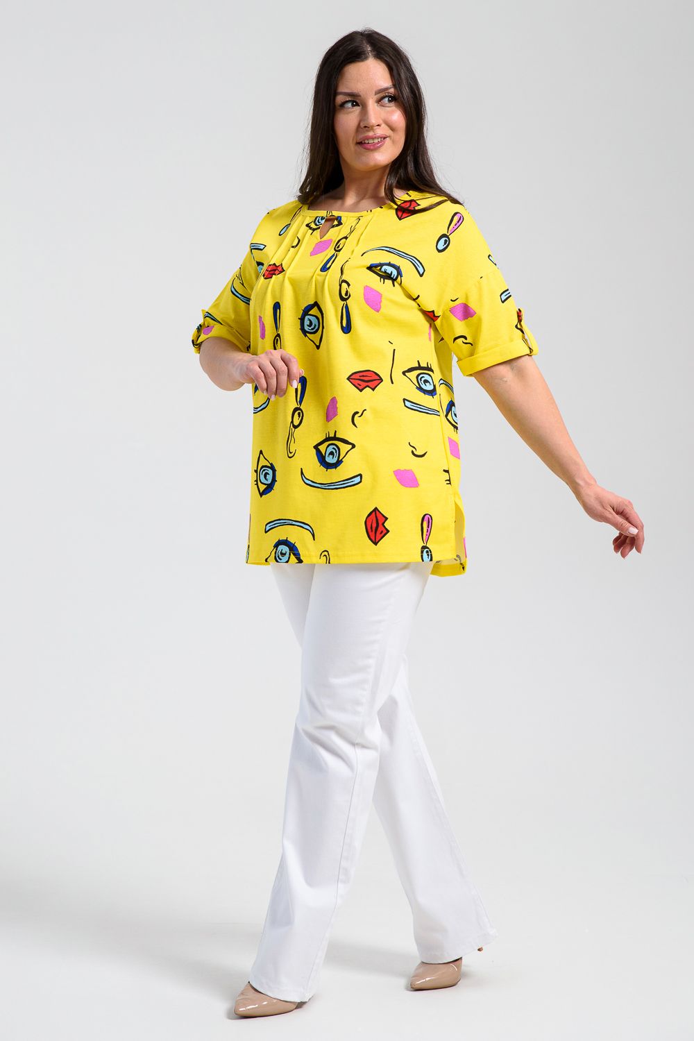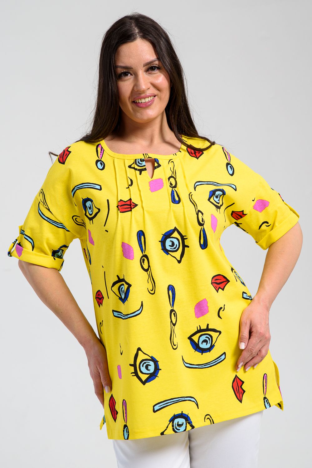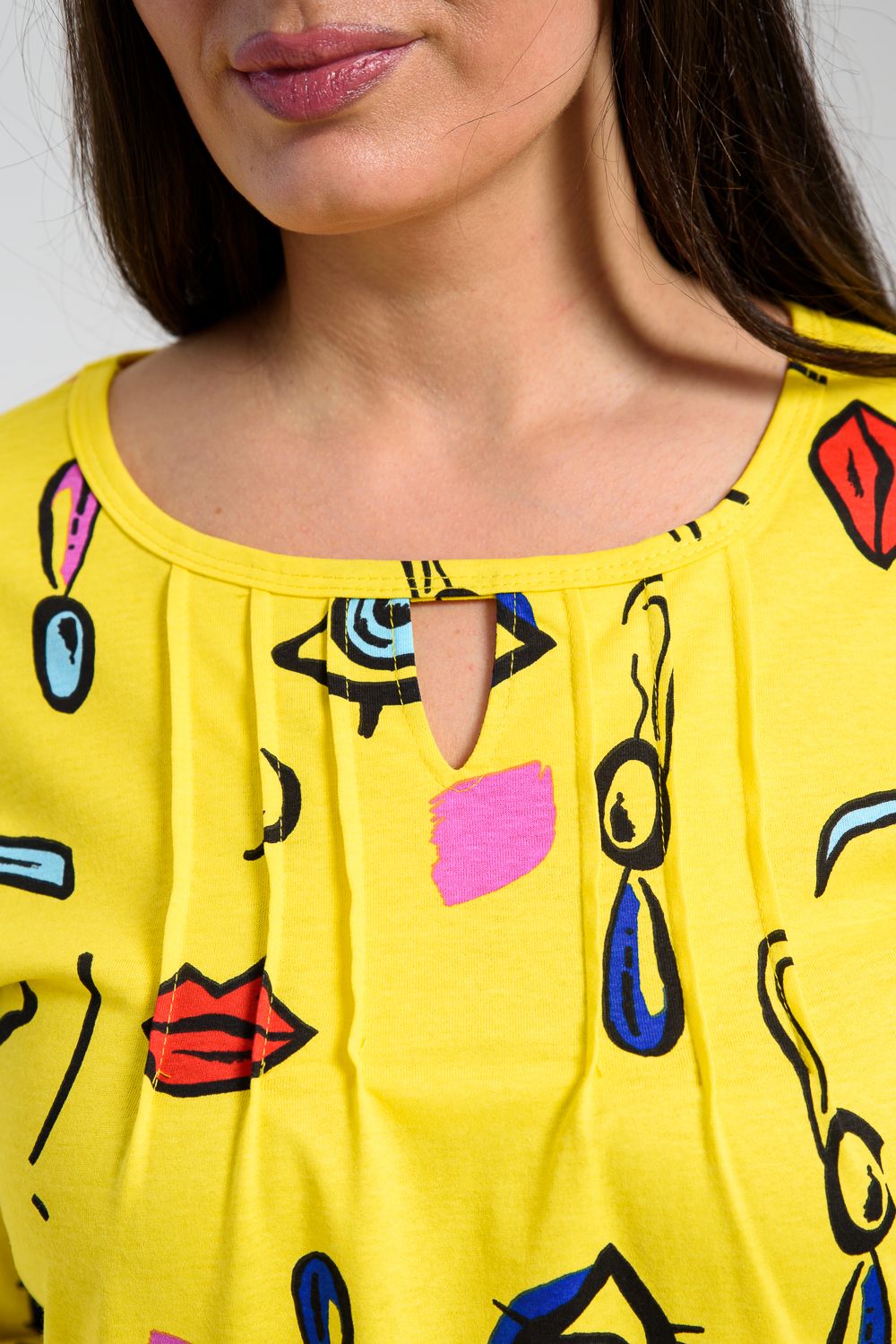 Туника прямая, свободная, с округлой горловиной, с удлиненной спинкой. Рукав короткий, с манжетом и хлястом с пуговицей. В верхней части полочки обработаны декоративные защипы. Спинка с кокеткой. В нижней части боковых швов расположены разрезы. Горловина обработана бейкой из основного полотна.