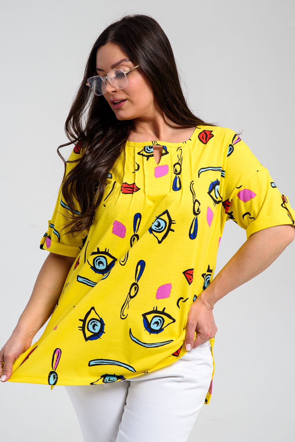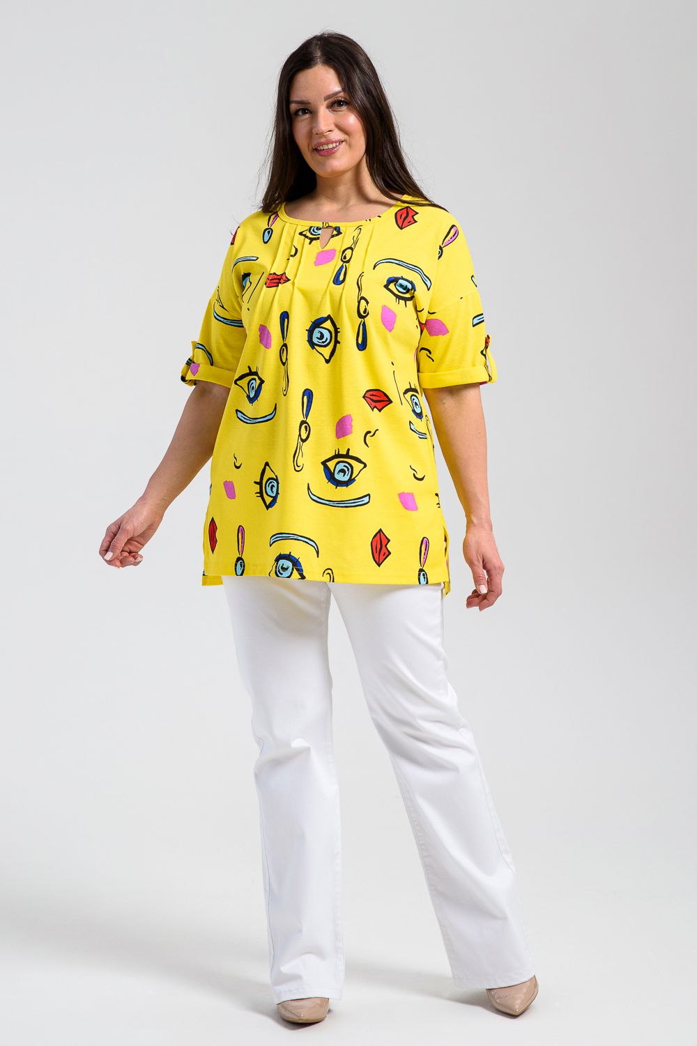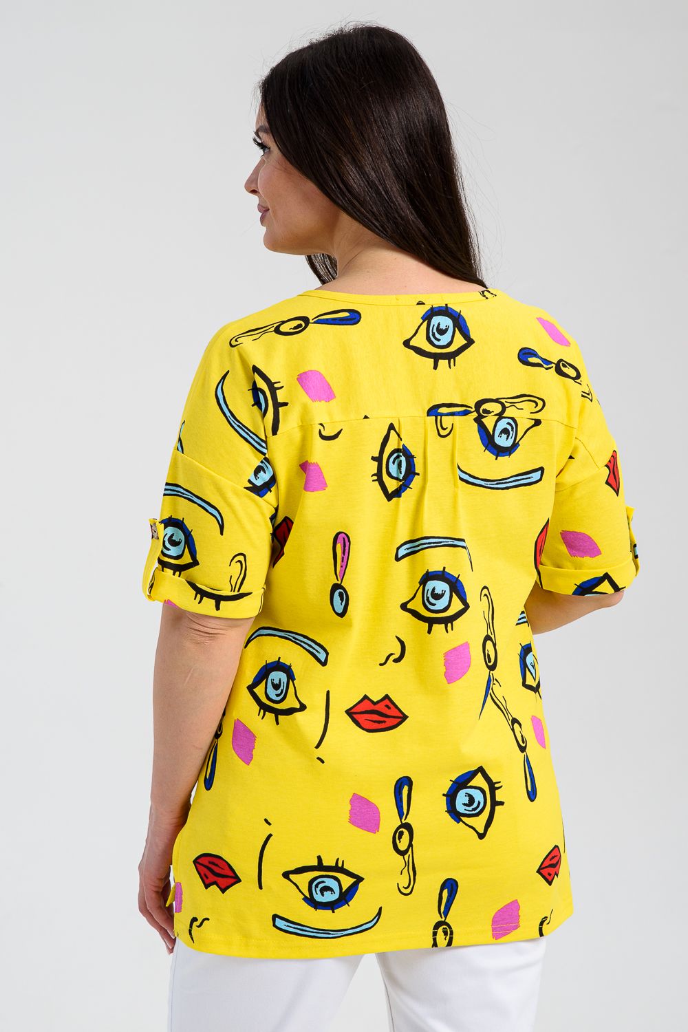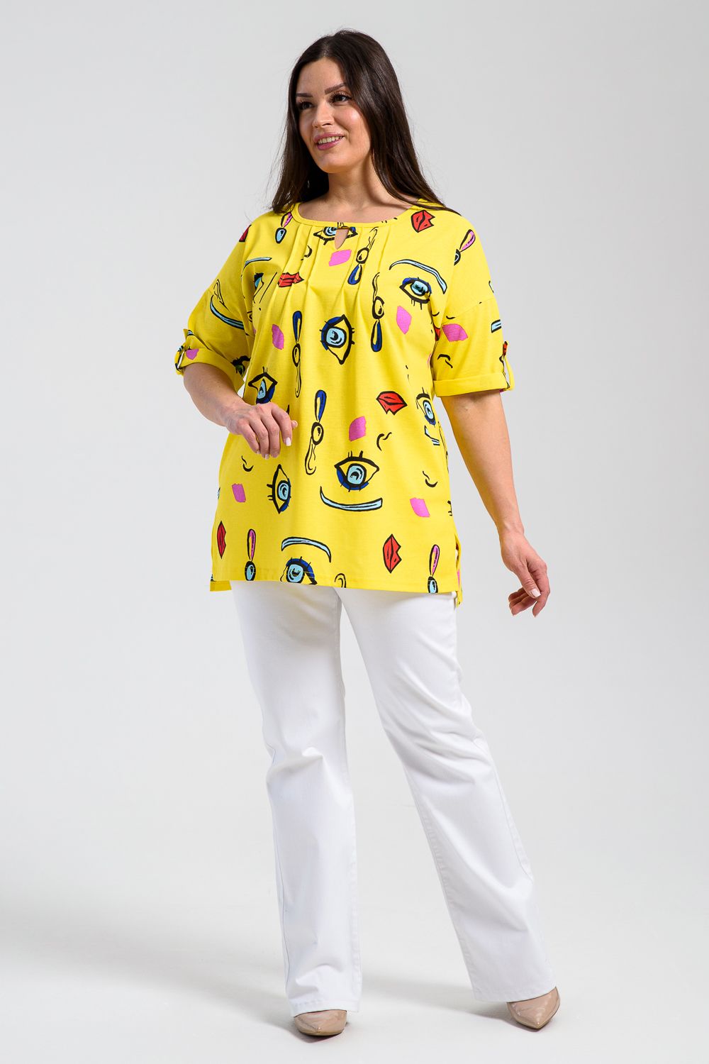 Туника прямая, свободная, с округлой горловиной, с удлиненной спинкой. Рукав короткий, с манжетом и хлястом с пуговицей. В верхней части полочки обработаны декоративные защипы. Спинка с кокеткой. В нижней части боковых швов расположены разрезы. Горловина обработана бейкой из основного полотна.