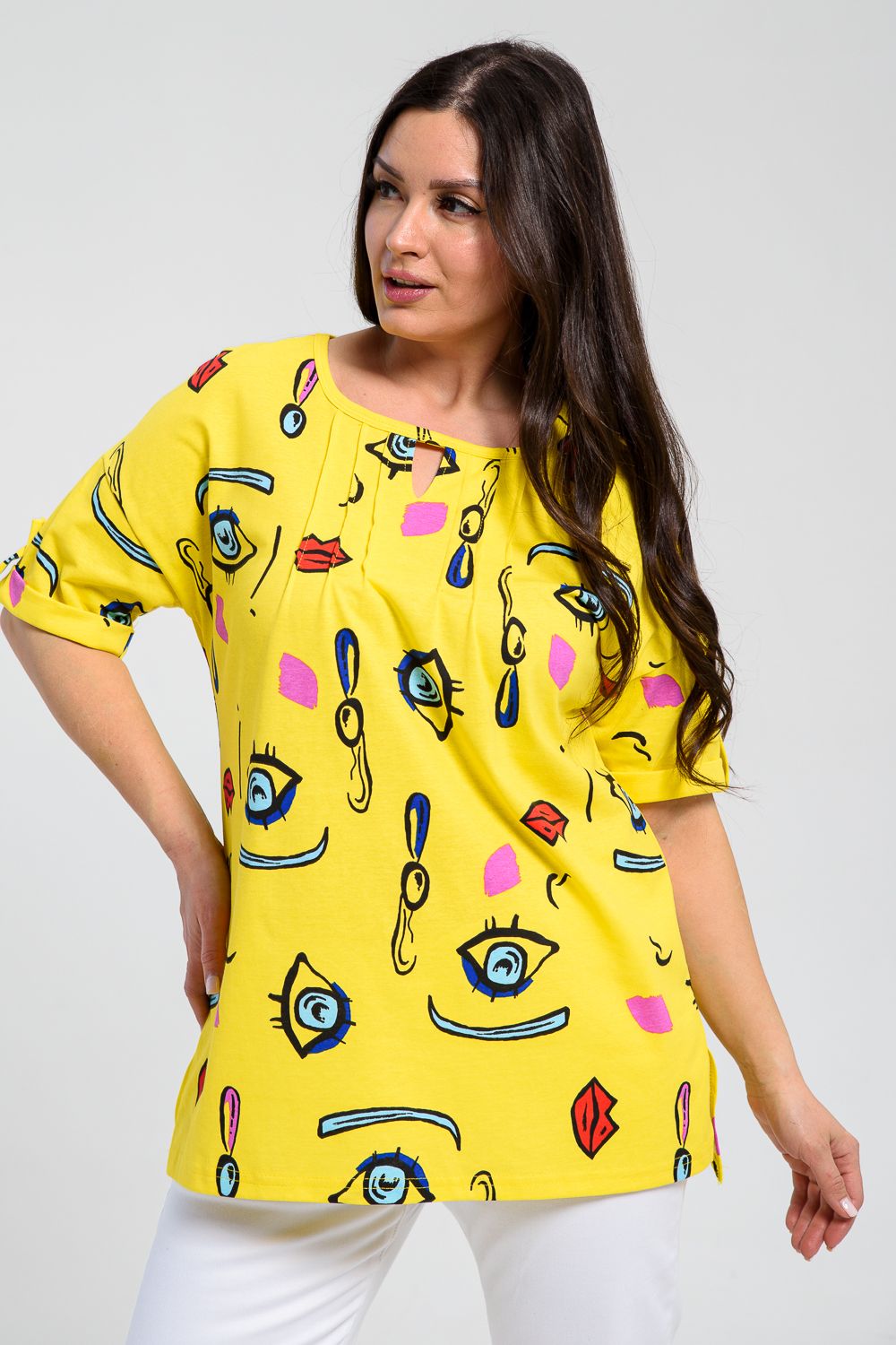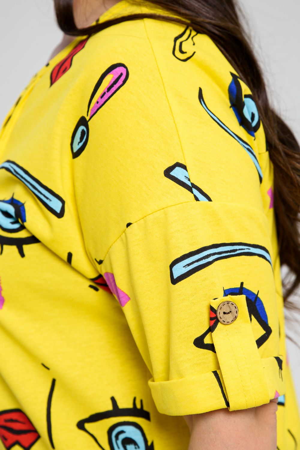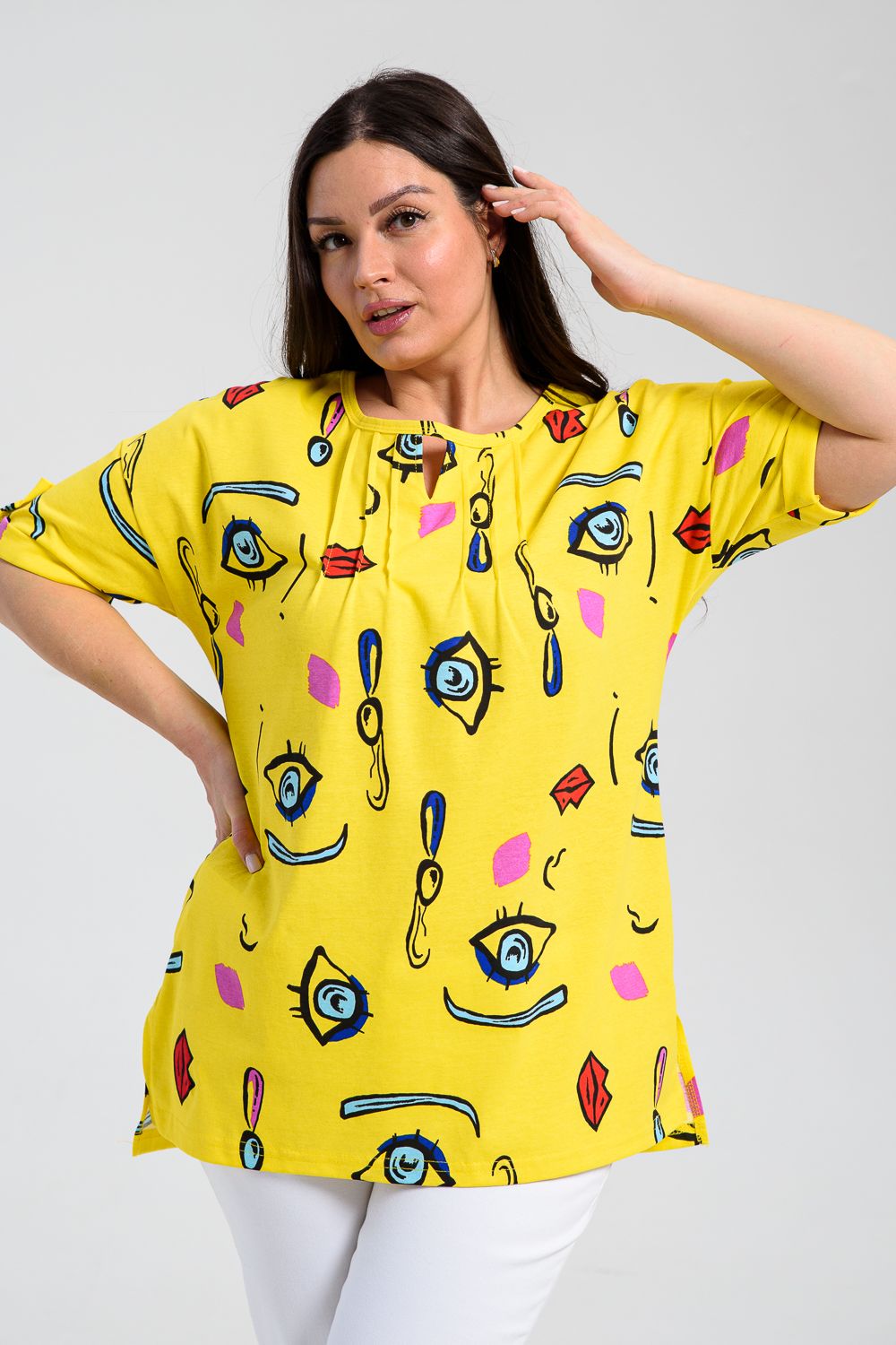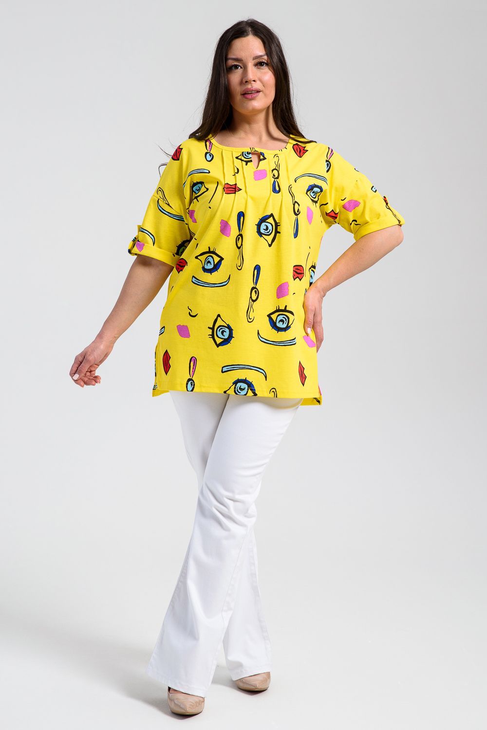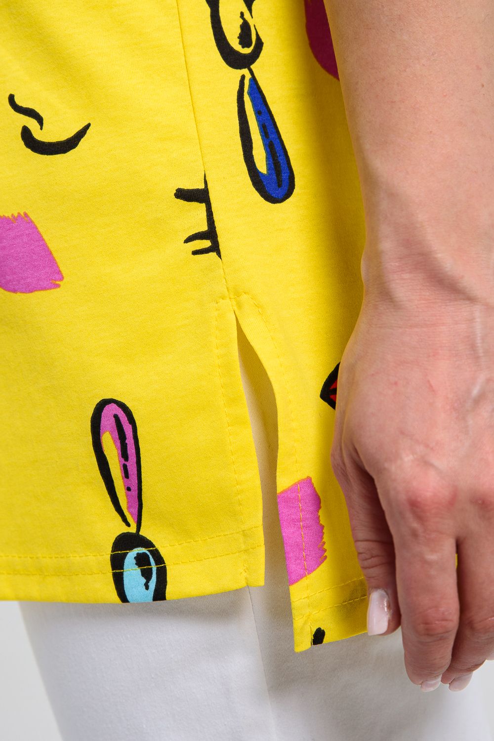 Туника прямая, свободная, с округлой горловиной, с удлиненной спинкой. Рукав короткий, с манжетом и хлястом с пуговицей. В верхней части полочки обработаны декоративные защипы. Спинка с кокеткой. В нижней части боковых швов расположены разрезы. Горловина обработана бейкой из основного полотна.