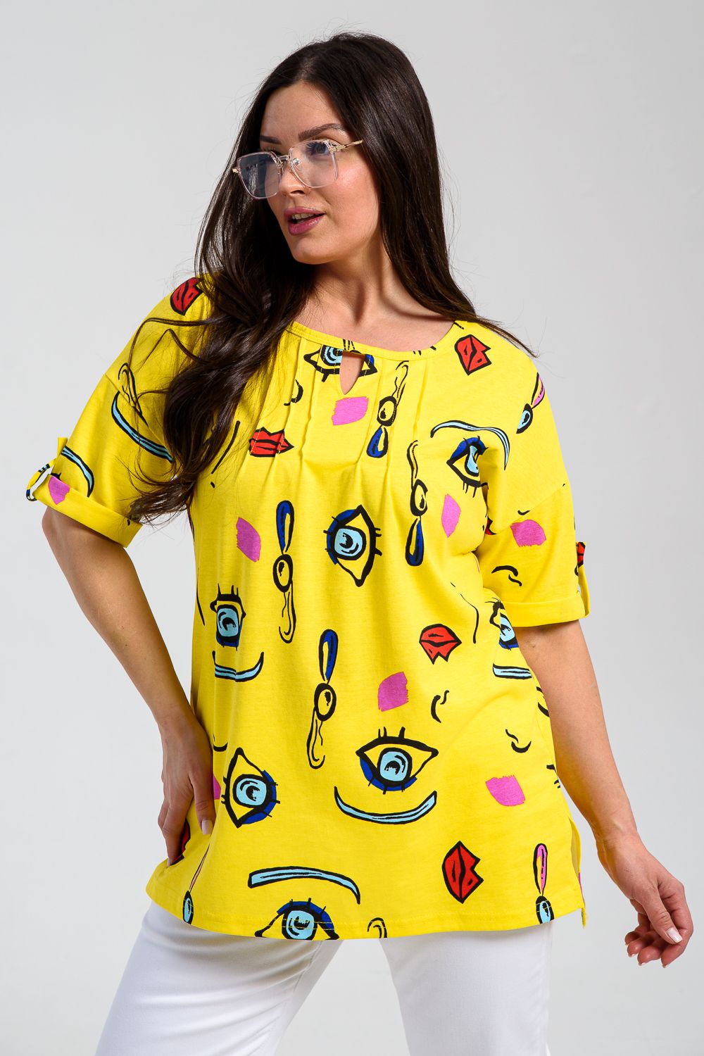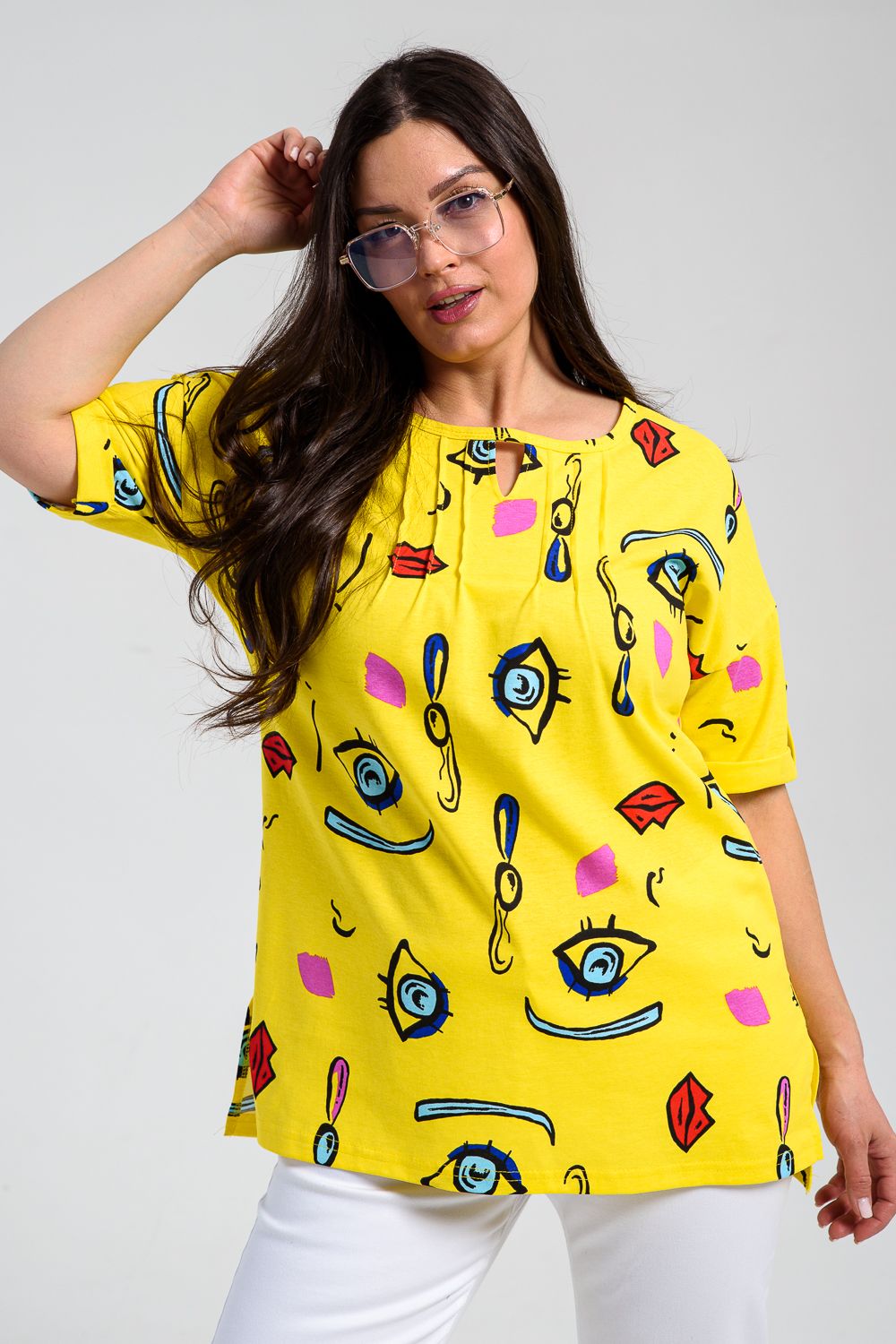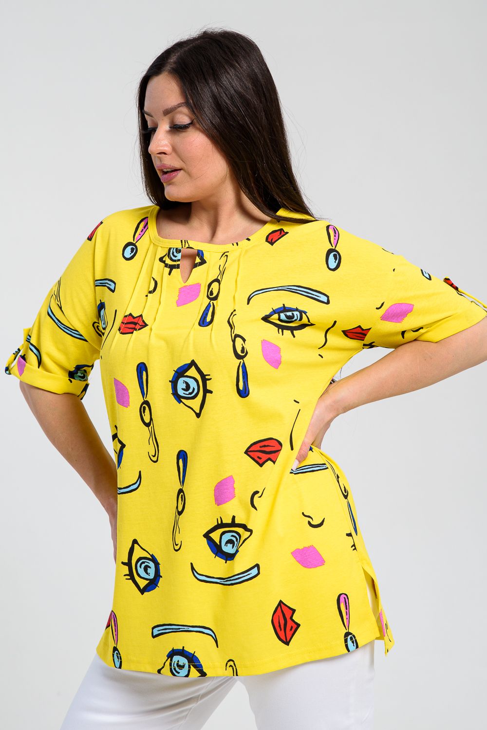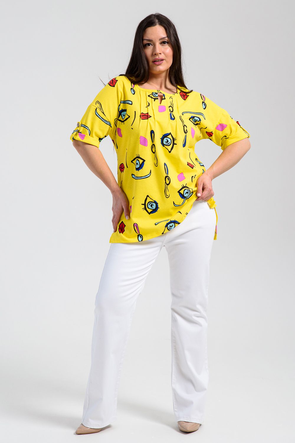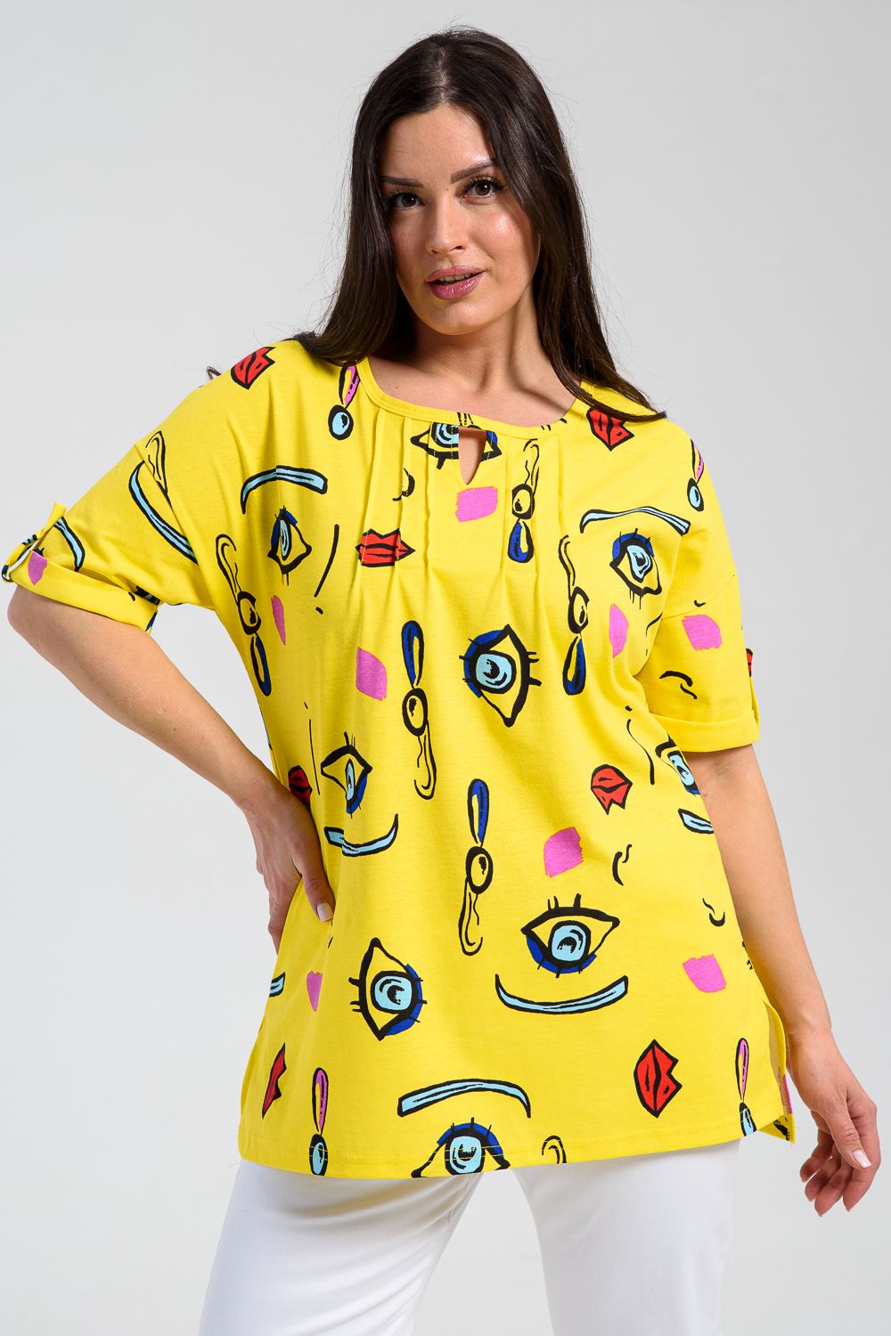 Туника прямая, свободная, с округлой горловиной, с удлиненной спинкой. Рукав короткий, с манжетом и хлястом с пуговицей. В верхней части полочки обработаны декоративные защипы. Спинка с кокеткой. В нижней части боковых швов расположены разрезы. Горловина обработана бейкой из основного полотна.