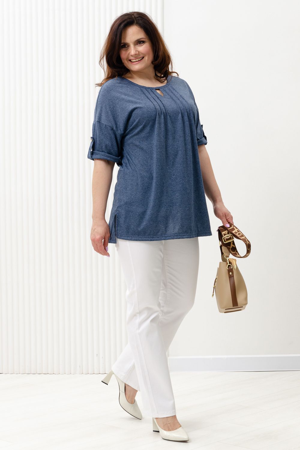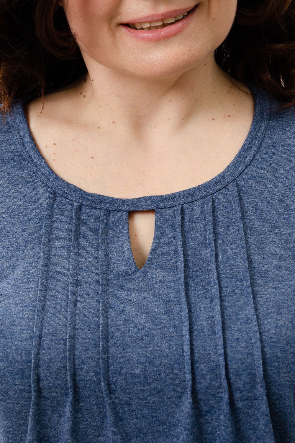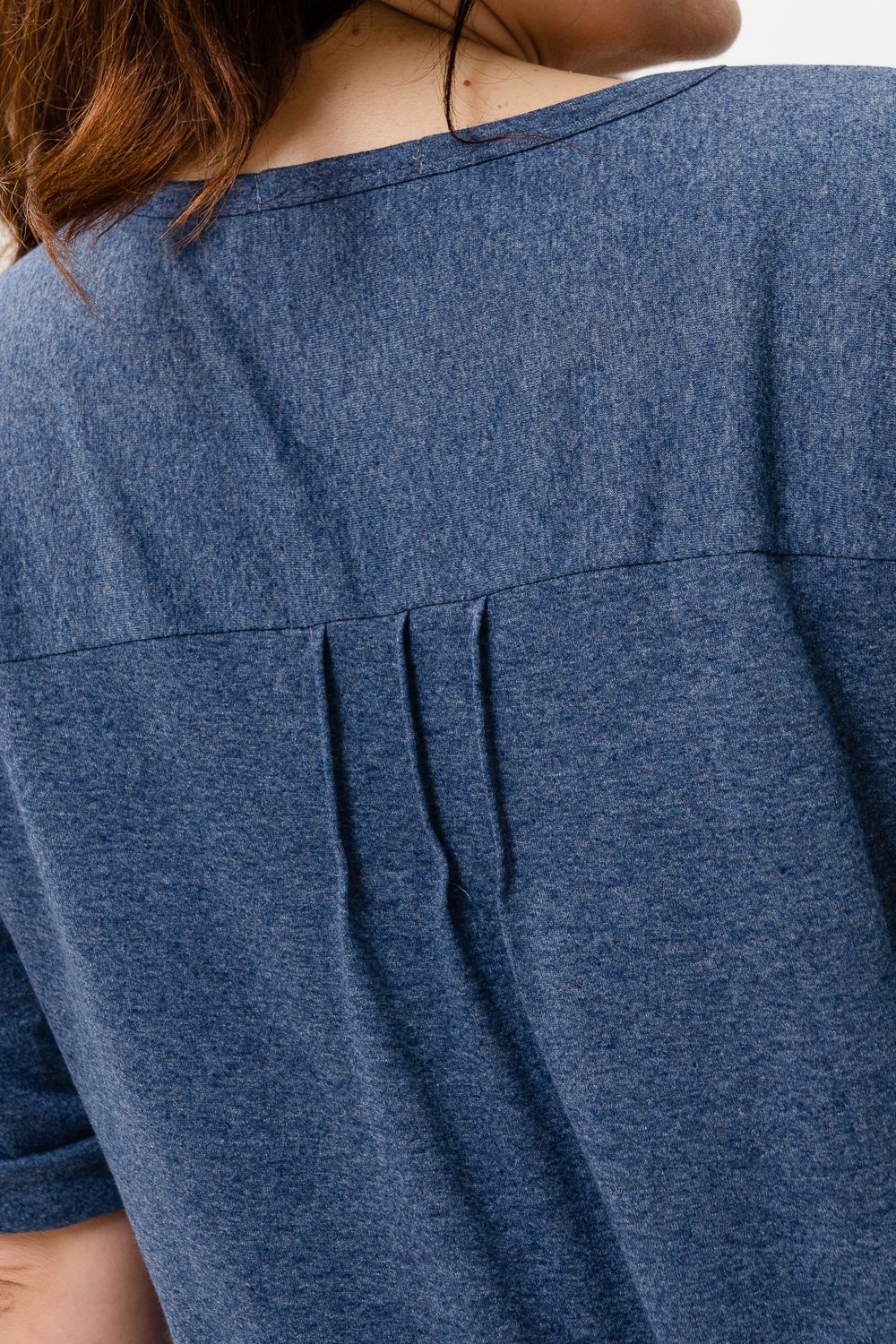 Туника прямая, свободная, с округлой горловиной, с удлиненной спинкой. Рукав короткий, с манжетом и хлястом с пуговицей. В верхней части полочки обработаны декоративные защипы. Спинка с кокеткой. В нижней части боковых швов расположены разрезы. Горловина обработана бейкой из основного полотна.