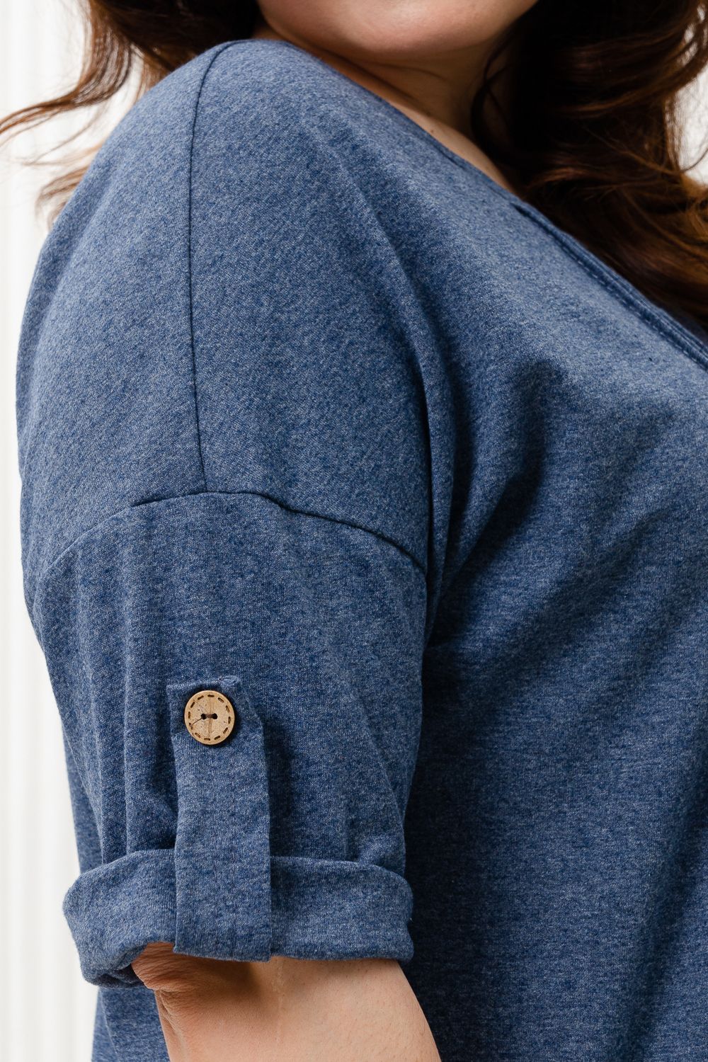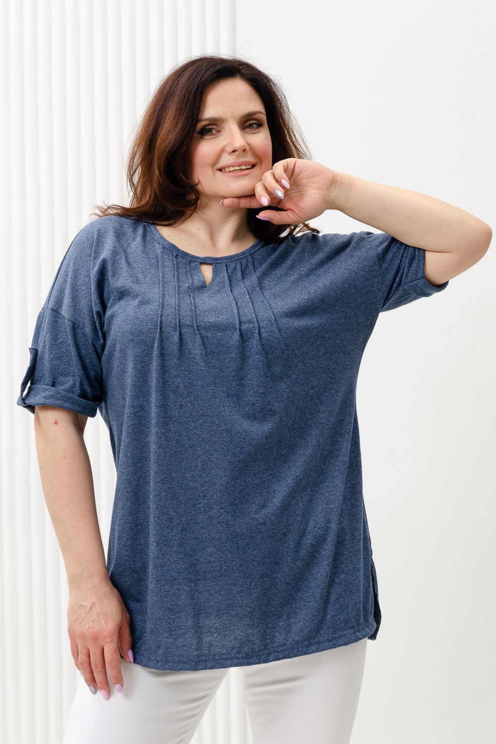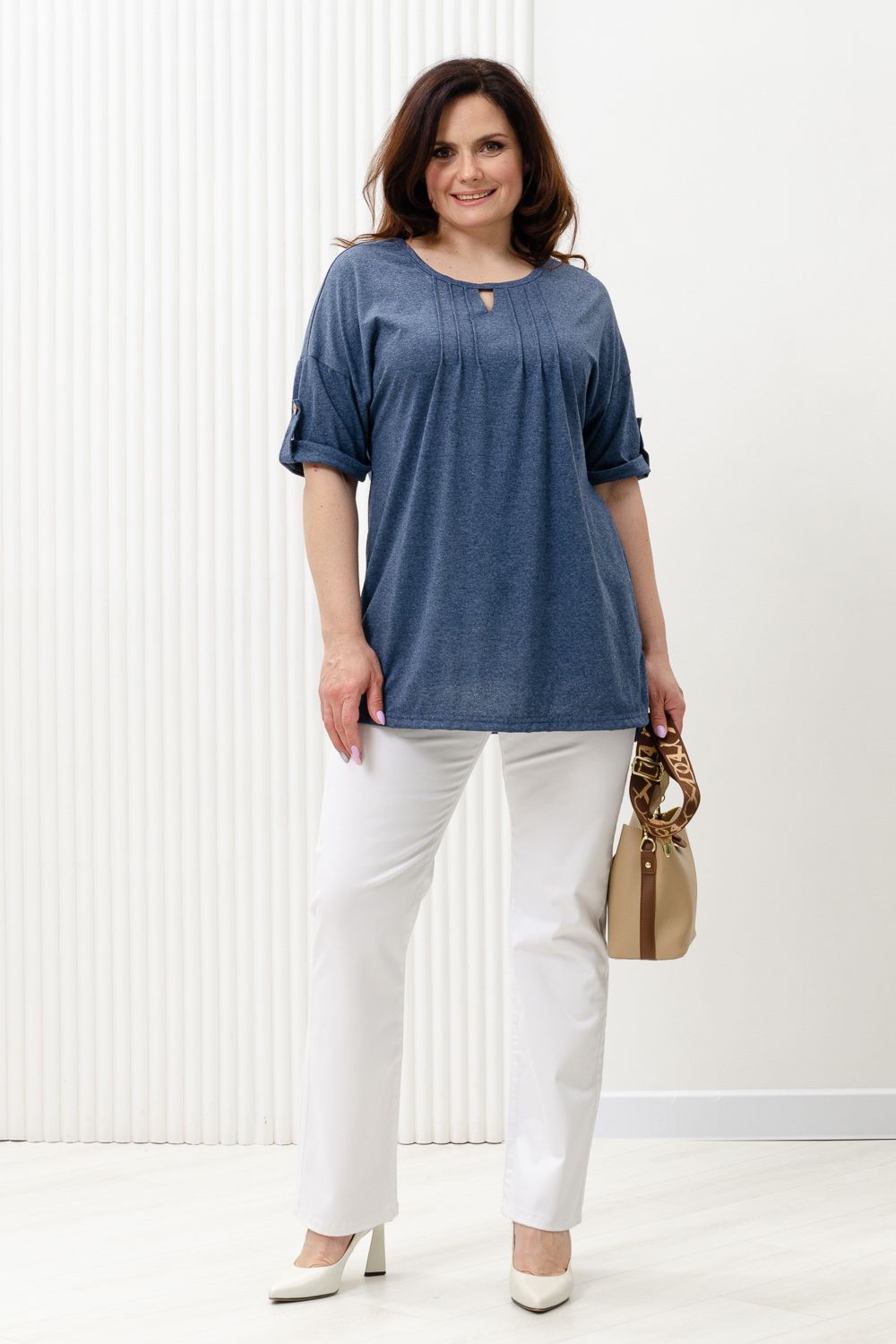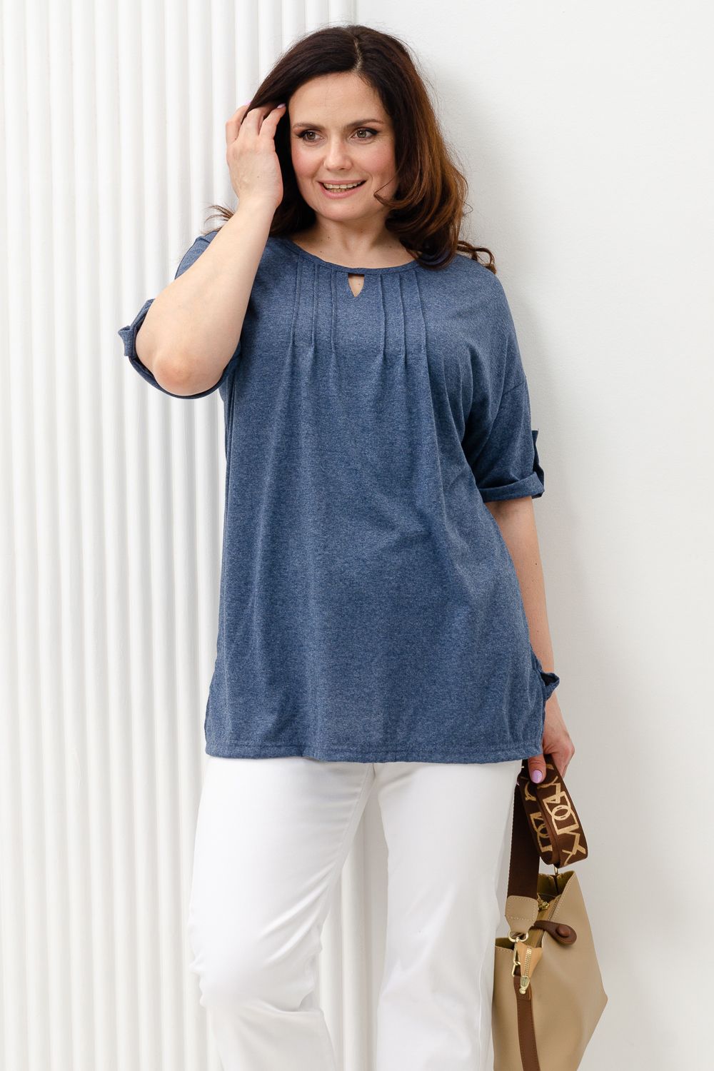 Туника прямая, свободная, с округлой горловиной, с удлиненной спинкой. Рукав короткий, с манжетом и хлястом с пуговицей. В верхней части полочки обработаны декоративные защипы. Спинка с кокеткой. В нижней части боковых швов расположены разрезы. Горловина обработана бейкой из основного полотна.