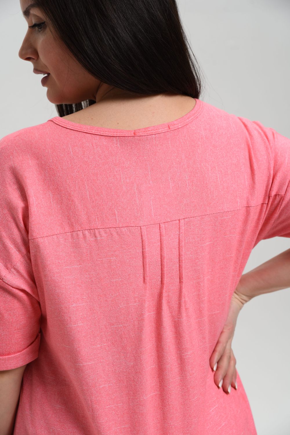 Туника прямая, свободная, с округлой горловиной, с удлиненной спинкой. Рукав короткий, с манжетом и хлястом с пуговицей. В верхней части полочки обработаны декоративные защипы. Спинка с кокеткой. В нижней части боковых швов расположены разрезы. Горловина обработана бейкой из основного полотна.