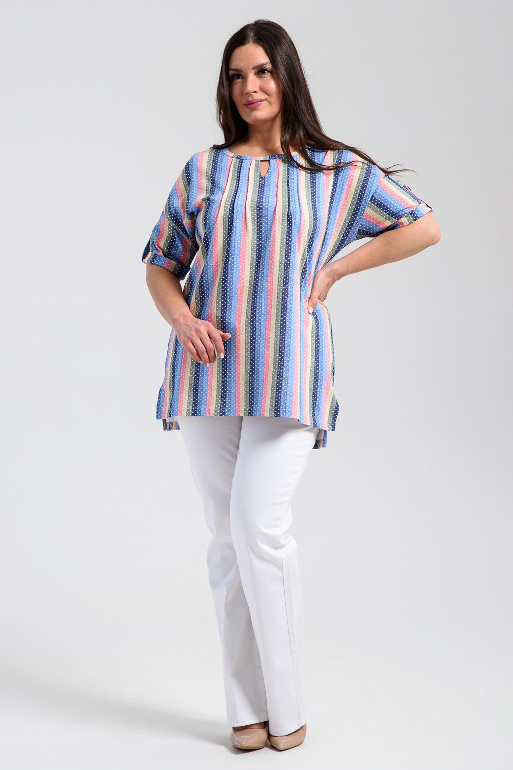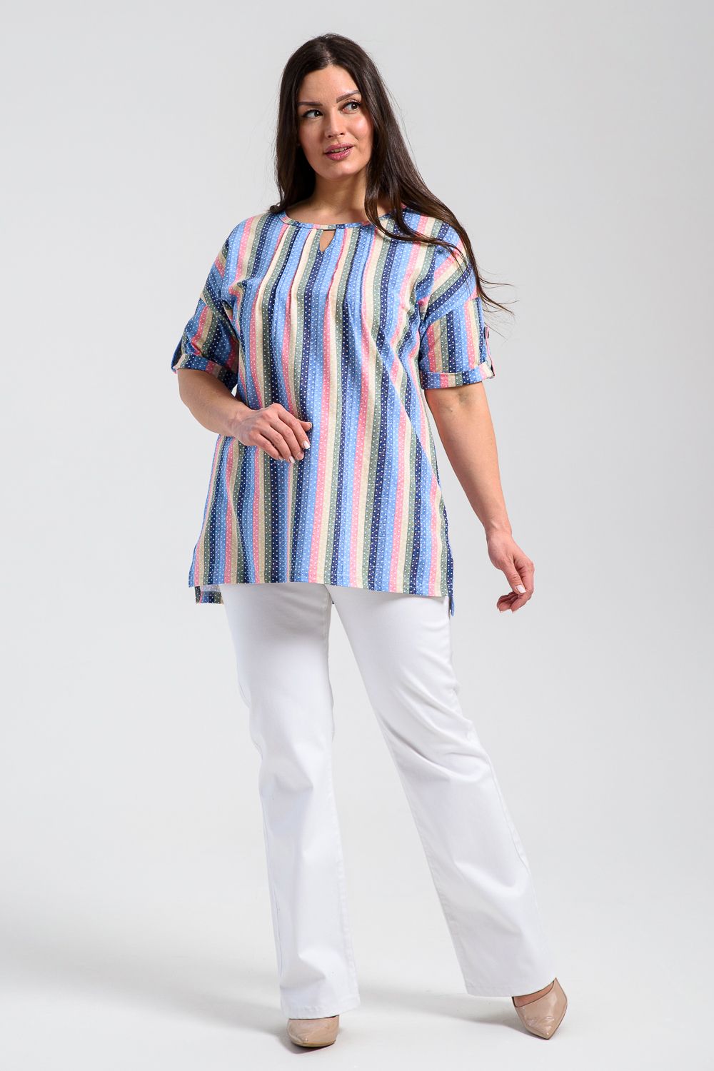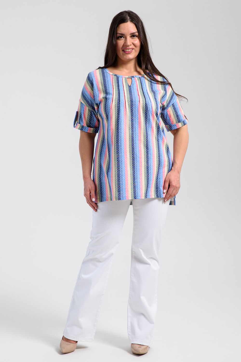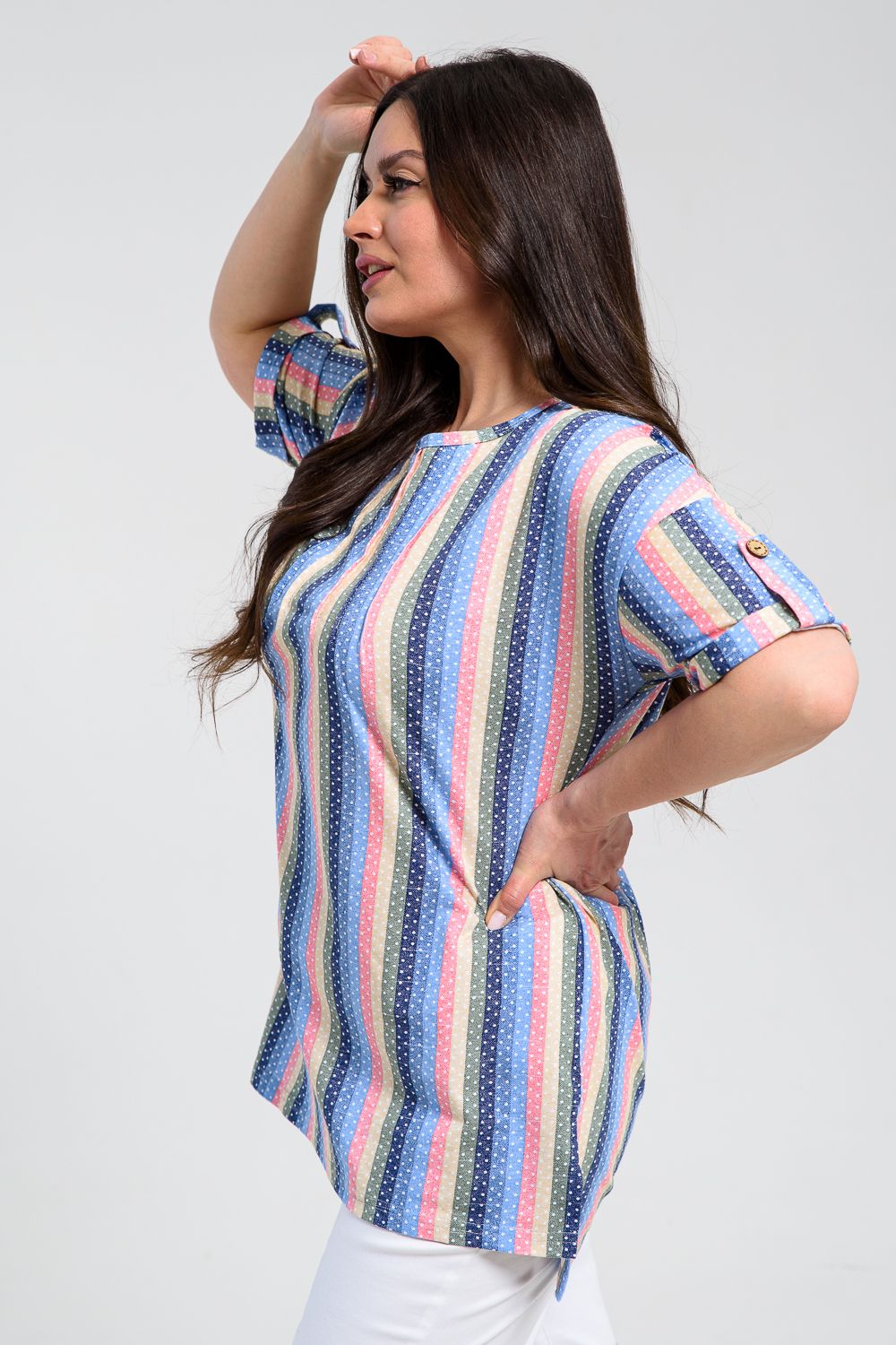 Туника прямая, свободная, с округлой горловиной, с удлиненной спинкой. Рукав короткий, с манжетом и хлястом с пуговицей. В верхней части полочки обработаны декоративные защипы. Спинка с кокеткой. В нижней части боковых швов расположены разрезы. Горловина обработана бейкой из основного полотна.