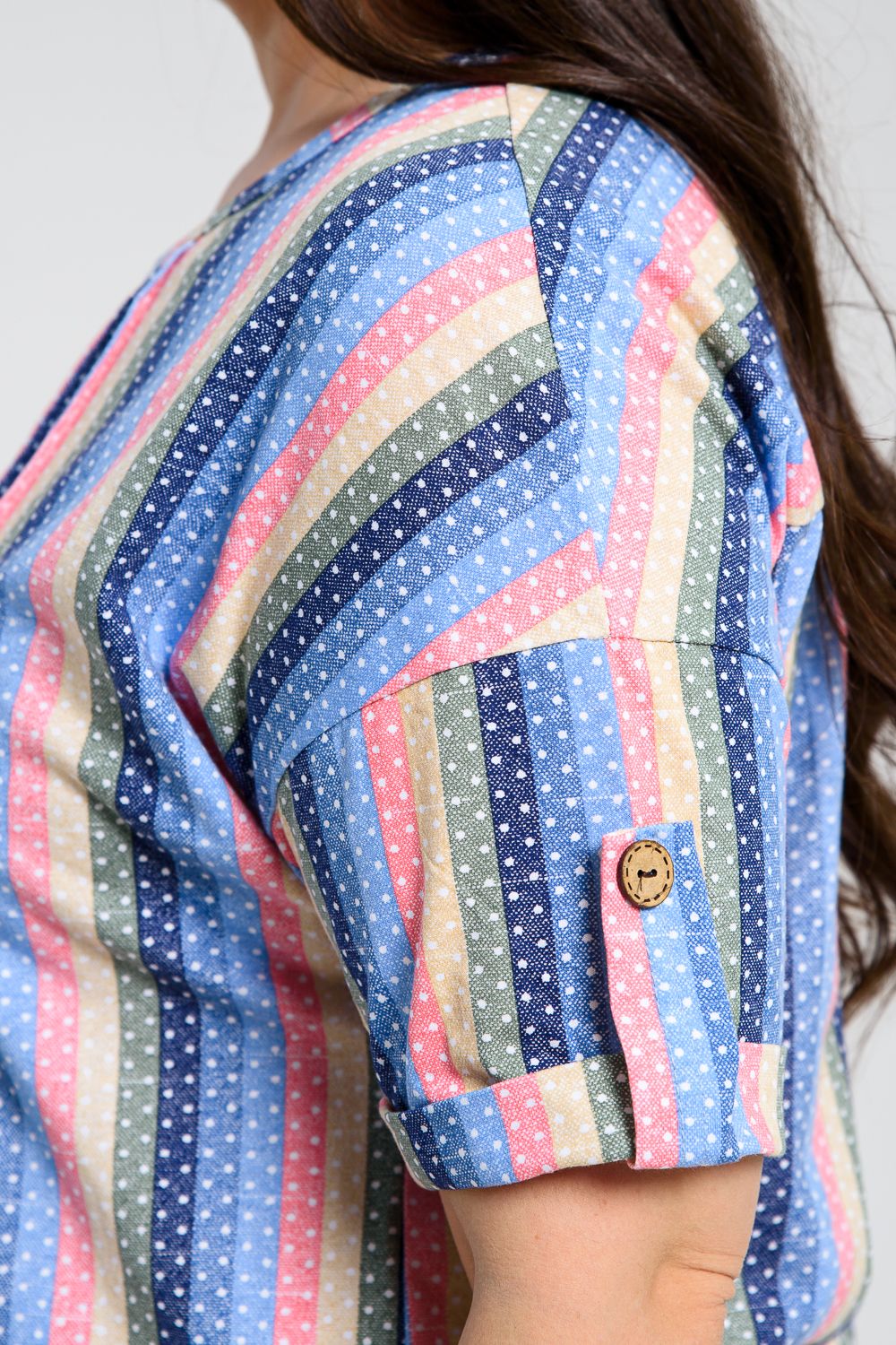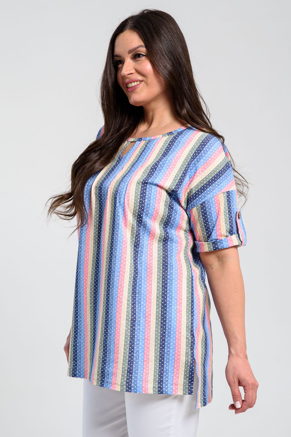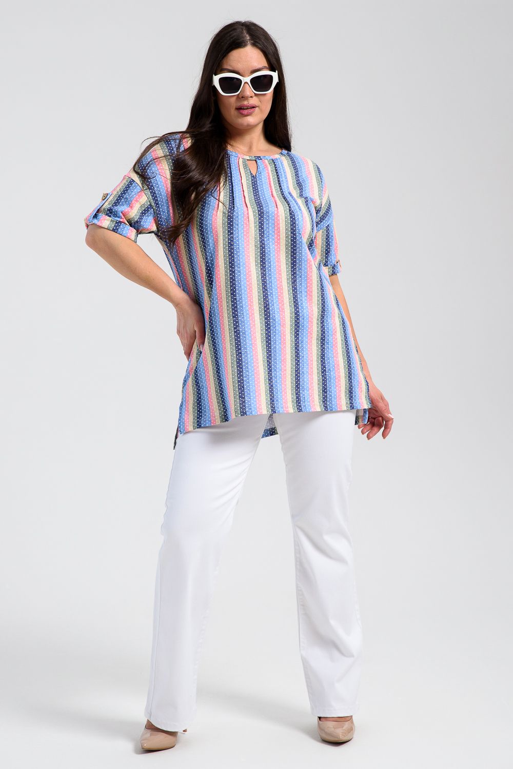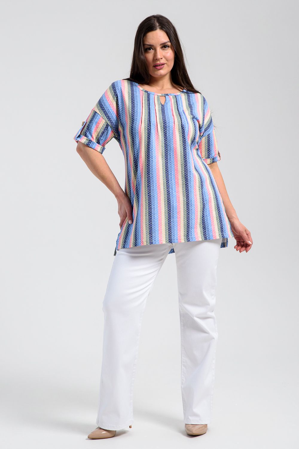 Туника прямая, свободная, с округлой горловиной, с удлиненной спинкой. Рукав короткий, с манжетом и хлястом с пуговицей. В верхней части полочки обработаны декоративные защипы. Спинка с кокеткой. В нижней части боковых швов расположены разрезы. Горловина обработана бейкой из основного полотна.