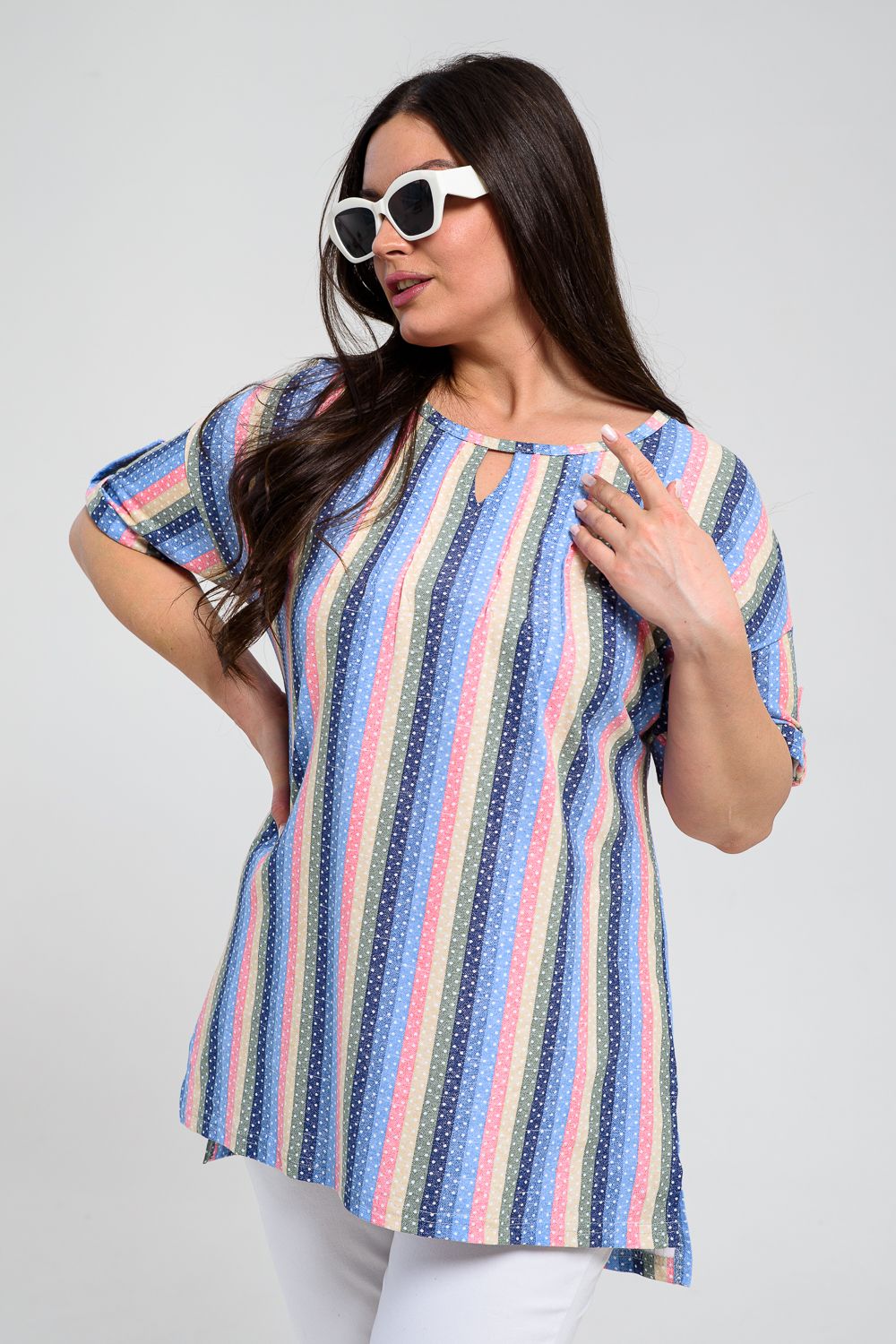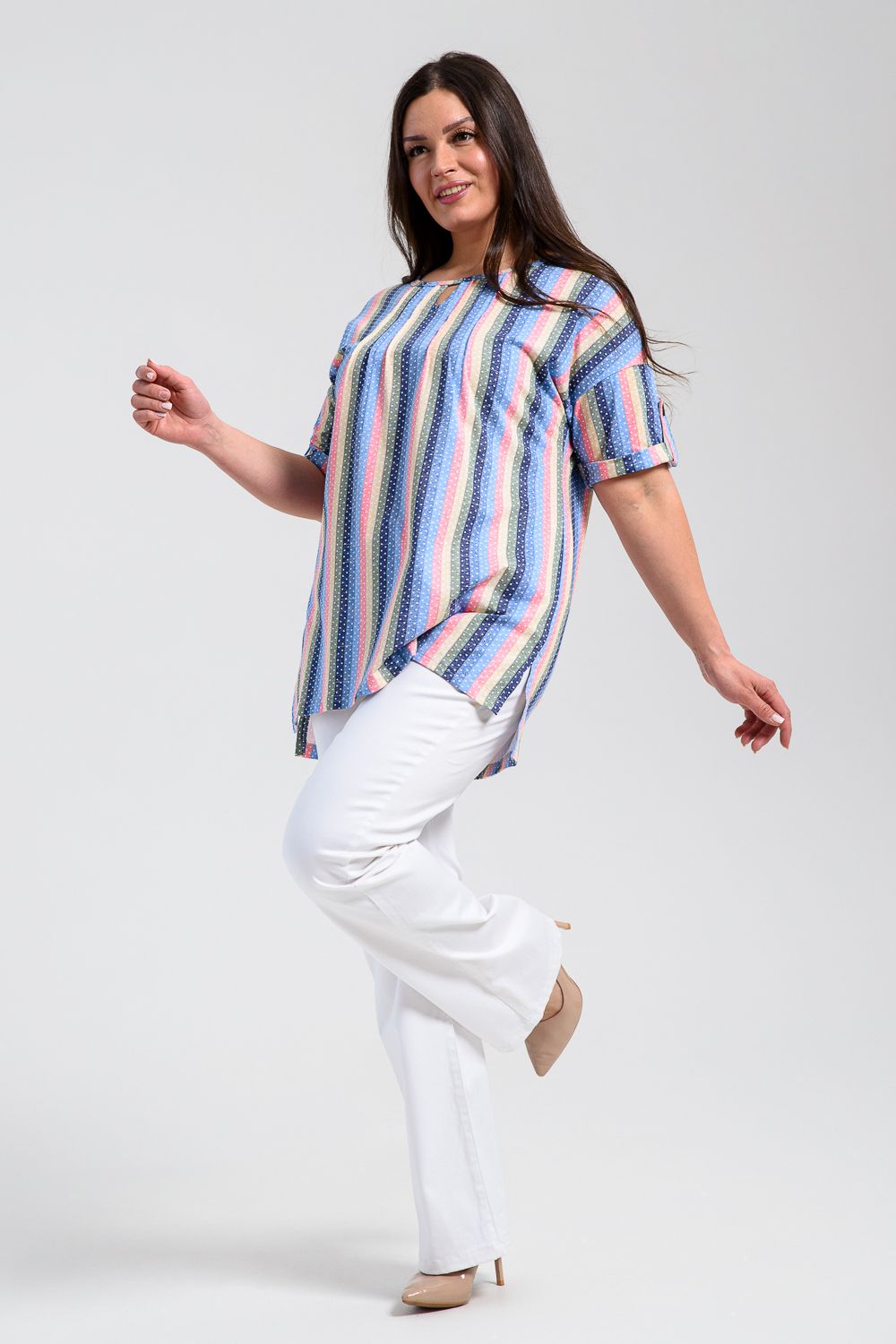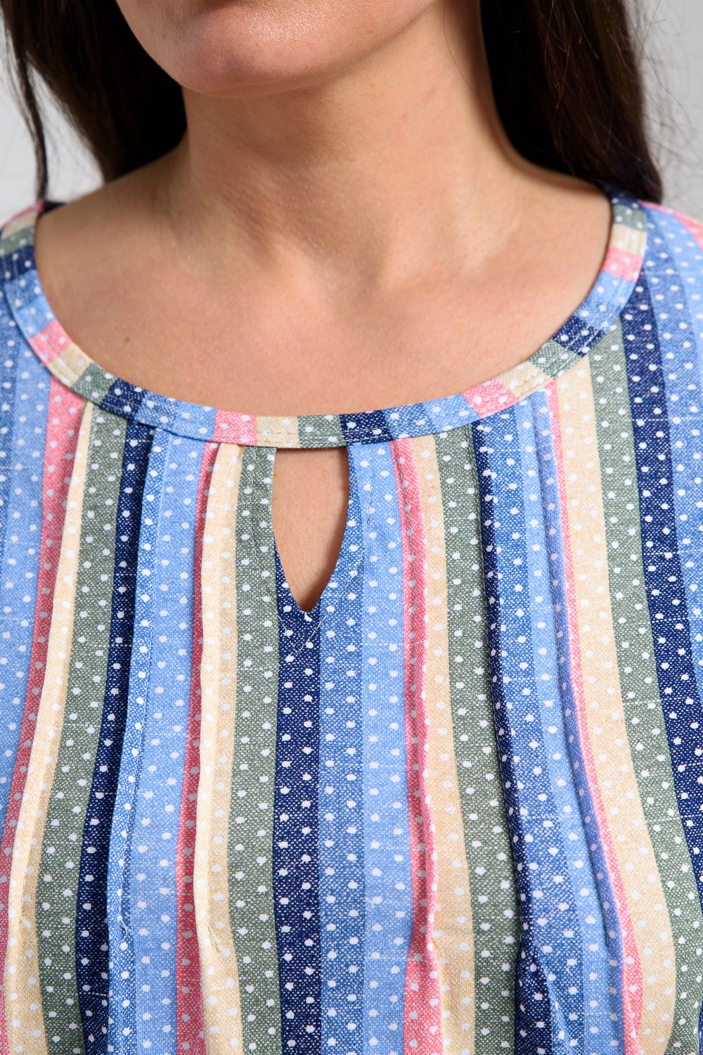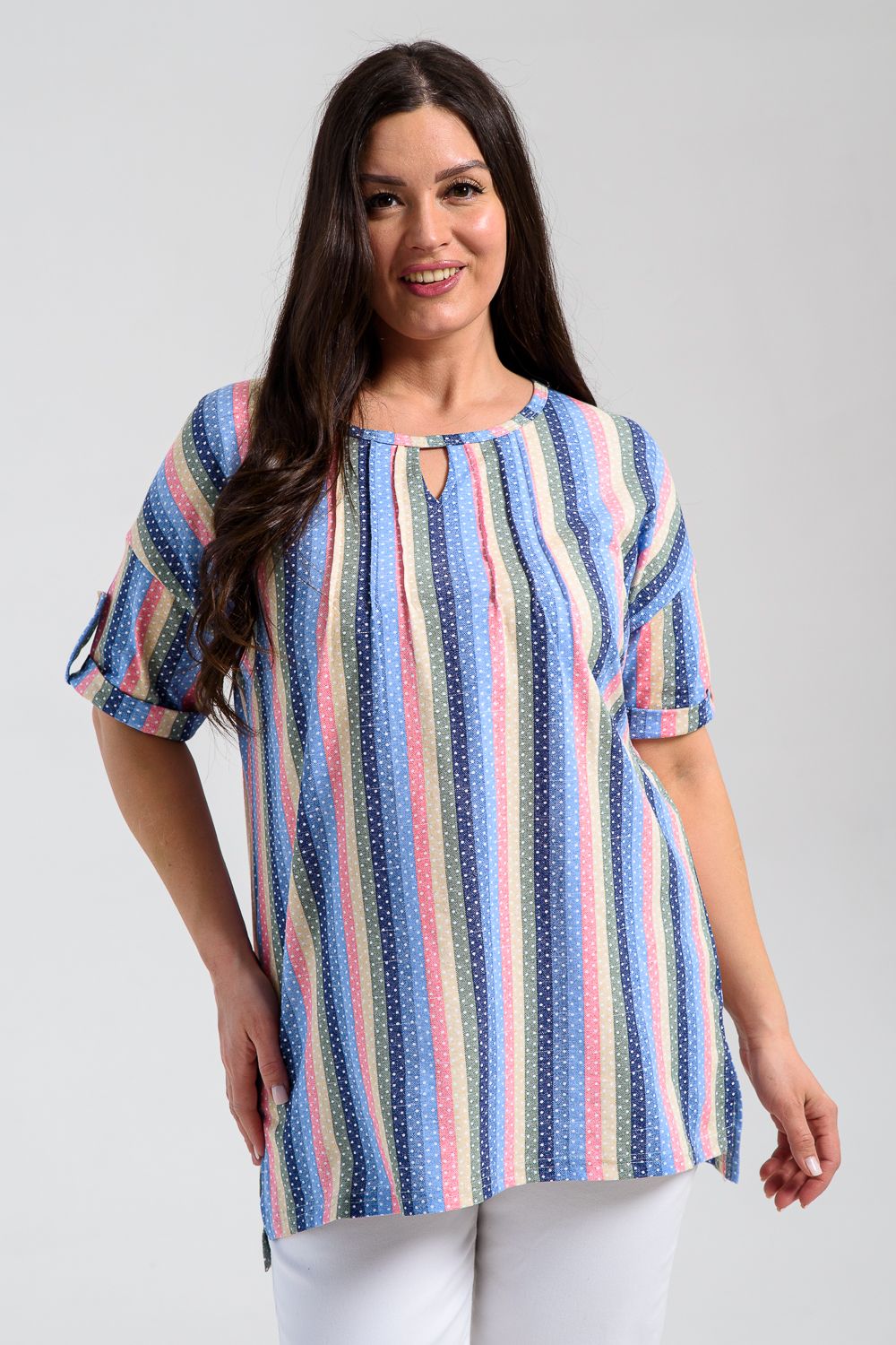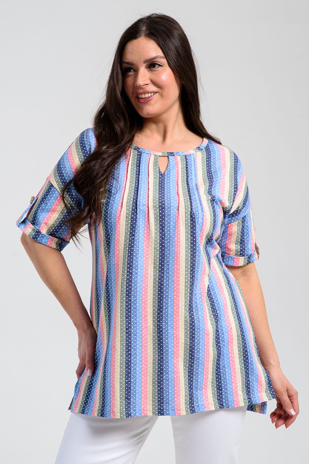 Туника прямая, свободная, с округлой горловиной, с удлиненной спинкой. Рукав короткий, с манжетом и хлястом с пуговицей. В верхней части полочки обработаны декоративные защипы. Спинка с кокеткой. В нижней части боковых швов расположены разрезы. Горловина обработана бейкой из основного полотна.