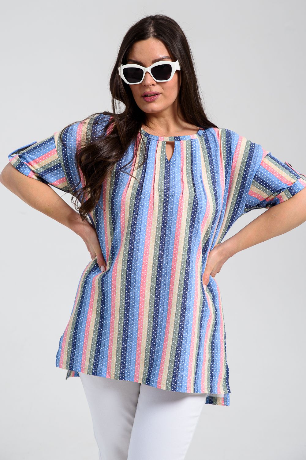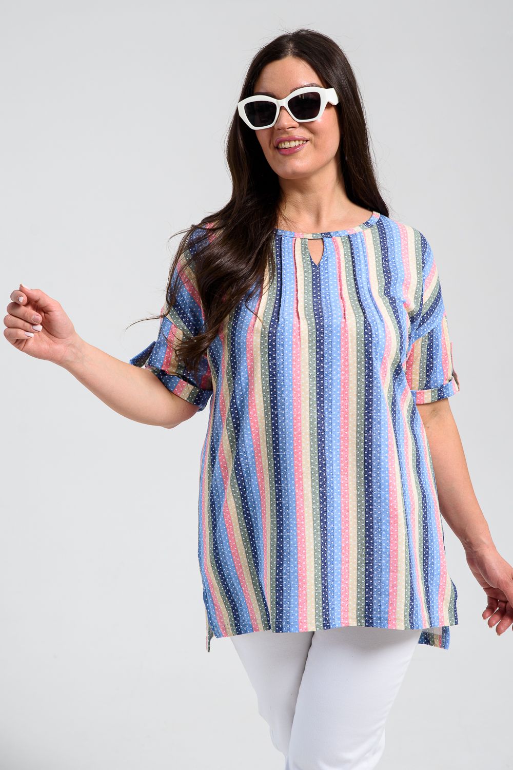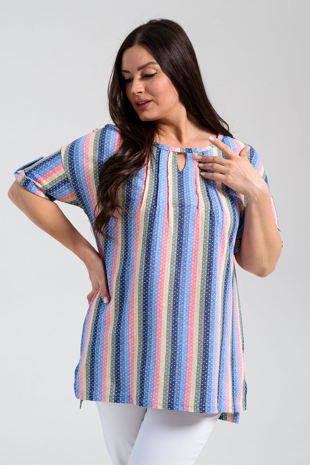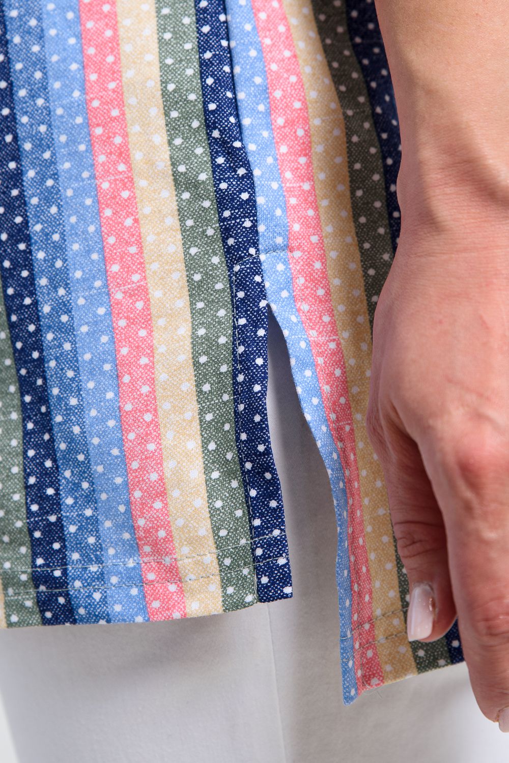 Туника прямая, свободная, с округлой горловиной, с удлиненной спинкой. Рукав короткий, с манжетом и хлястом с пуговицей. В верхней части полочки обработаны декоративные защипы. Спинка с кокеткой. В нижней части боковых швов расположены разрезы. Горловина обработана бейкой из основного полотна.