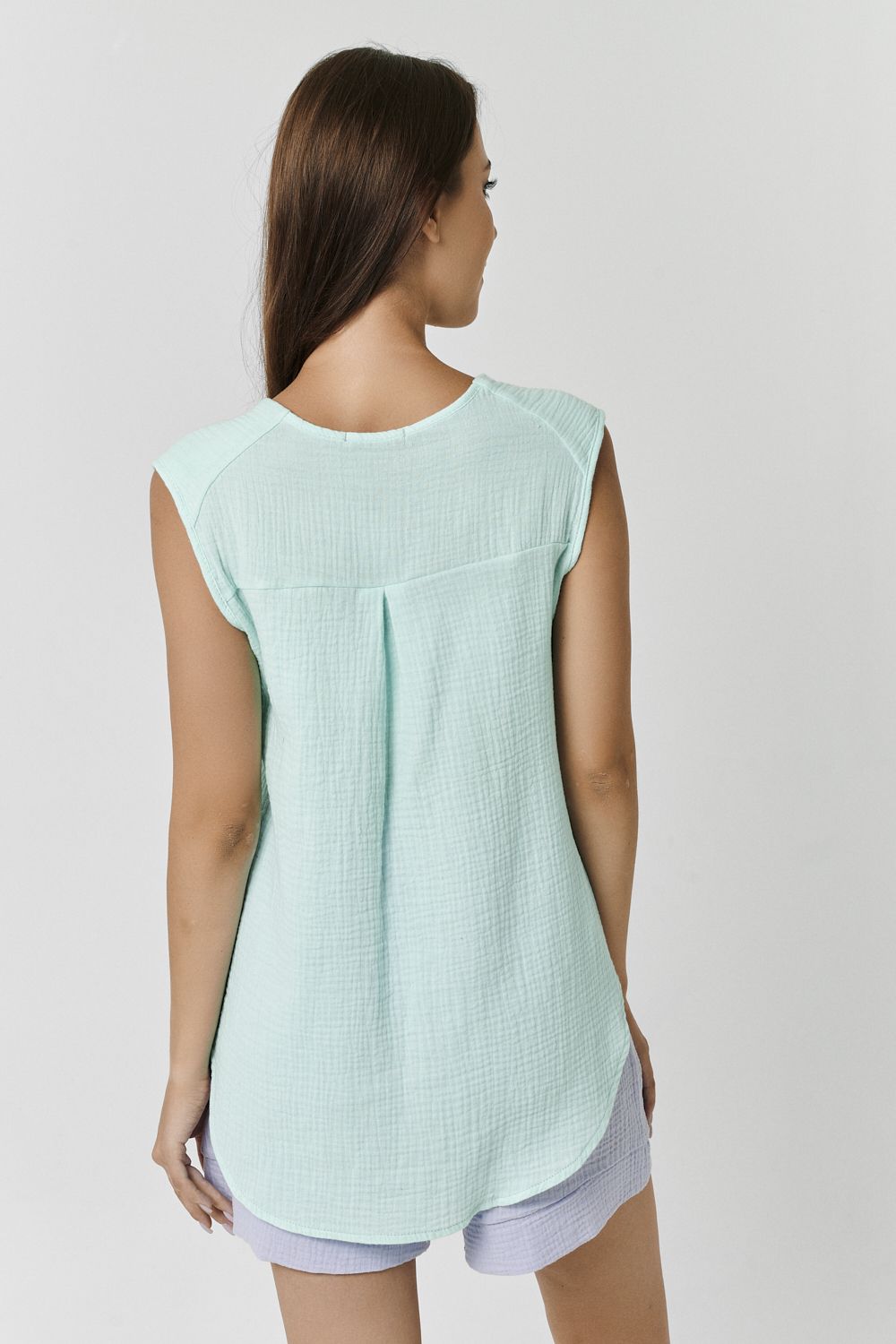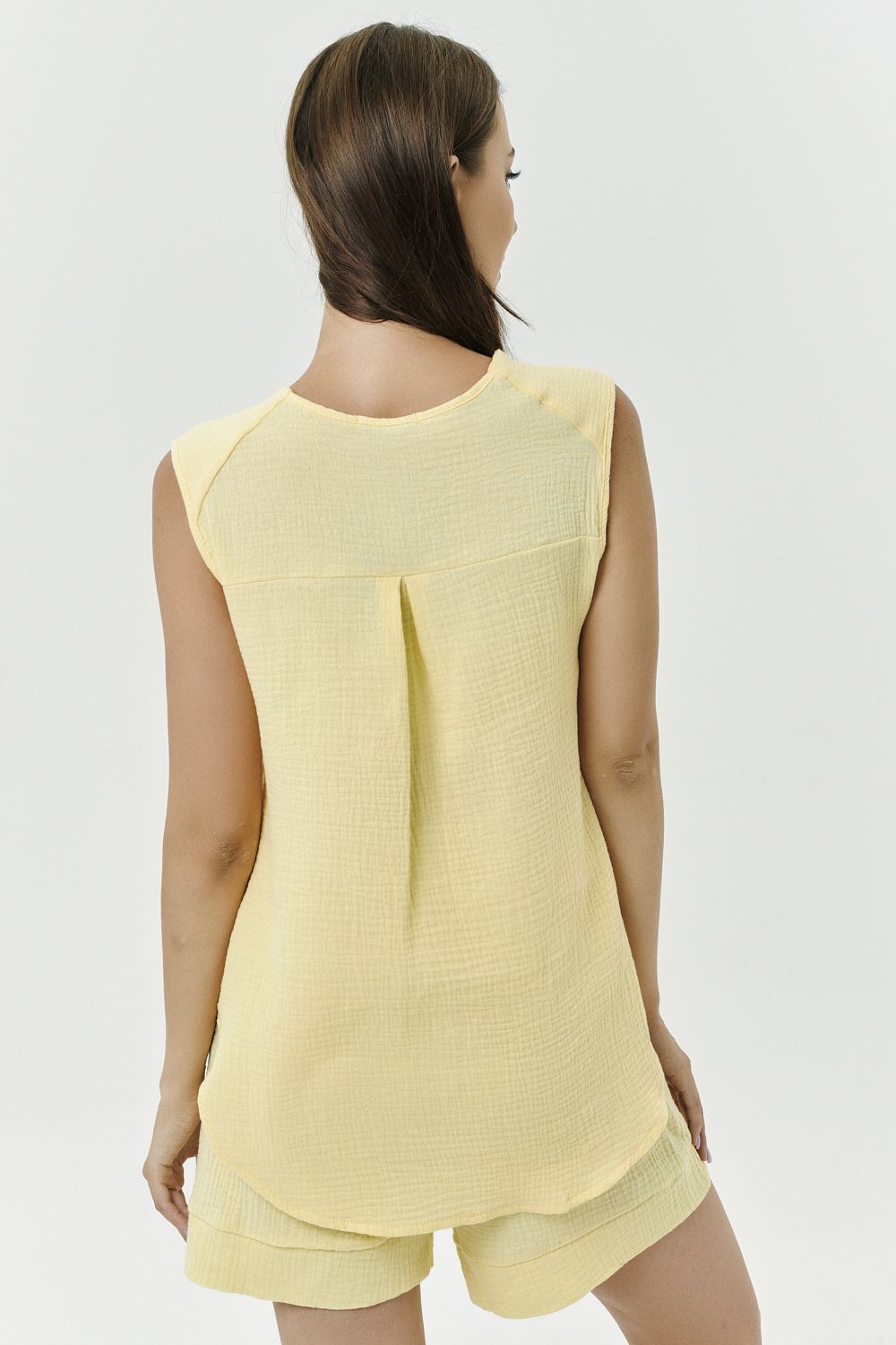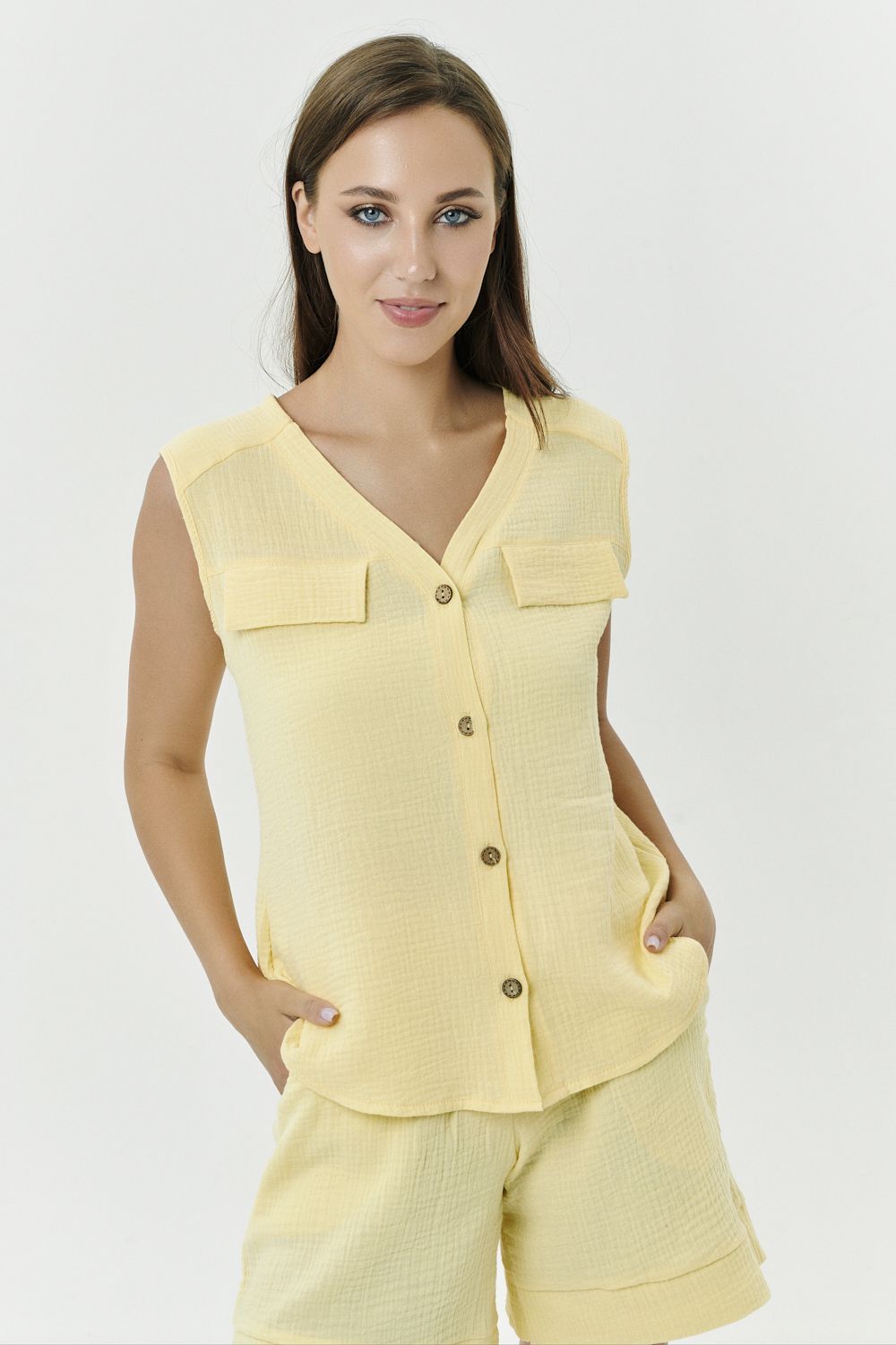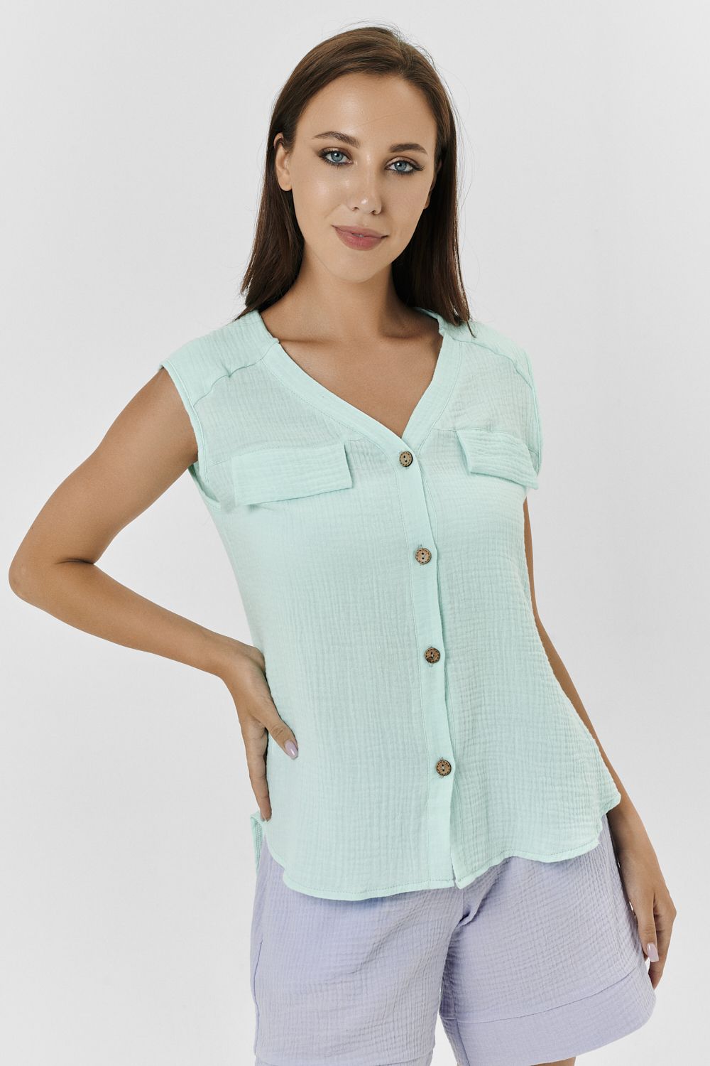 Женская туника-майка на пуговицах, без рукавов, свободная, с удлиненной спинкой и фигурной линией низа. По шву соединения кокеток с полочкой расположены декоративные клапаны. Спинка с кокеткой и складкой. Горловина спинки и проймы обработаны бейкой из основного полотна.