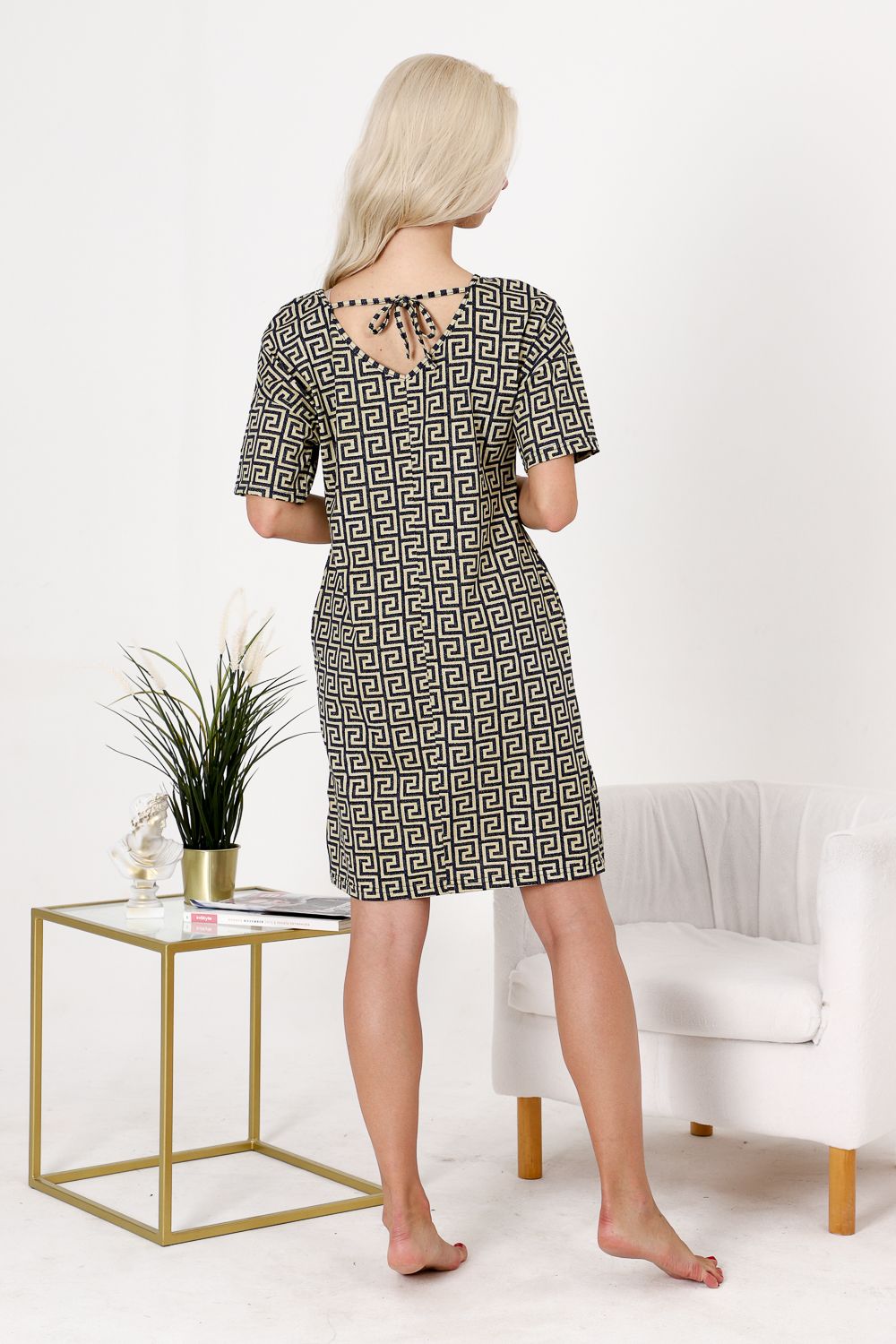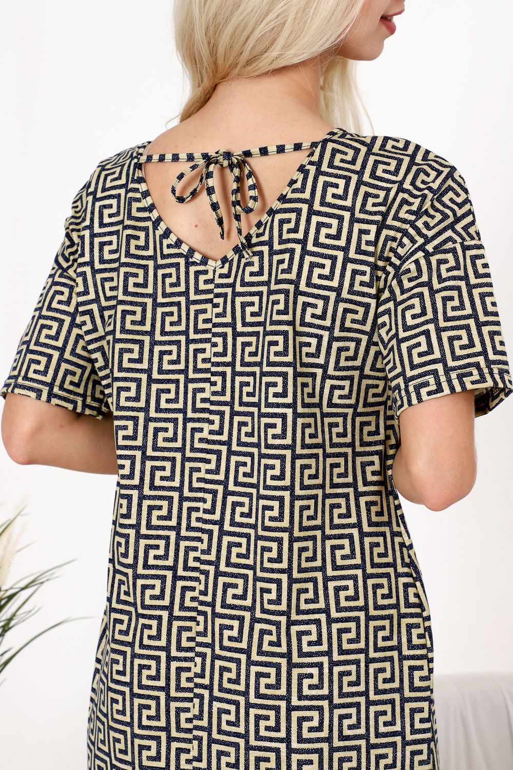 Туника прямого силуэта, с округлой горловиной, с разрезами в нижней части боковых швов. Рукав короткий. В верхней части спинки обработан фигурный вырез. Горловина обработана бейкой из основного полотна.