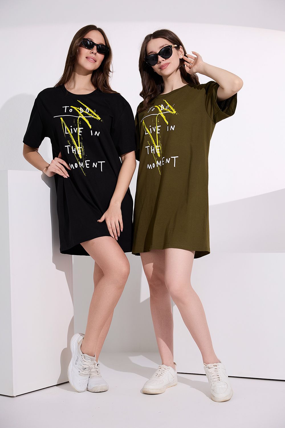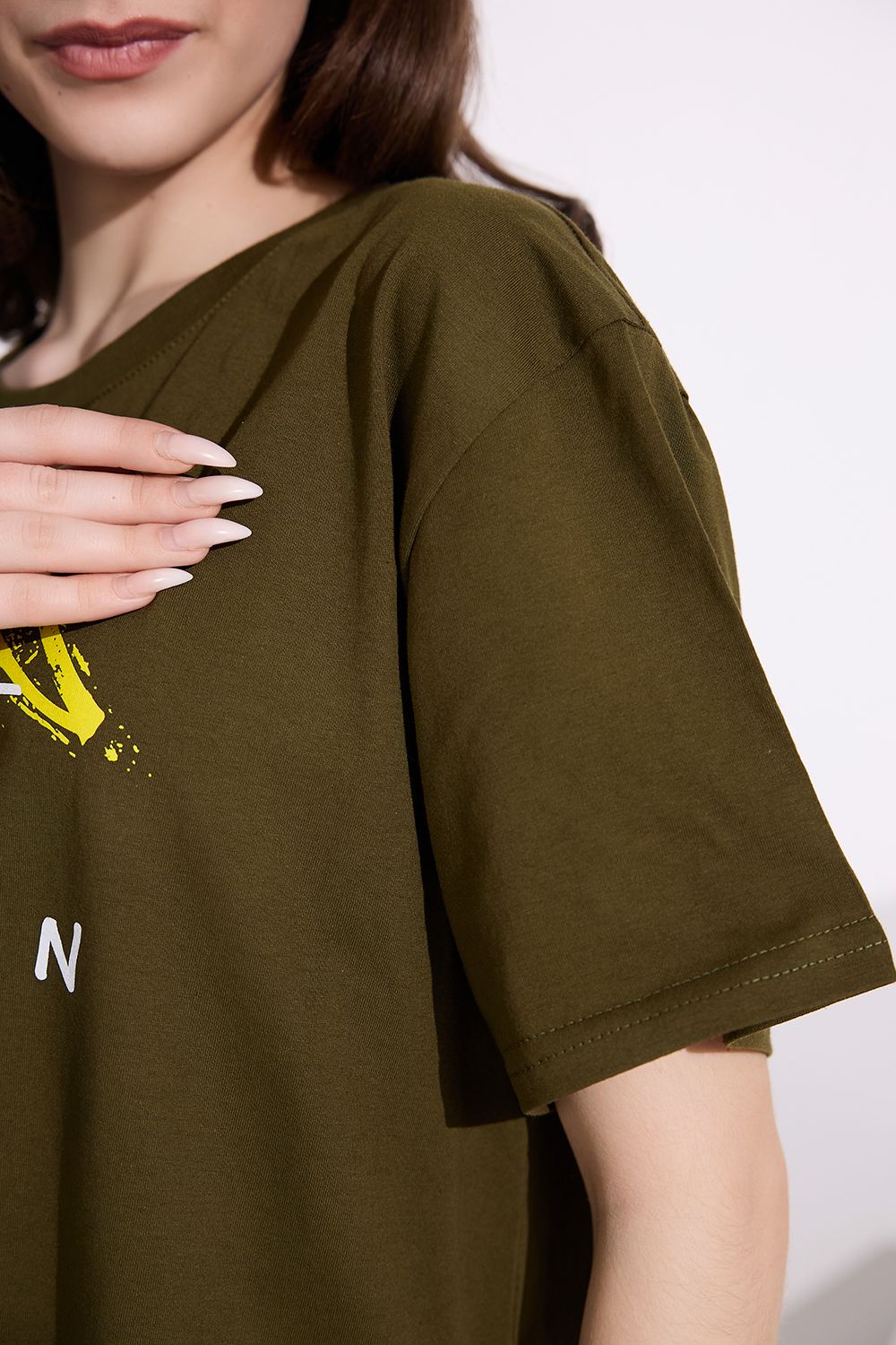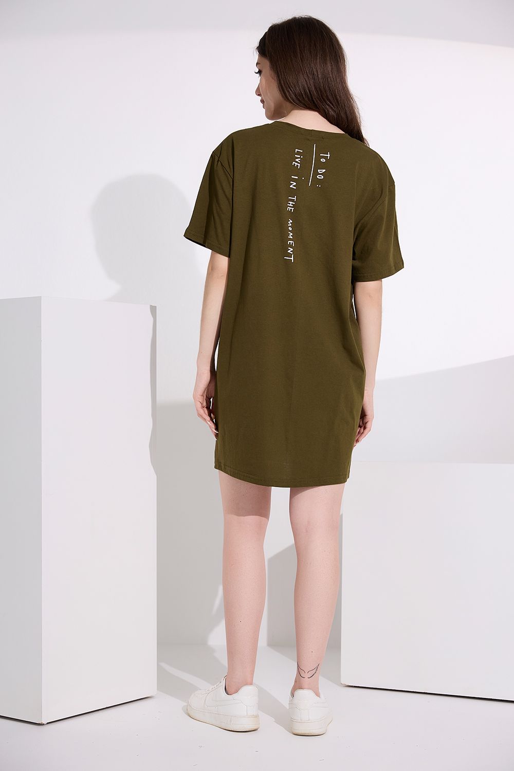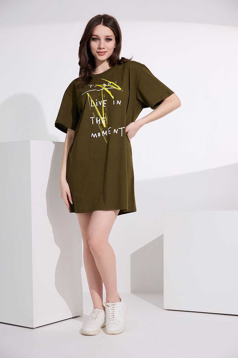 Туника - футболка в стиле "оверсайз". Прямая, свободная, длиной выше колена, с округлой горловиной. Рукав короткий. Горловина обработана обтачкой из основного полотна.