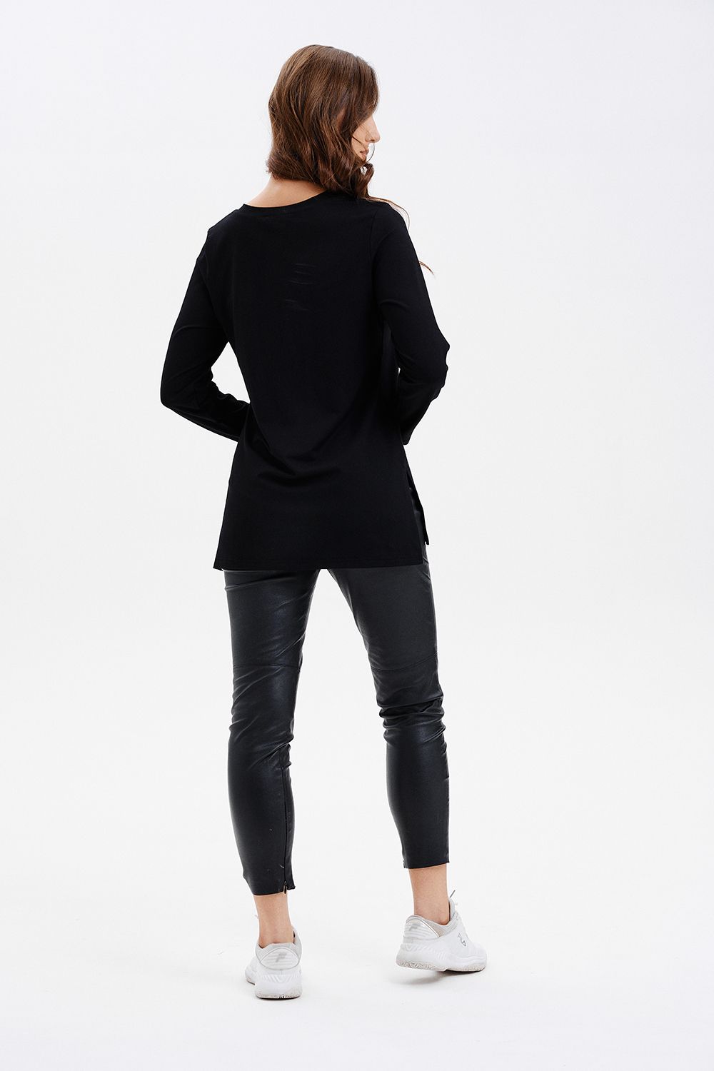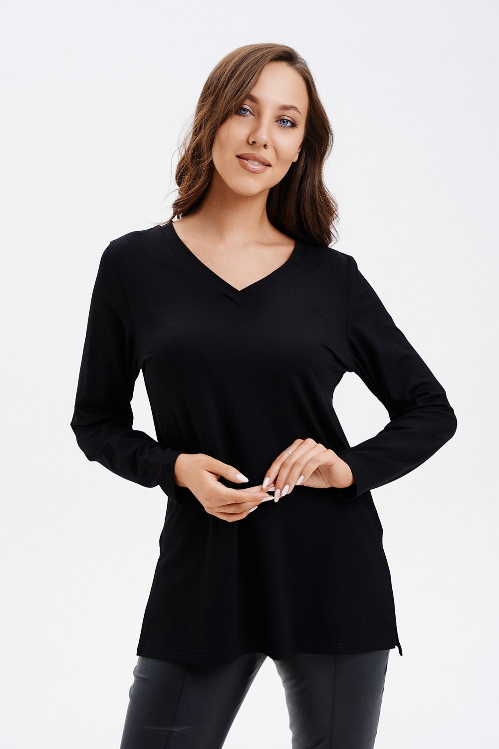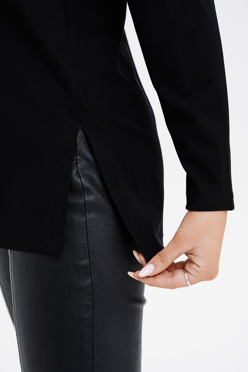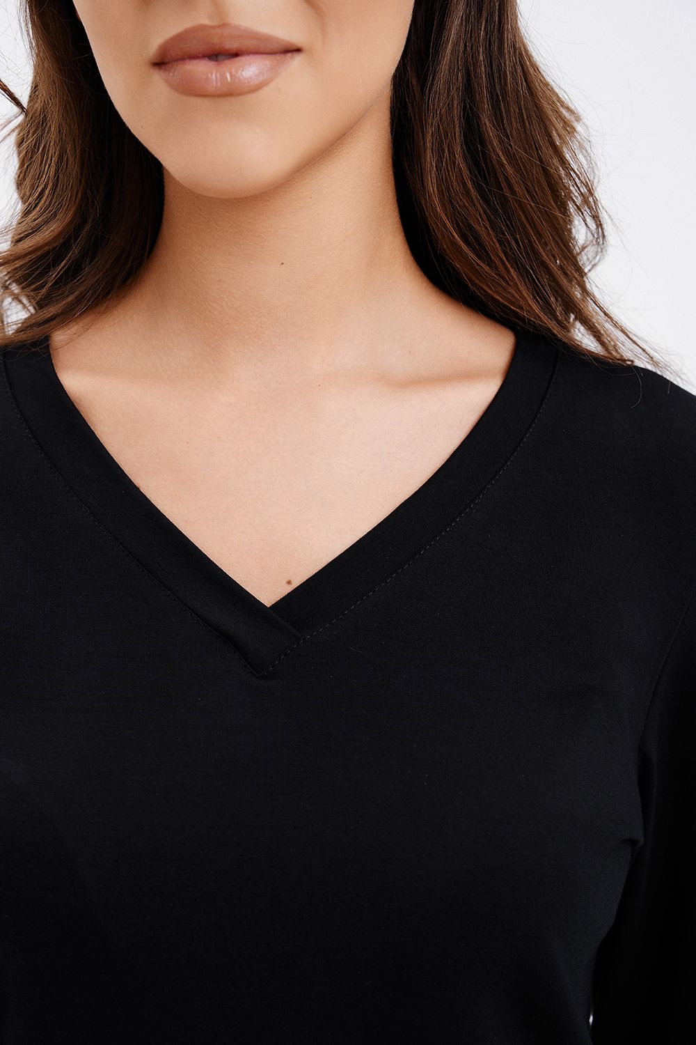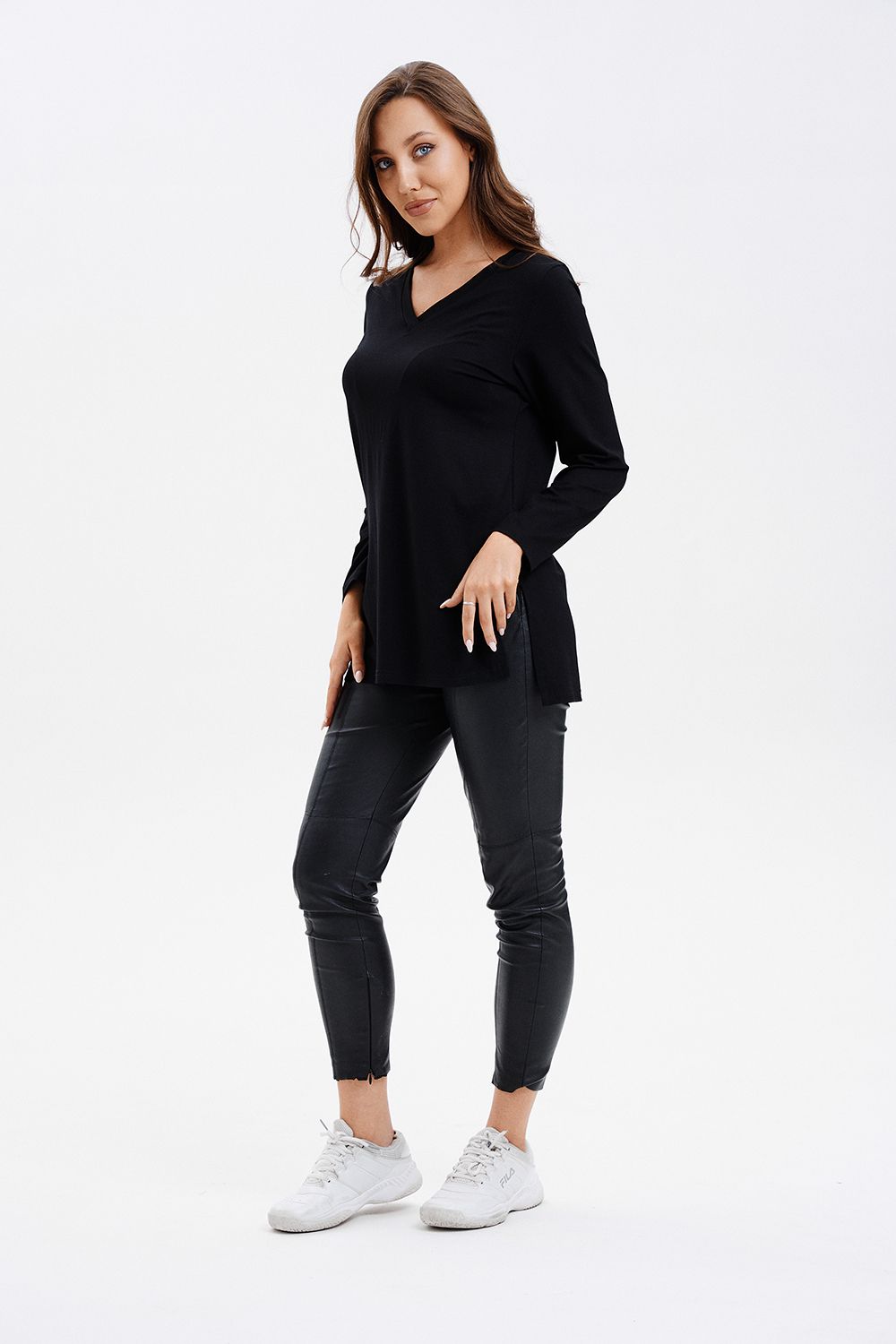 Туника прямого силуэта, с V-образной горловиной, с разрезами в нижней части боковых швов. Спинка удлиненная. Рукав втачной, длинный. Горловина обработана обтачкой из основного полотна.