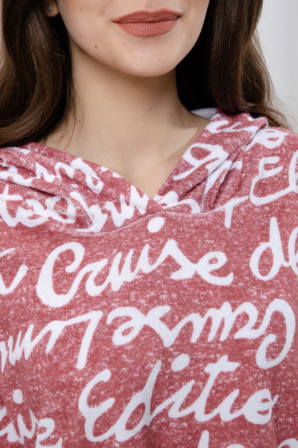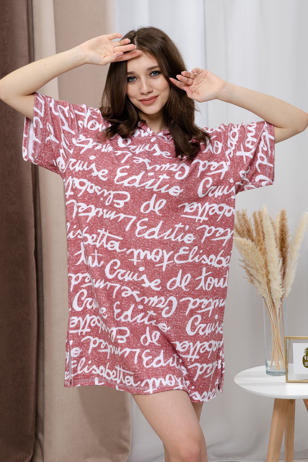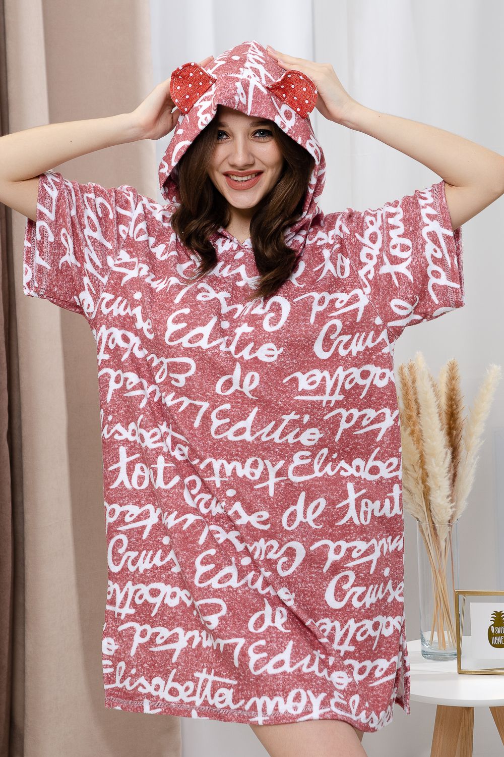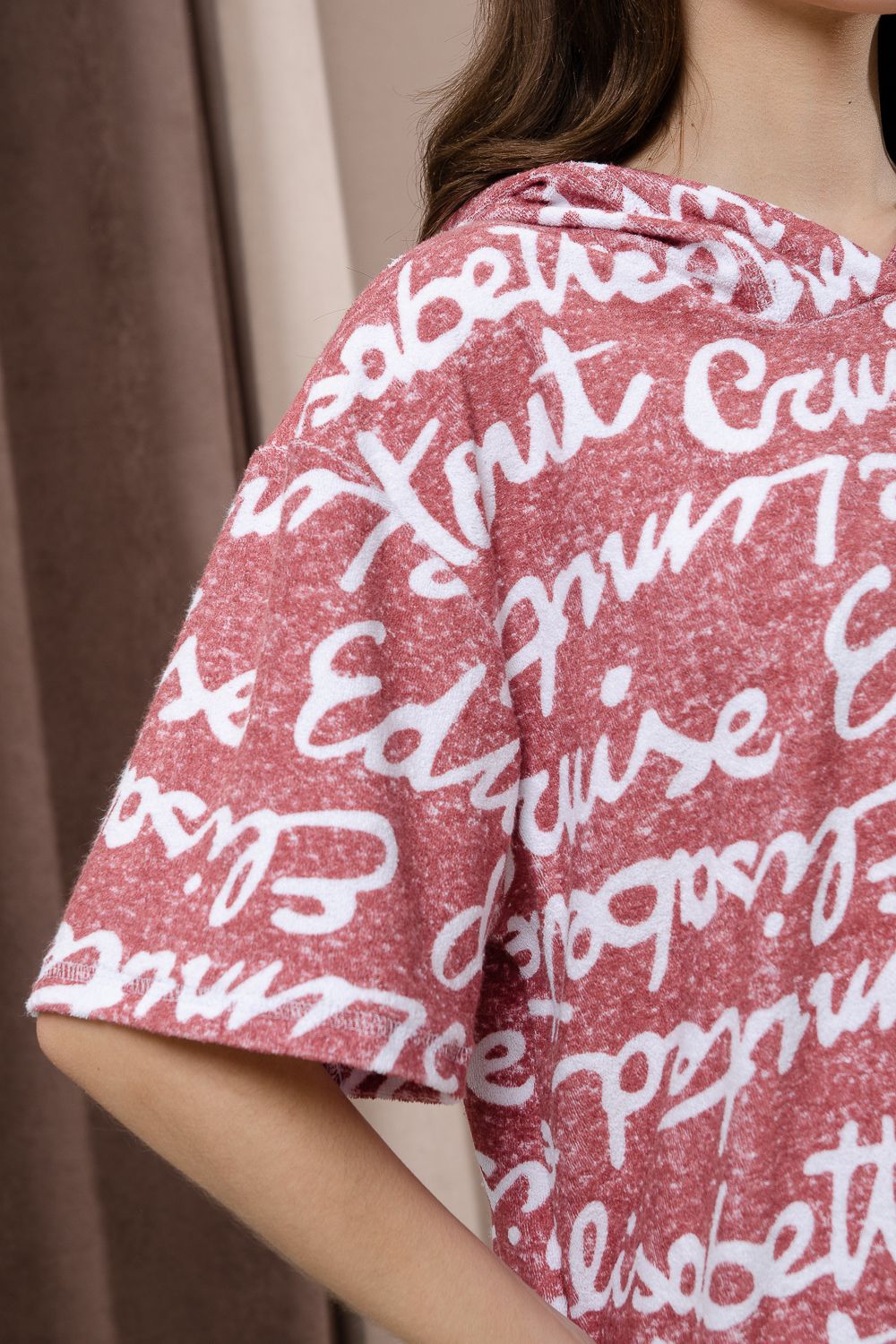 Туника в стиле "оверсайз". Прямая, свободная, длиной выше колена, с капюшоном. На капюшоне расположены "ушки". Рукав короткий. В нижней части боковых швов обработаны разрезы.