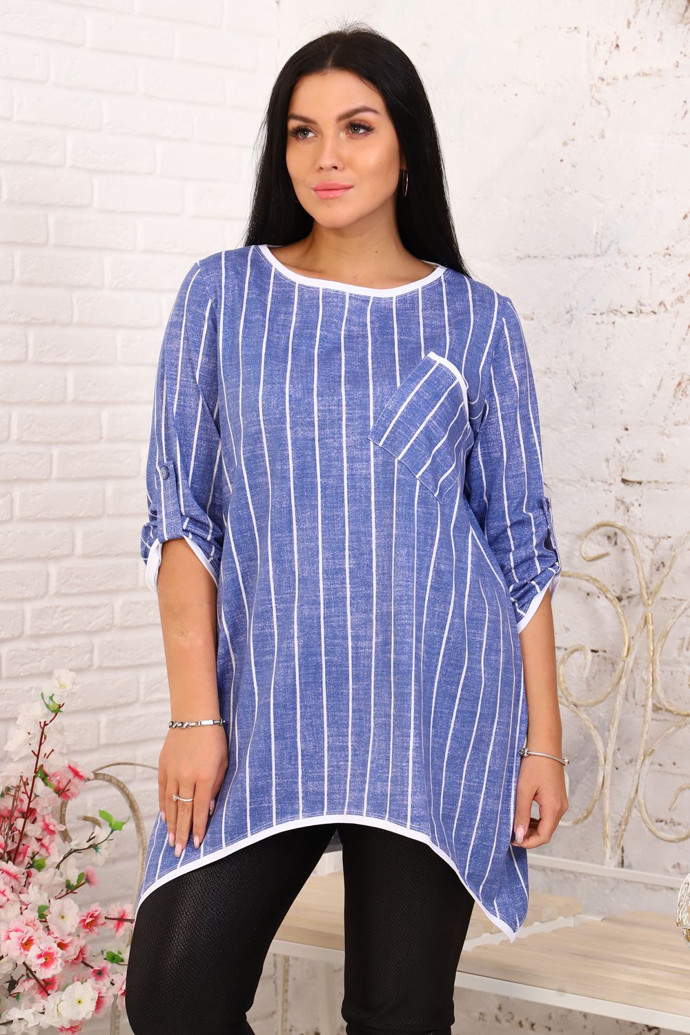 Туника женская прямого силуэта. Центральная часть полочки из ткани в мелкую полоску. Вырез Y-образный, рукав цельнокроенный, короткий. На полочке два накладных кармана: нагрудный и боковой. Каждый карман состоит из двух частей: основной и белой сетки, манжета рукава также из сетки. Тесьма на карманах задает тунике особый стиль, популярный в этом сезоне.