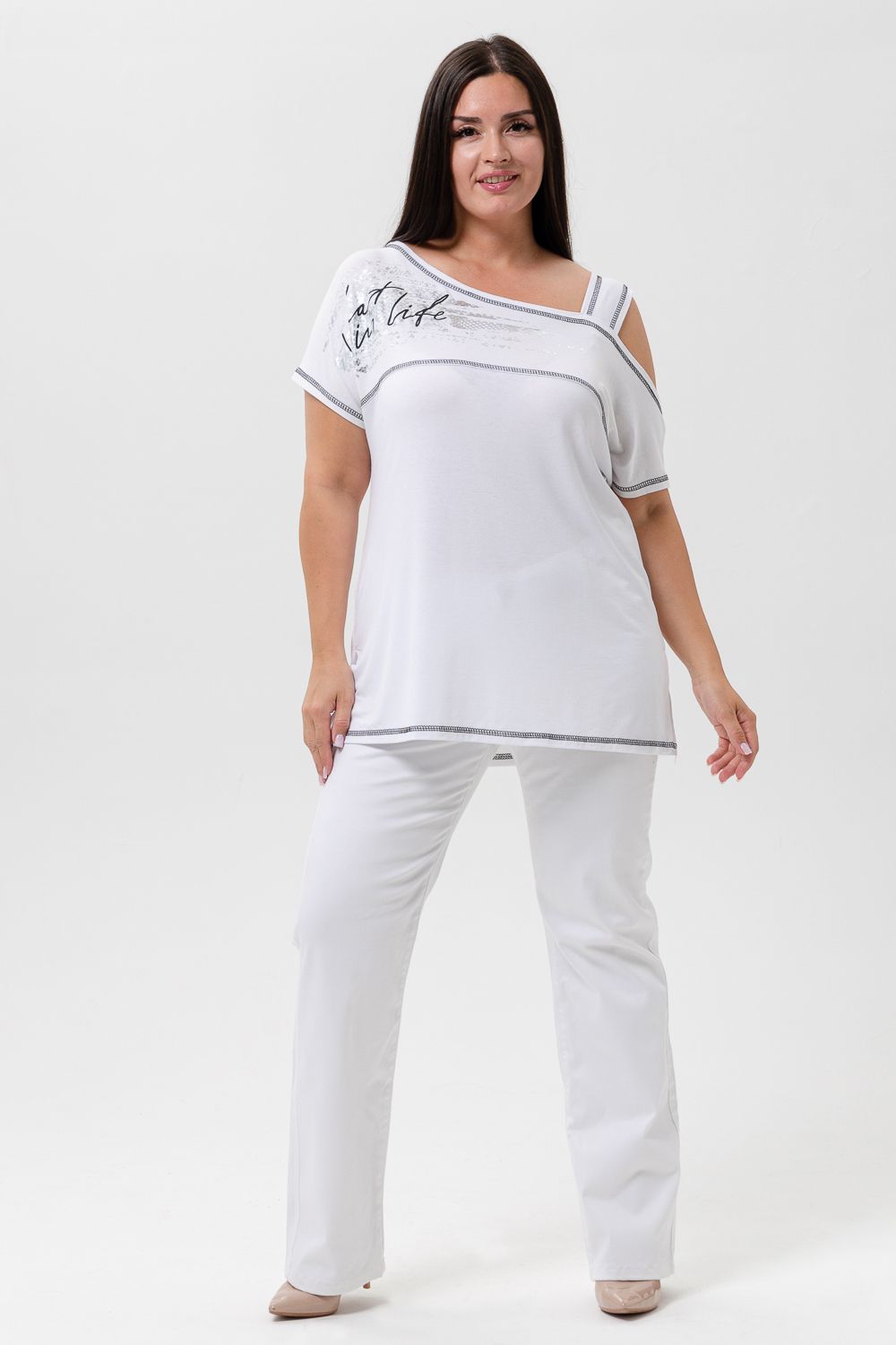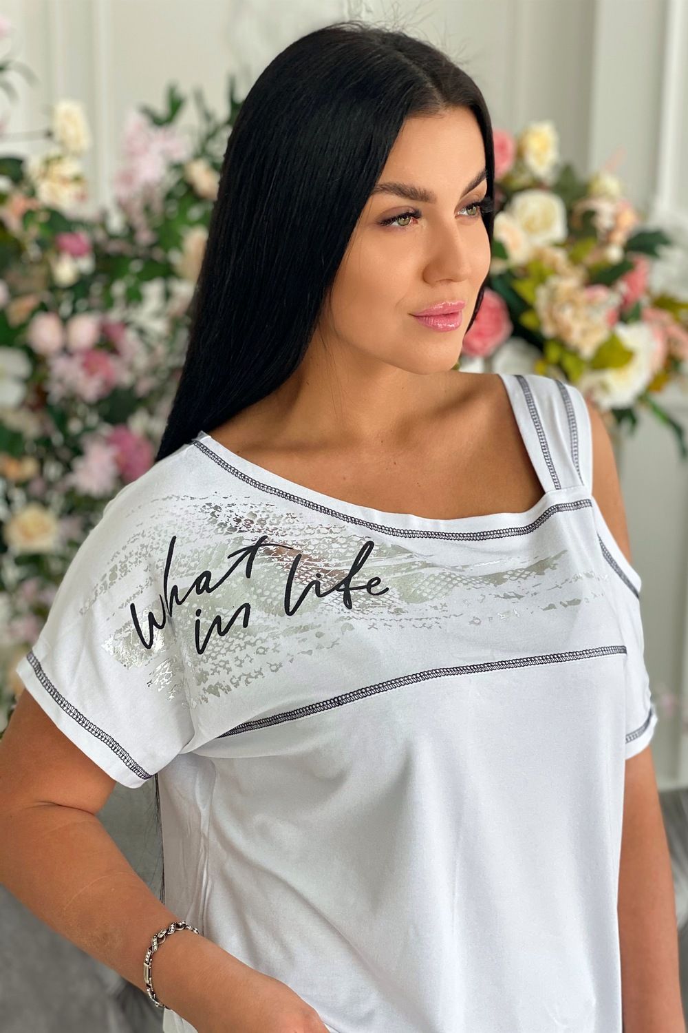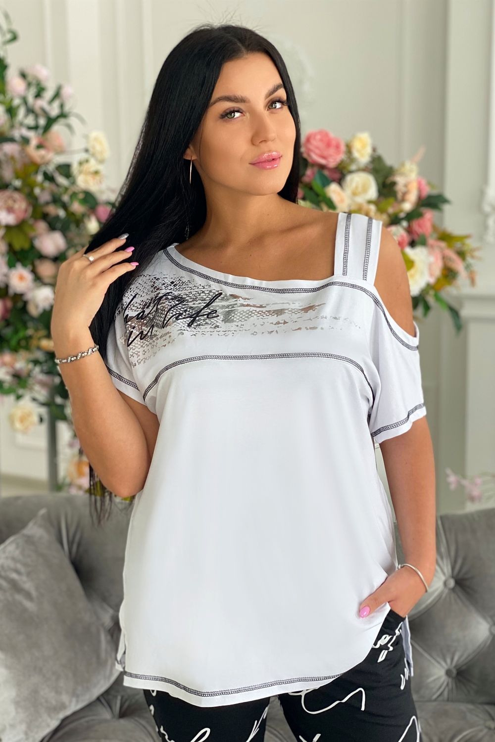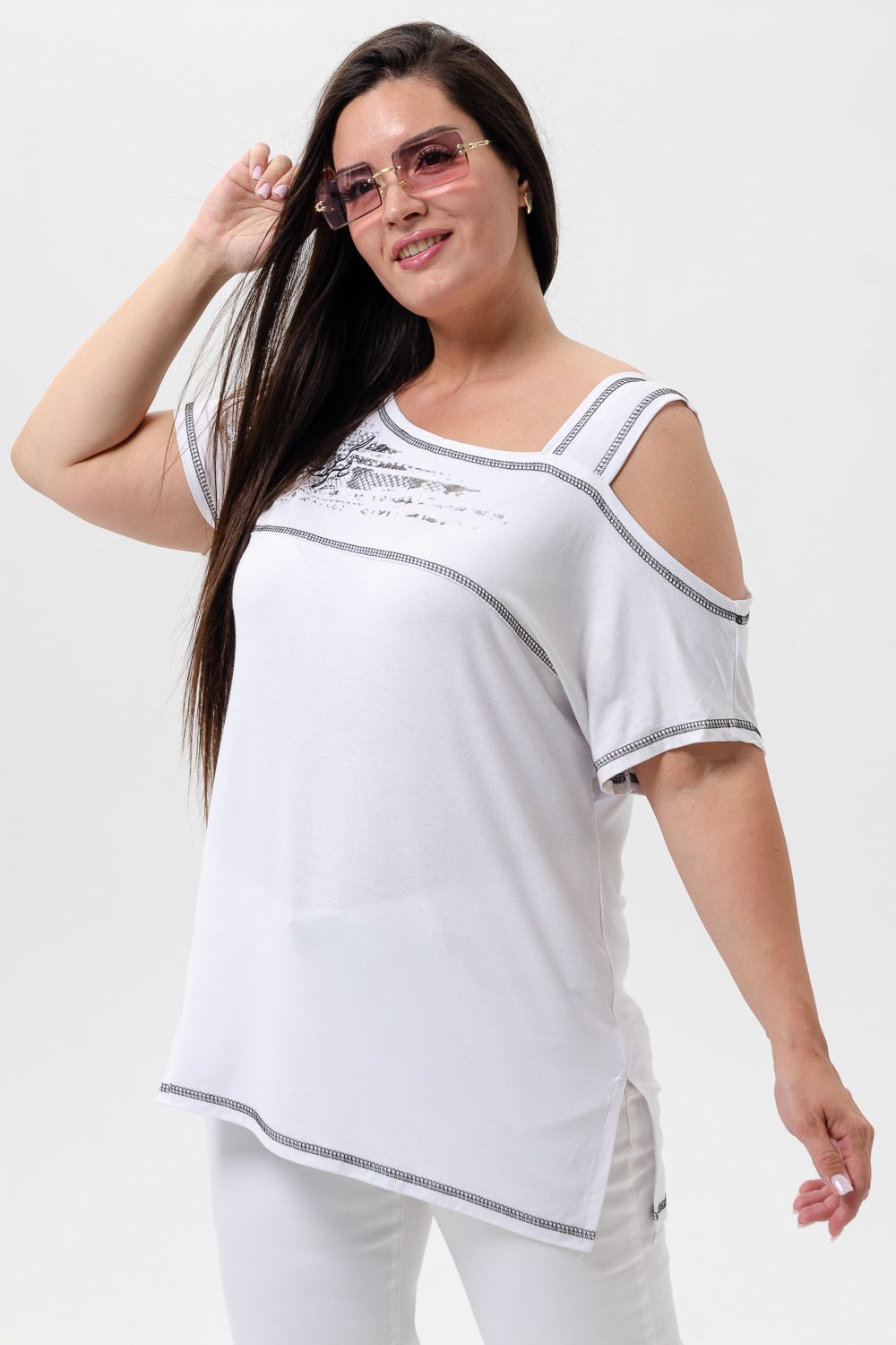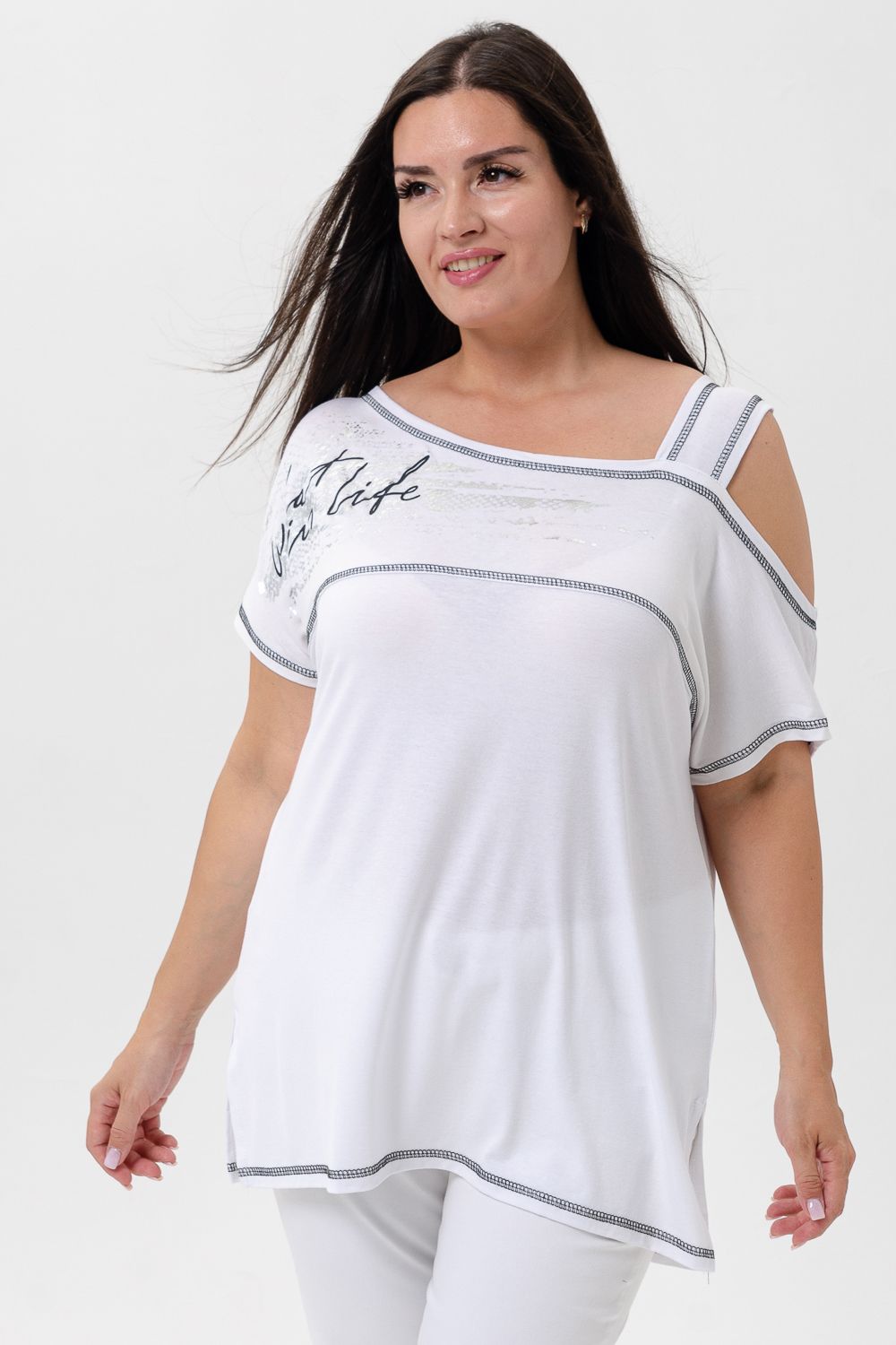Туника женская полуприлегающего силуэта. Рукав цельнокроенный короткий, с одной стороны бретель на плече, в боковых швах разрезы. В верхней части полочки модный принт.