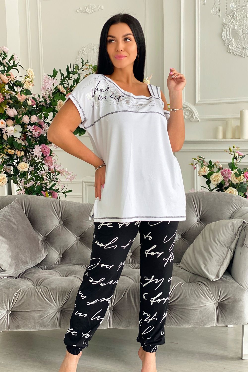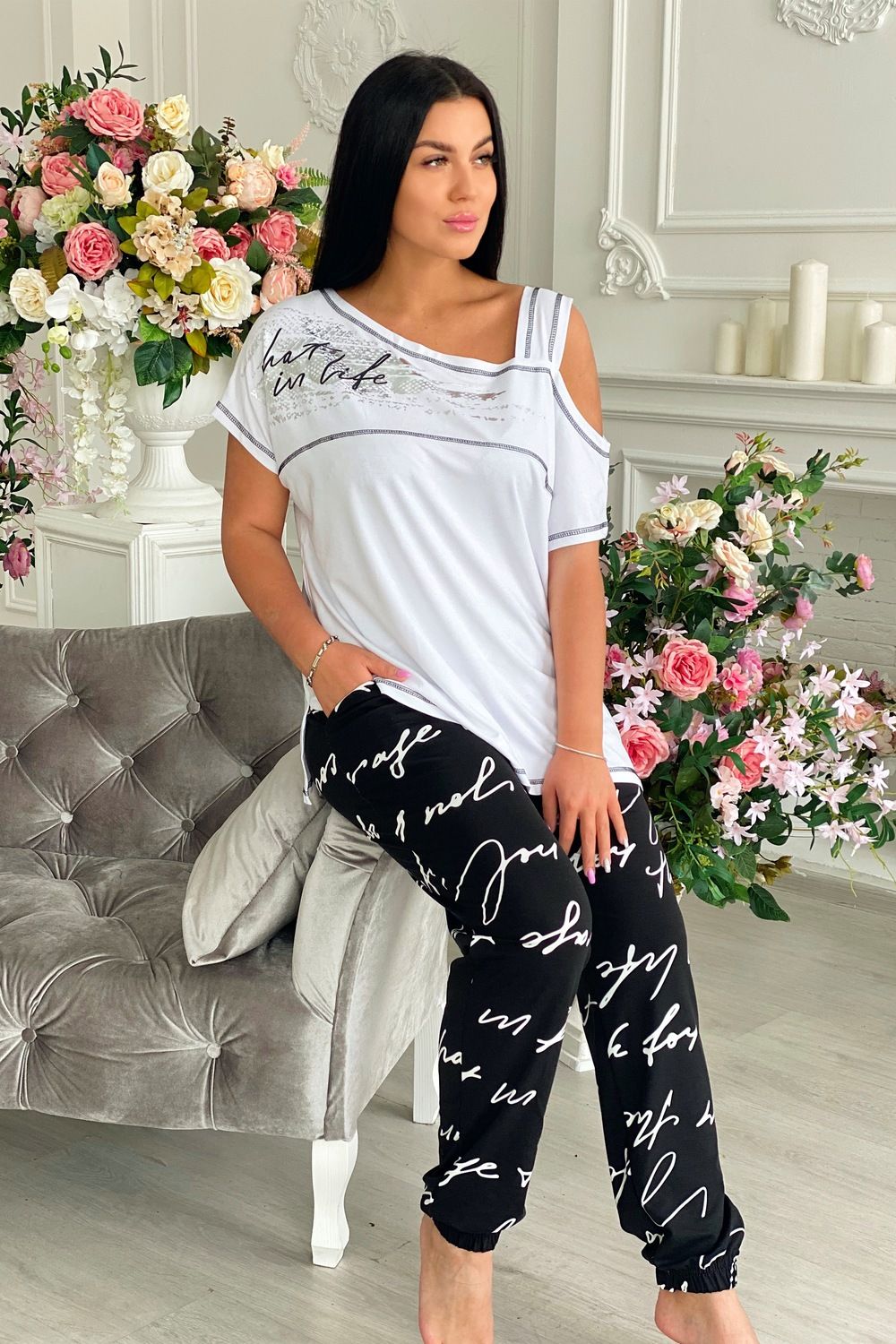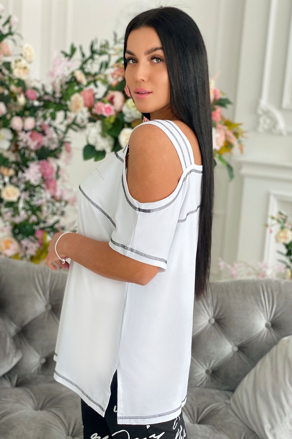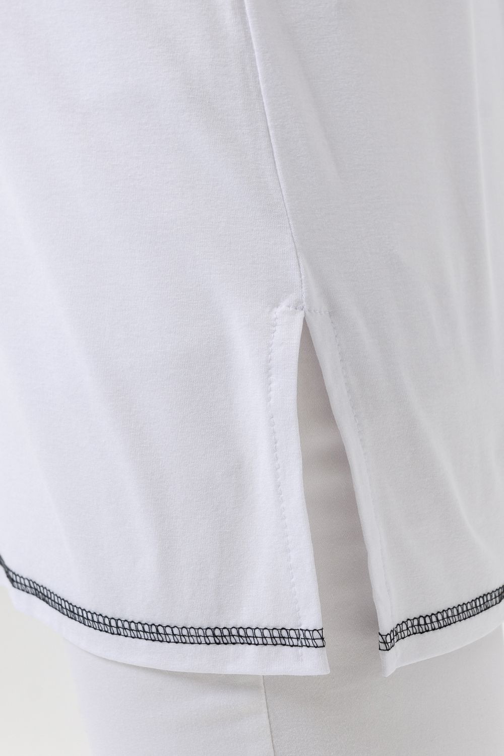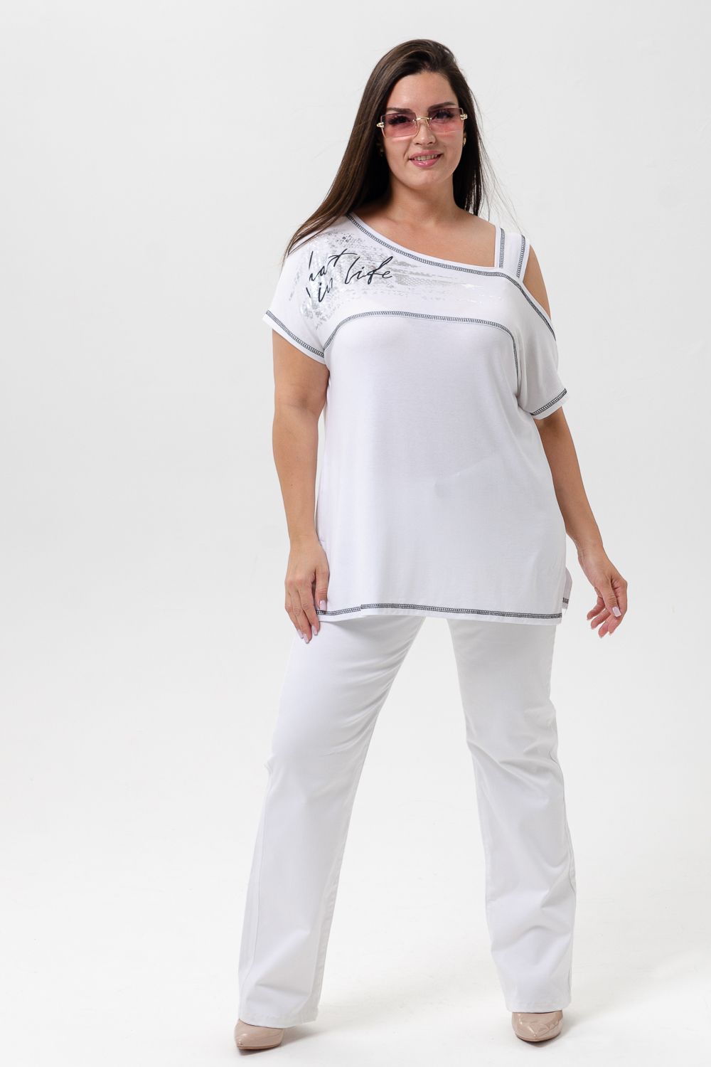 Туника женская полуприлегающего силуэта. Рукав цельнокроенный короткий, с одной стороны бретель на плече, в боковых швах разрезы. В верхней части полочки модный принт.