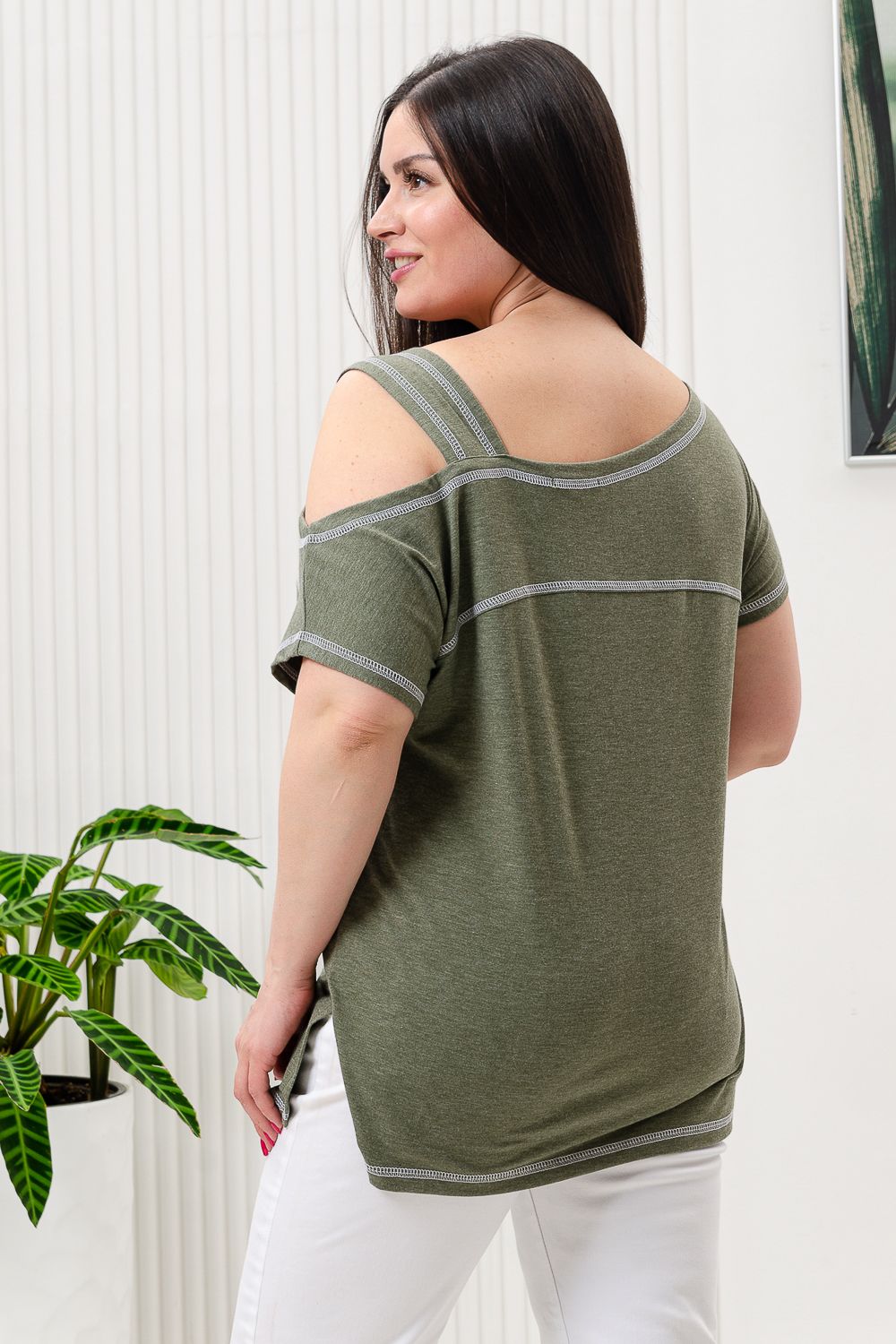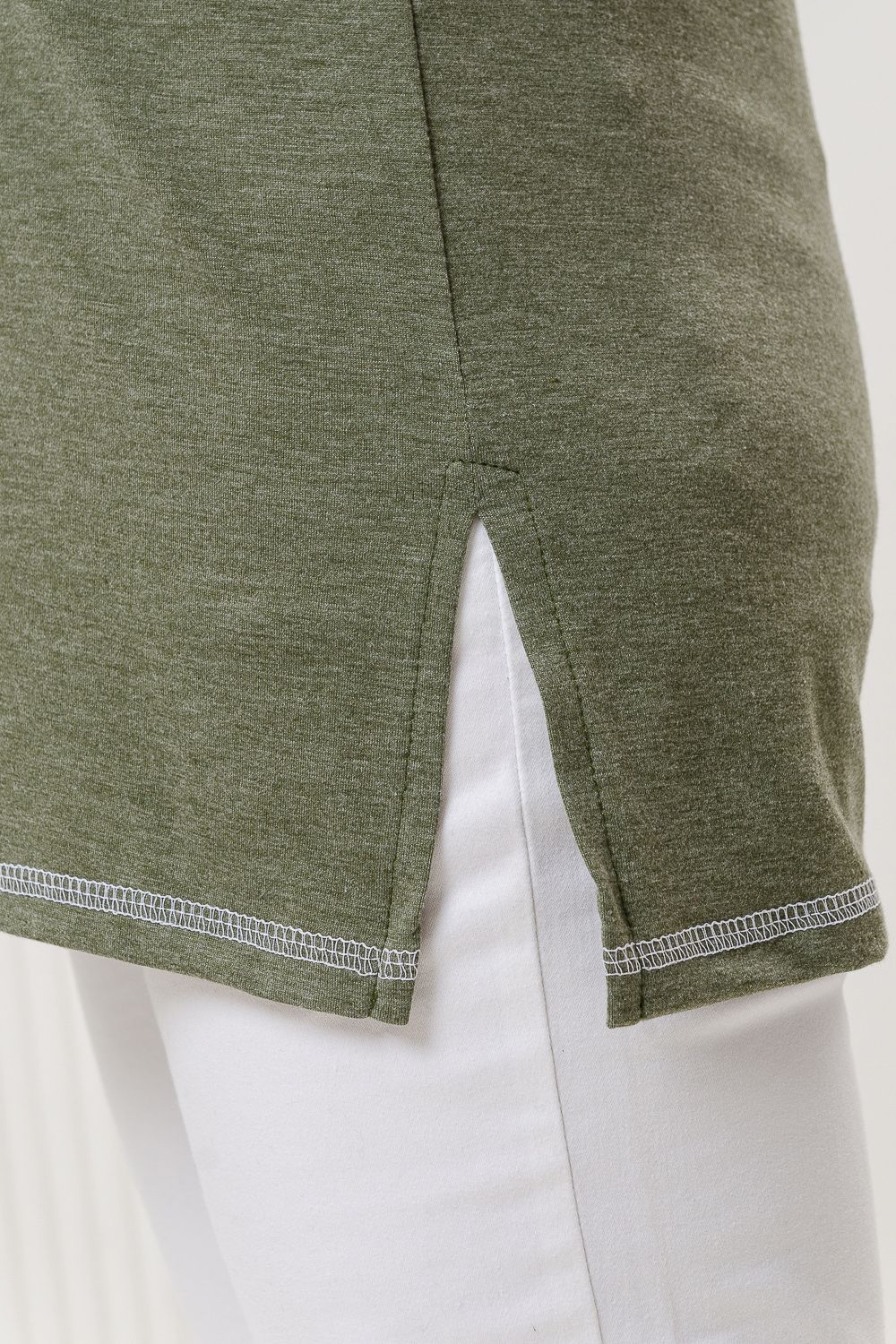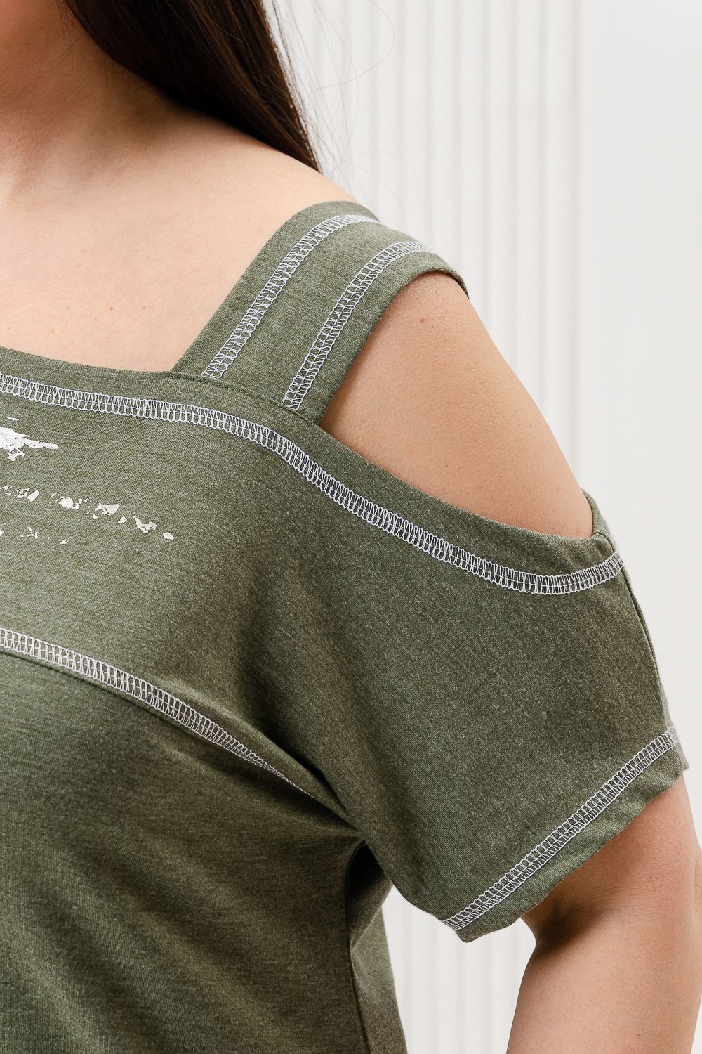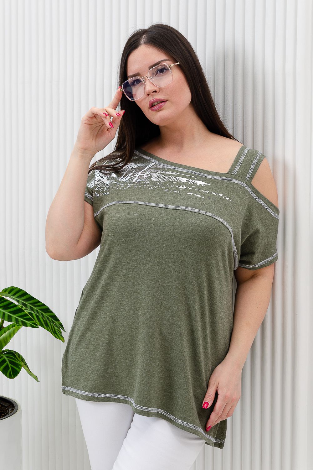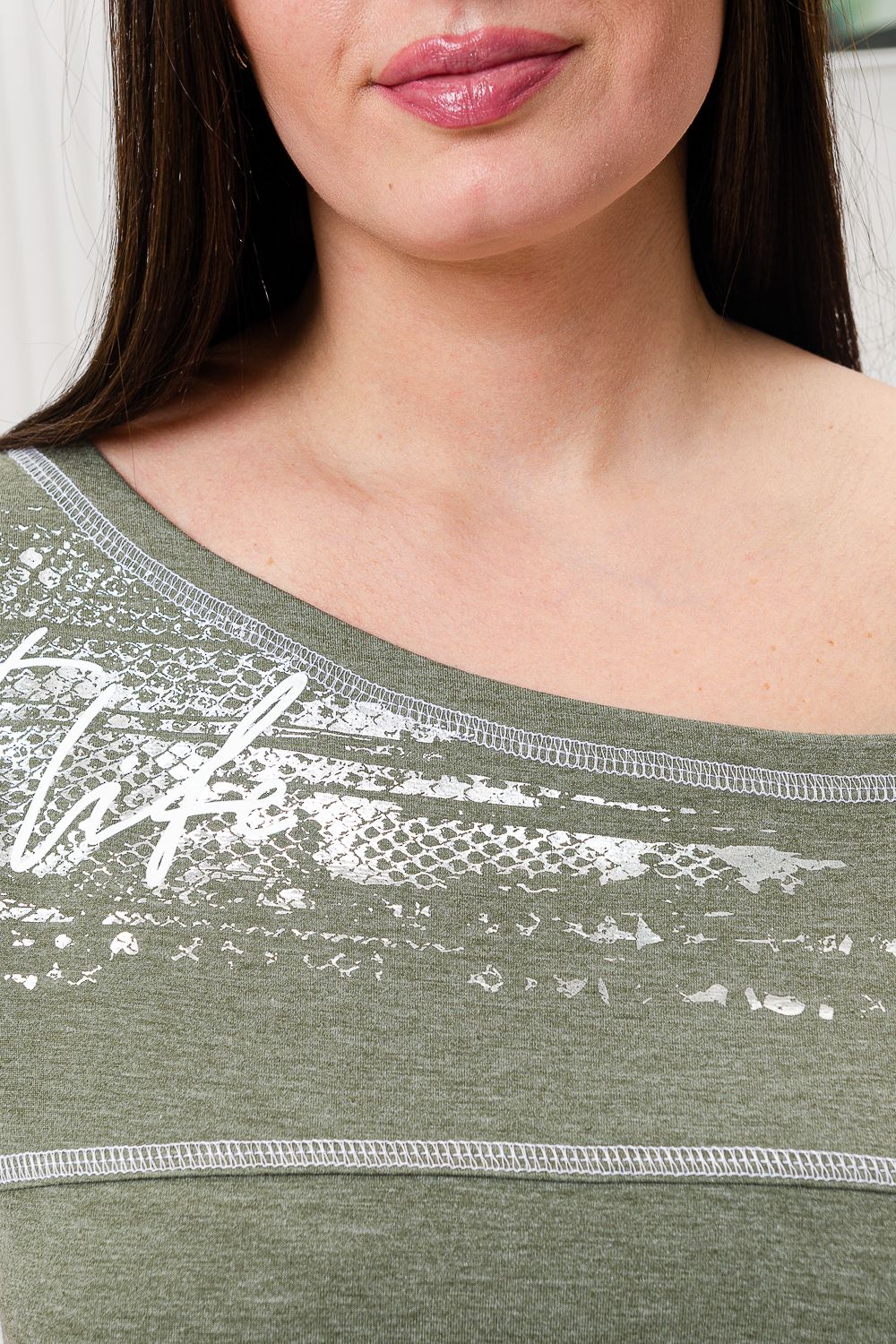 Туника женская полуприлегающего силуэта. Рукав цельнокроенный короткий, с одной стороны бретель на плече, в боковых швах разрезы. В верхней части полочки модный принт.