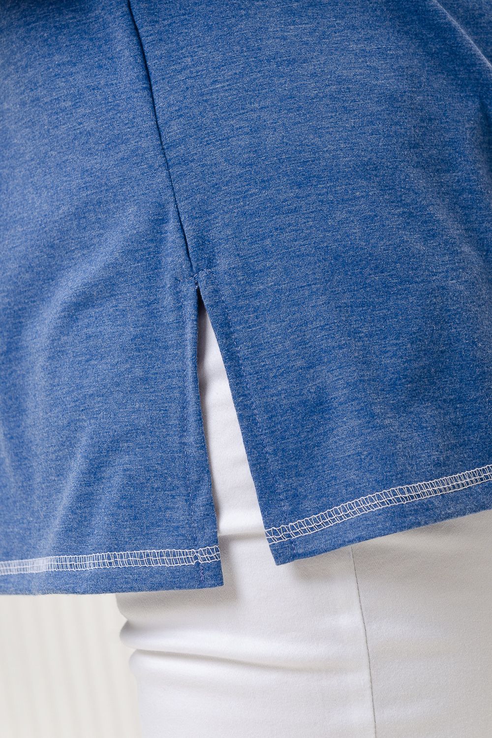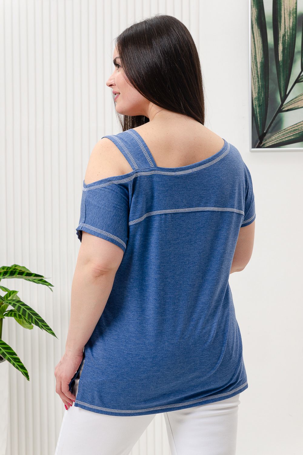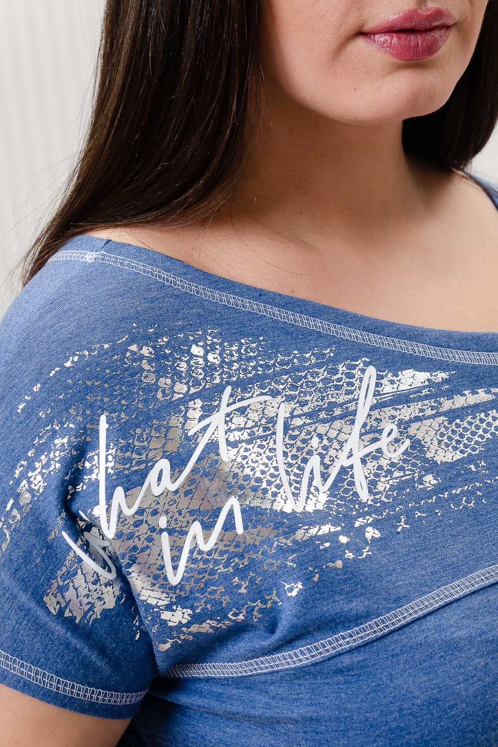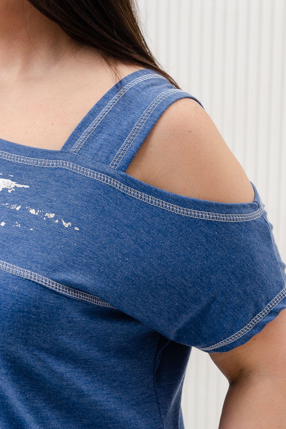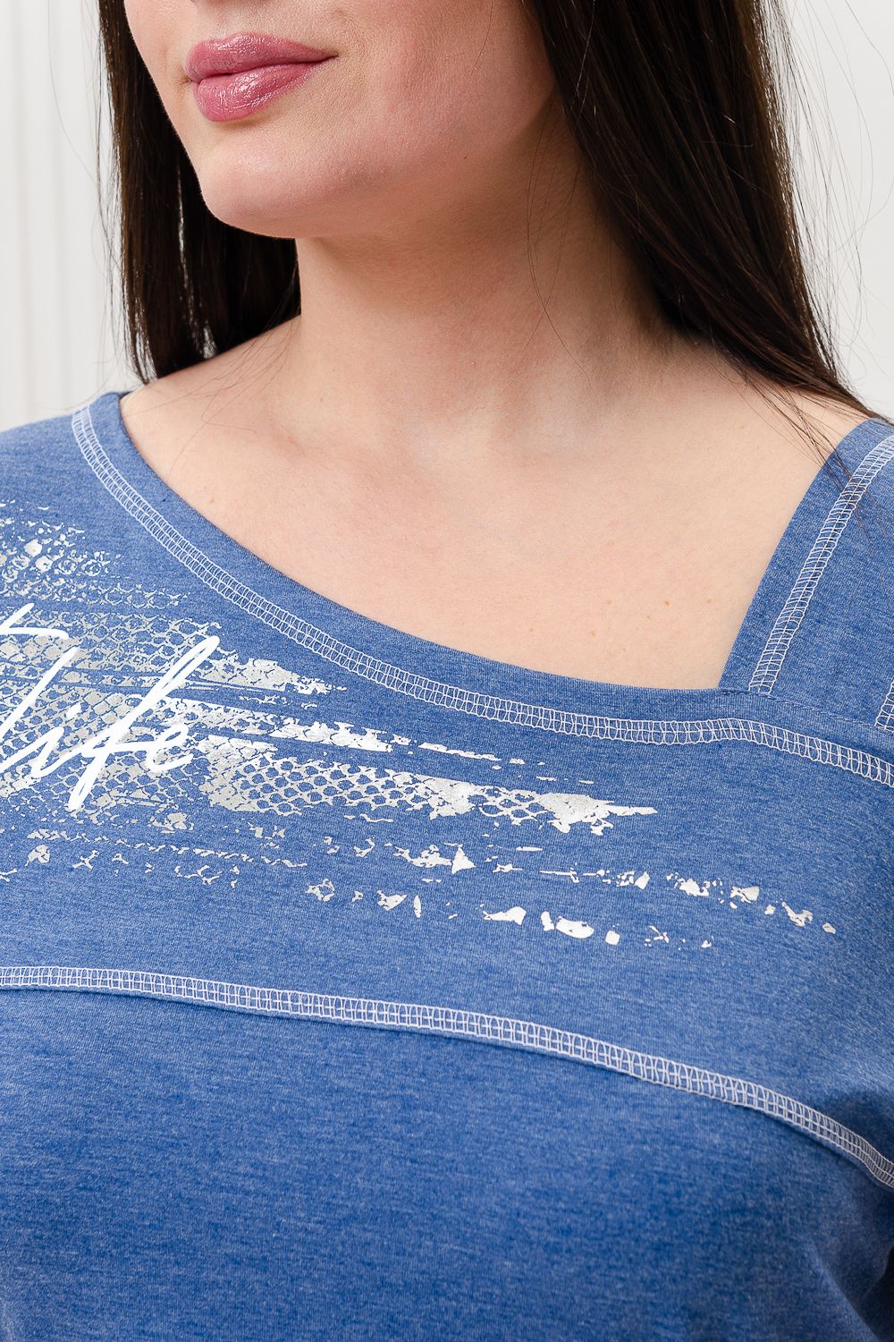 Туника женская полуприлегающего силуэта. Рукав цельнокроенный короткий, с одной стороны бретель на плече, в боковых швах разрезы. В верхней части полочки модный принт.