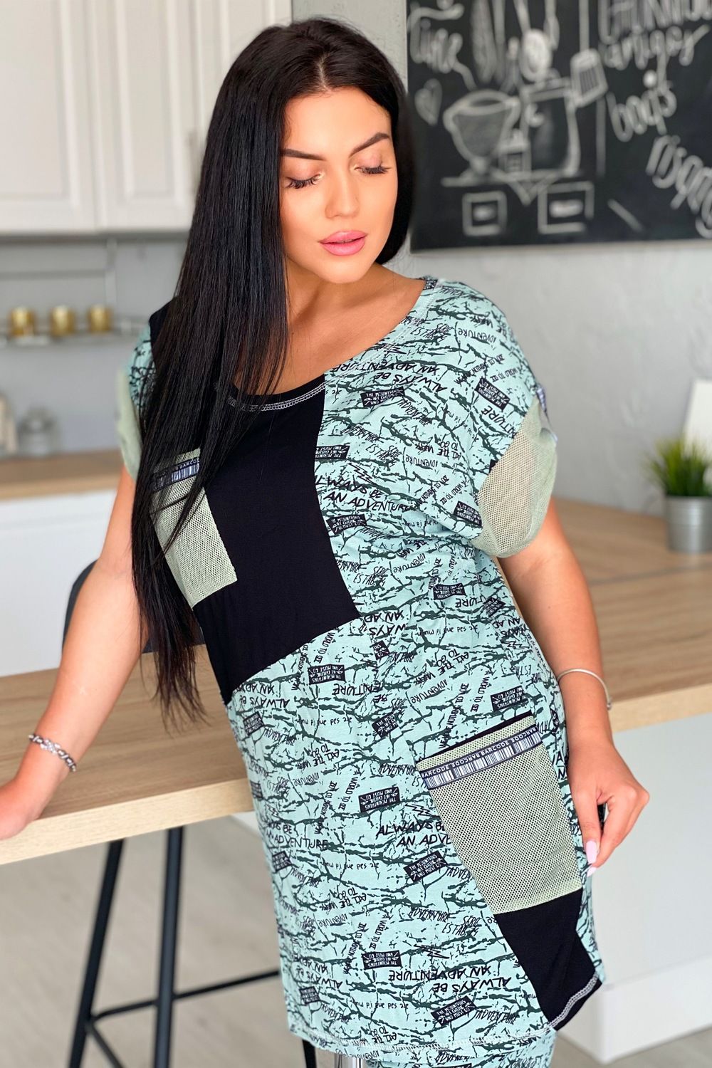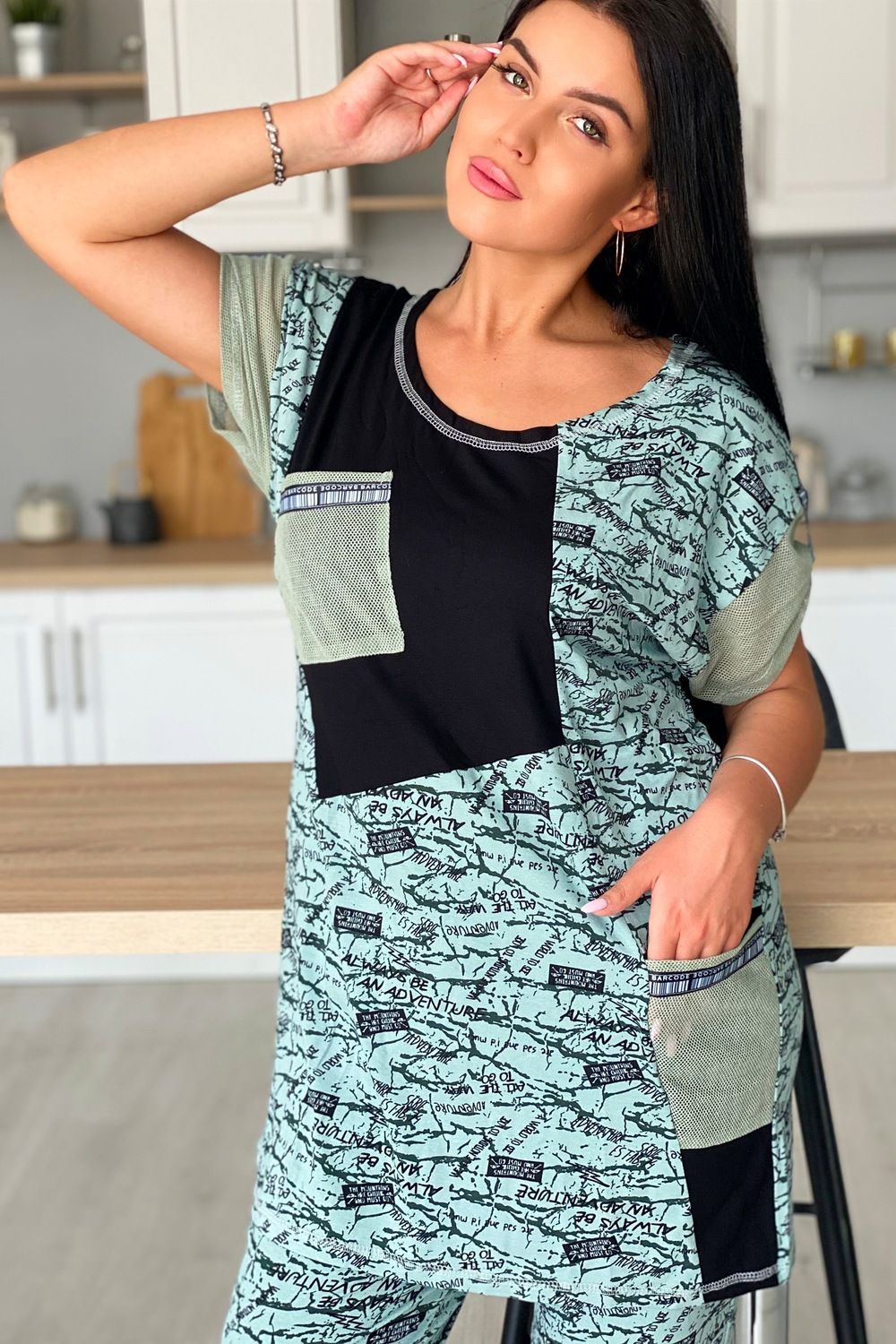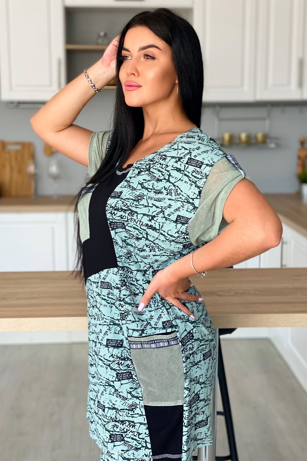 Туника женская прямого силуэта. Горловина круглая, рукав цельнокроенный короткий. Карманы на полочке, манжеты на рукаве из оливковой сетки, которая гармонично сочетается с набивной вискозой. Декоративная тесьма для хлястов рукава и отделки карманов придает тунике наибольшую актуальность.