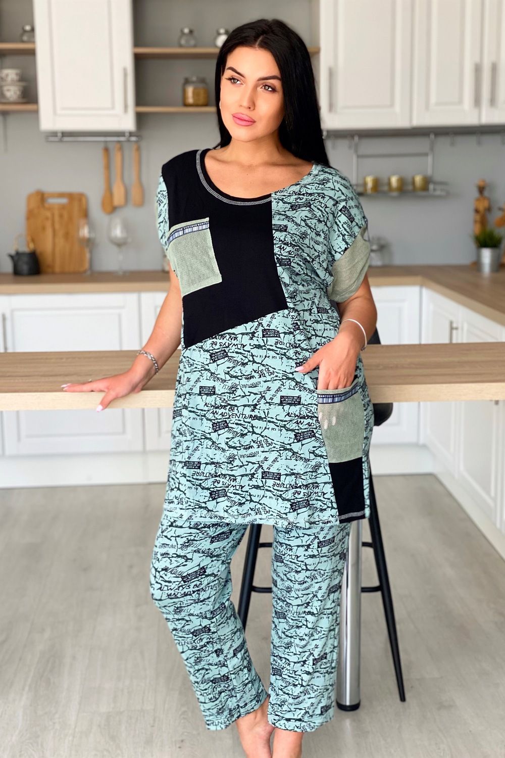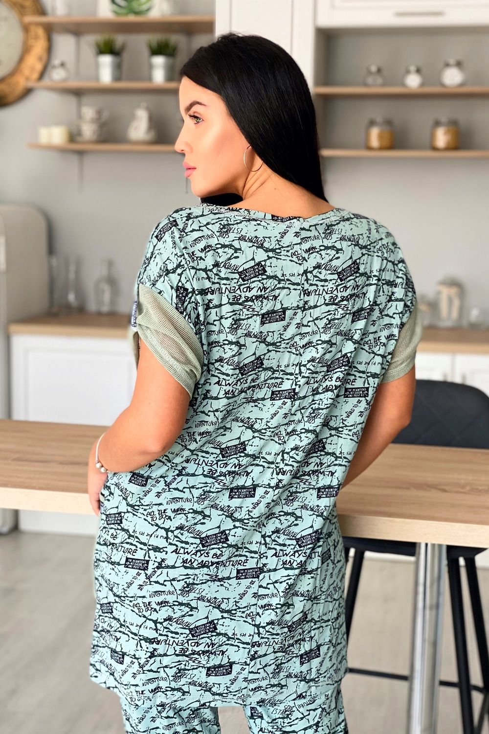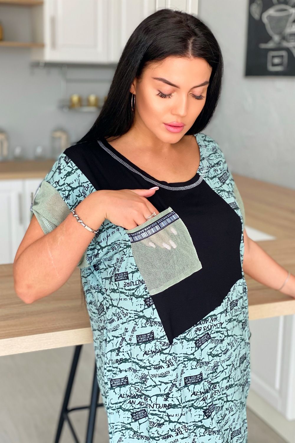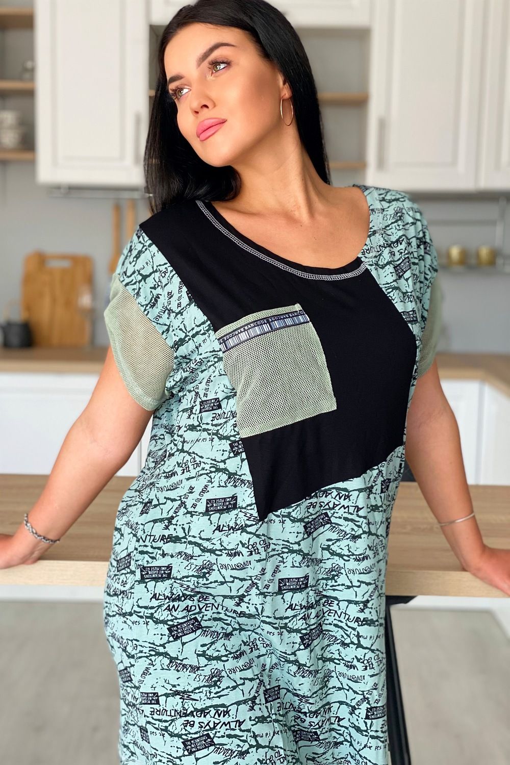 Туника женская прямого силуэта. Горловина круглая, рукав цельнокроенный короткий. Карманы на полочке, манжеты на рукаве из оливковой сетки, которая гармонично сочетается с набивной вискозой. Декоративная тесьма для хлястов рукава и отделки карманов придает тунике наибольшую актуальность.