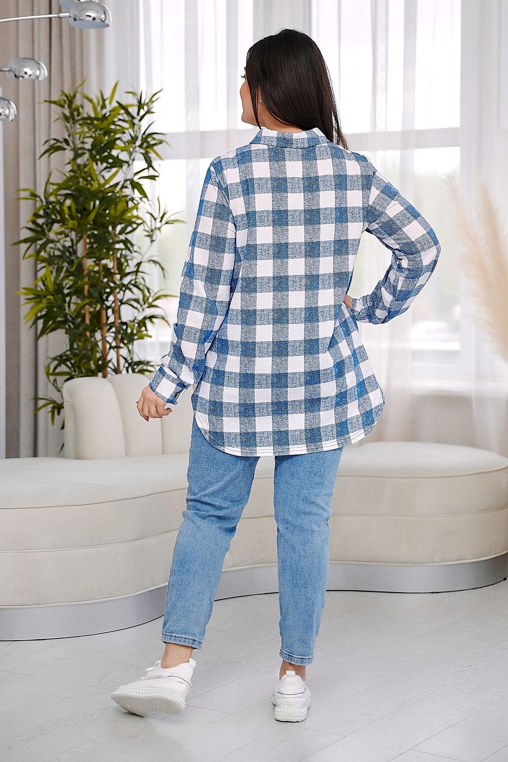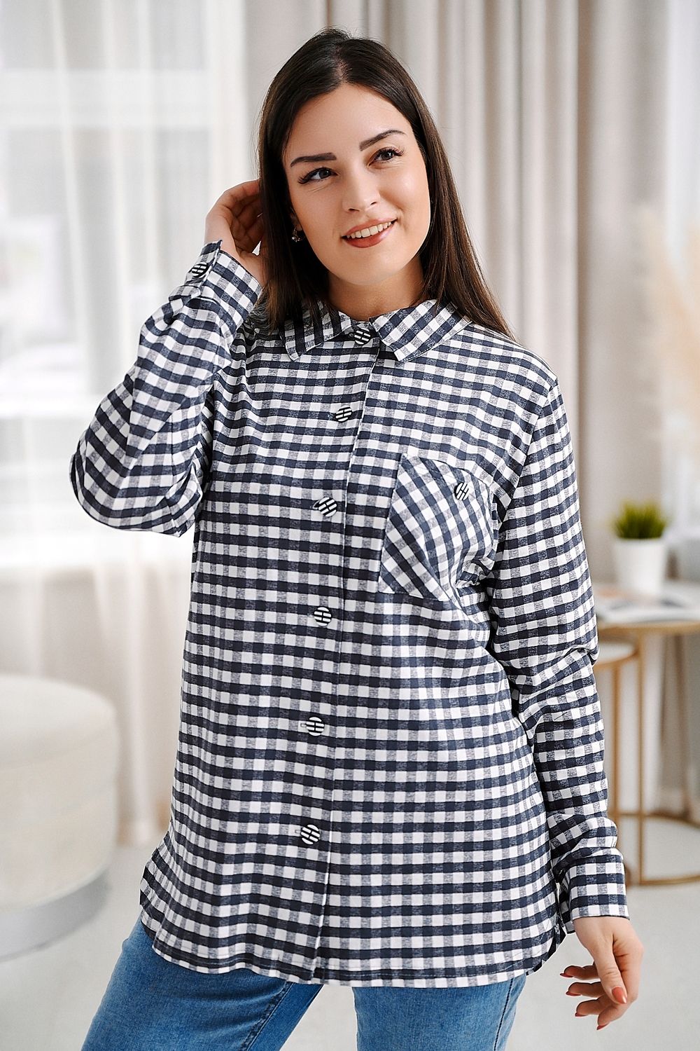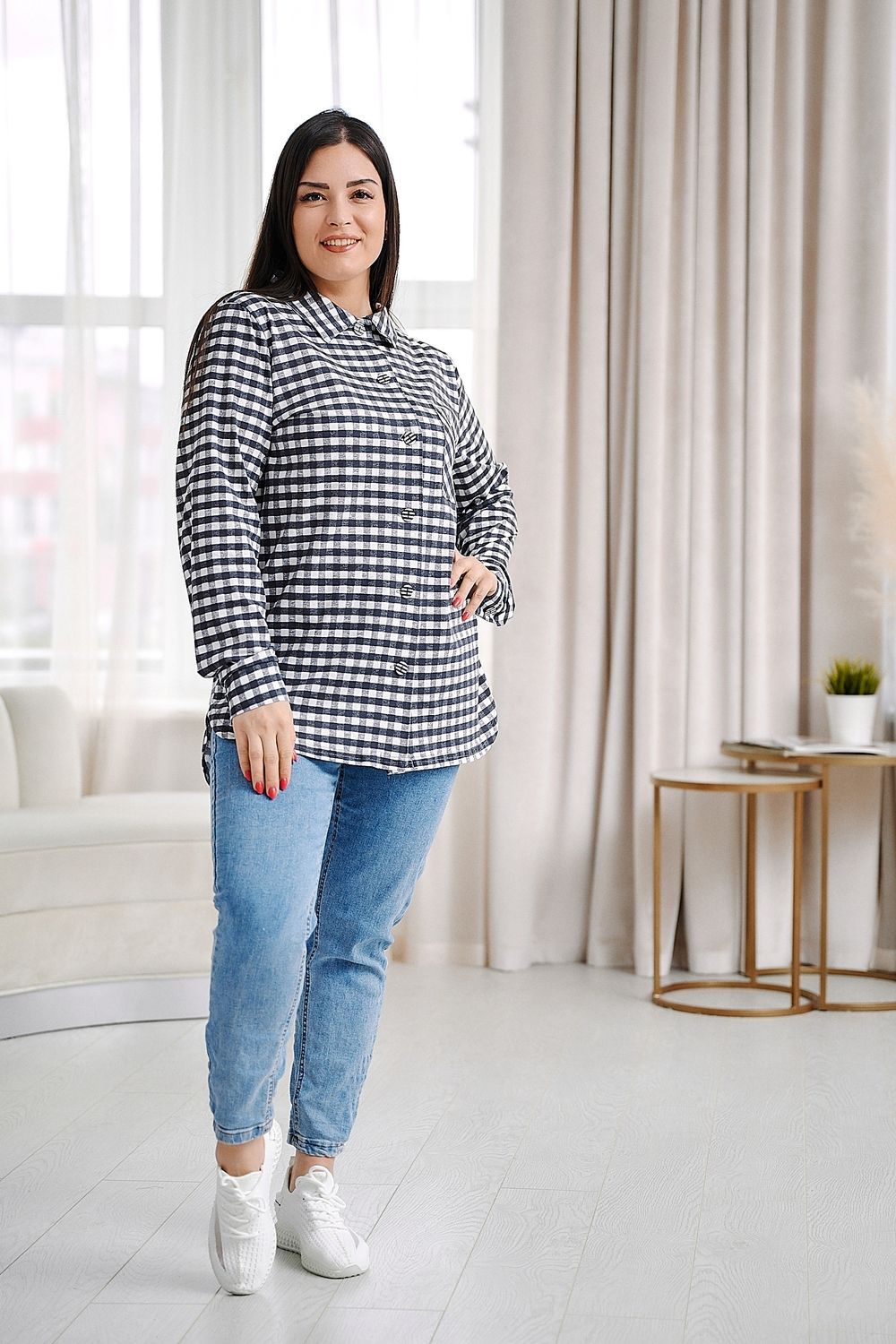 Туника женская прямого силуэта с отложным воротником. Застежка на петли - пуговицы. Рукав длинный, втачной с манжетой. Низ туники фигурный, спинка несколько длиннее полочки. На полочке нагрудный карман. На модели 52 размер