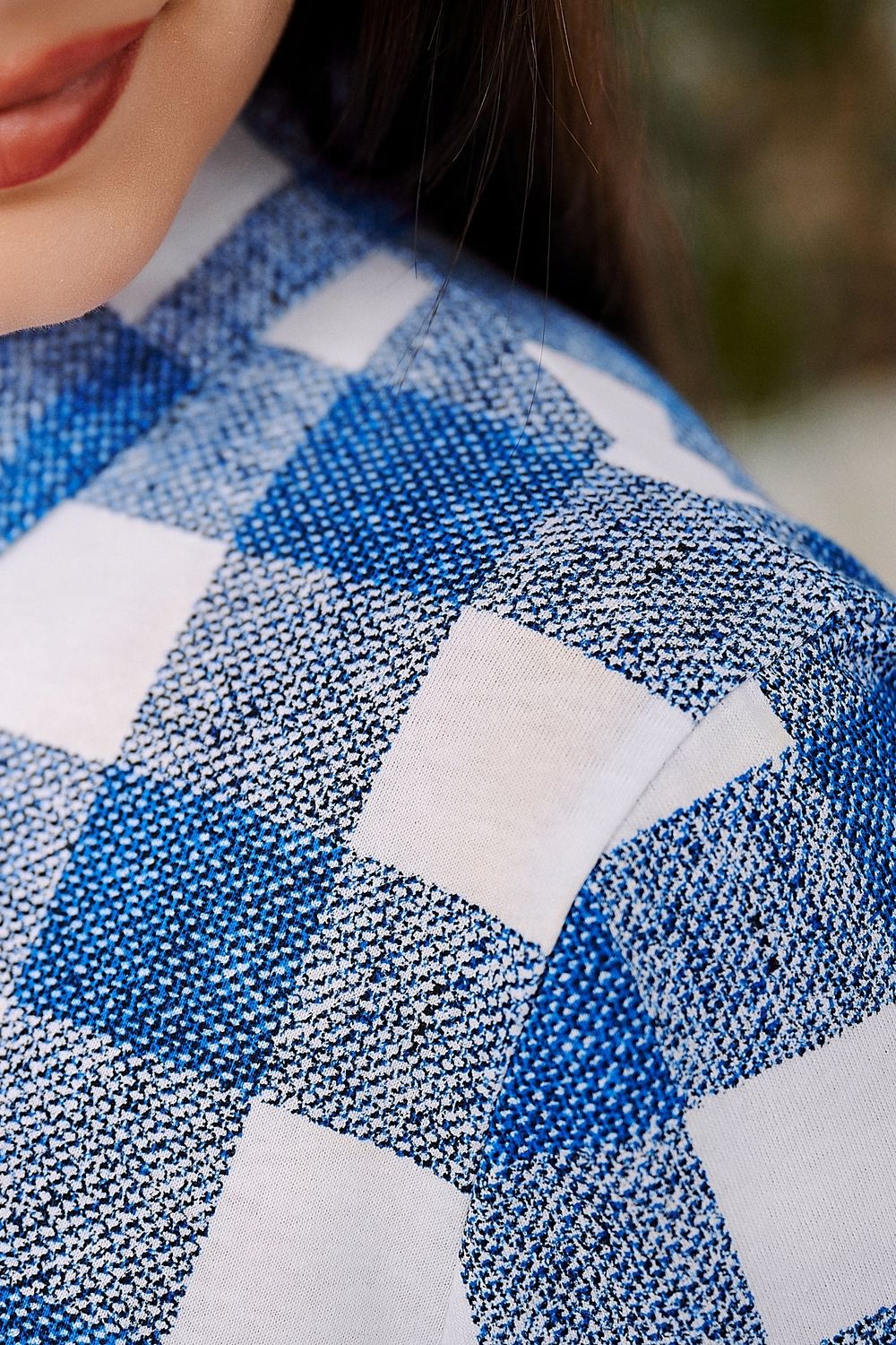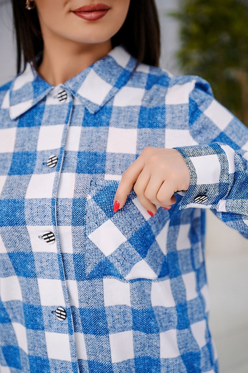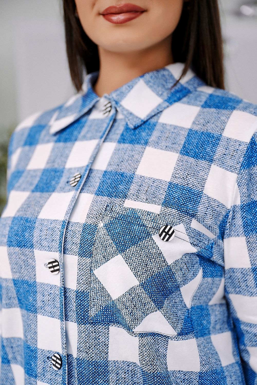 Туника женская прямого силуэта с отложным воротником. Застежка на петли - пуговицы. Рукав длинный, втачной с манжетой. Низ туники фигурный, спинка несколько длиннее полочки. На полочке нагрудный карман. На модели 52 размер