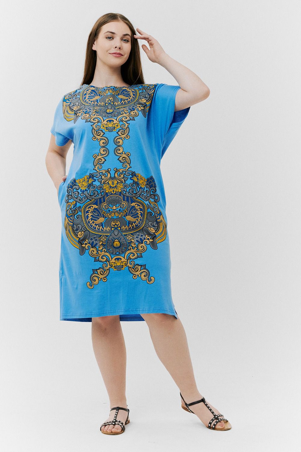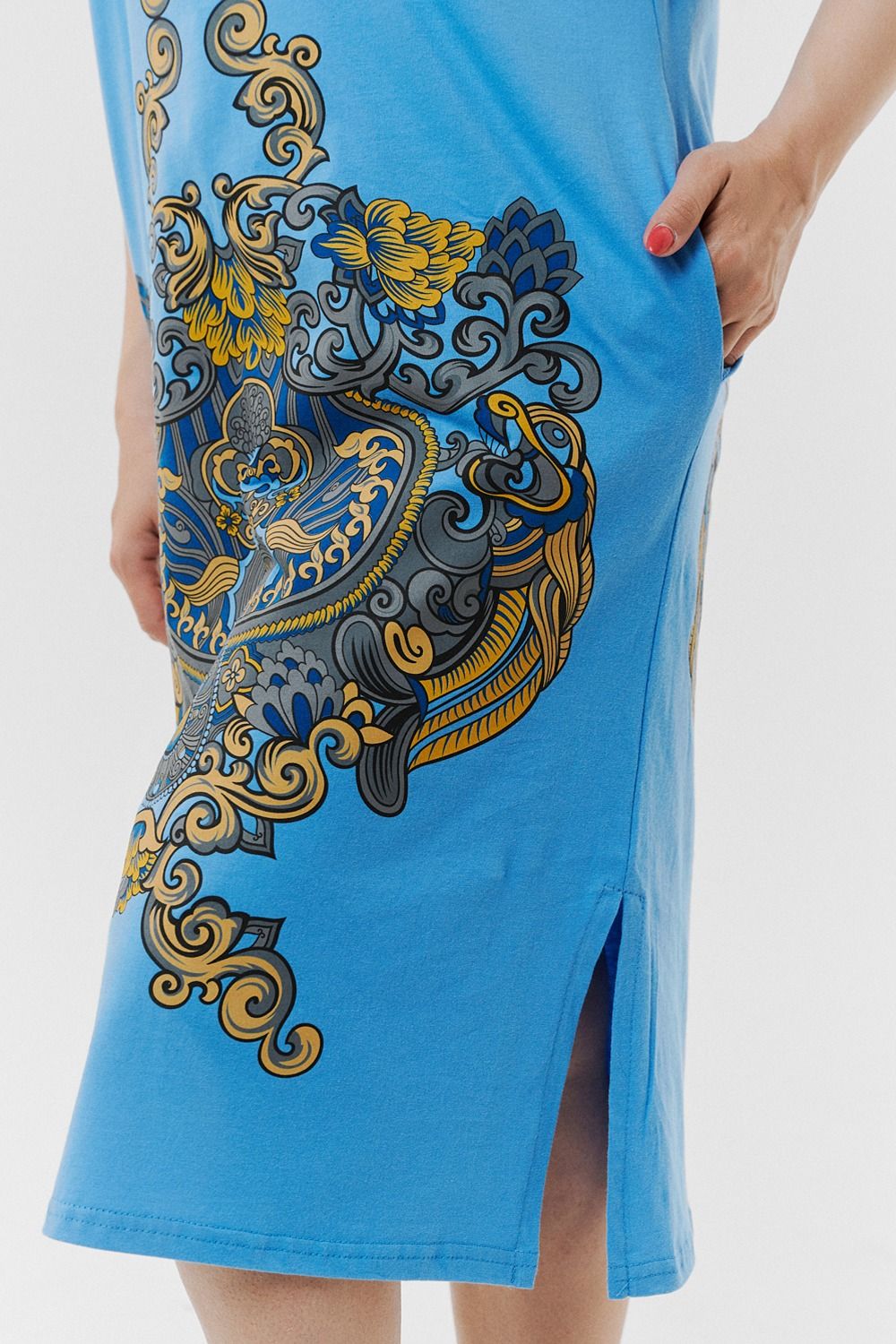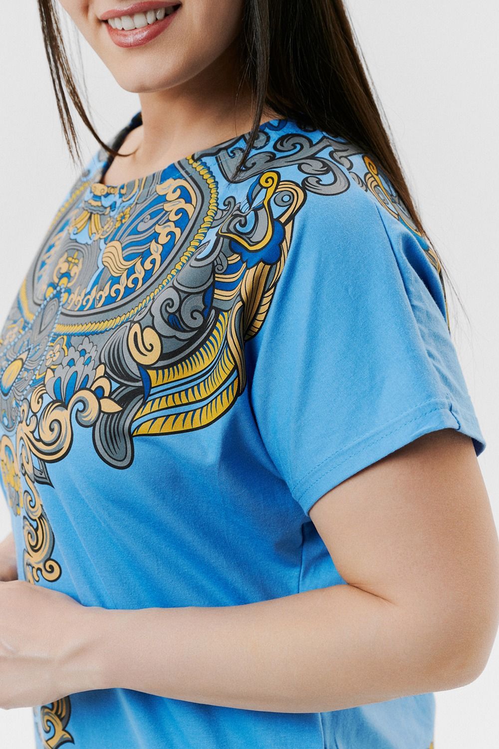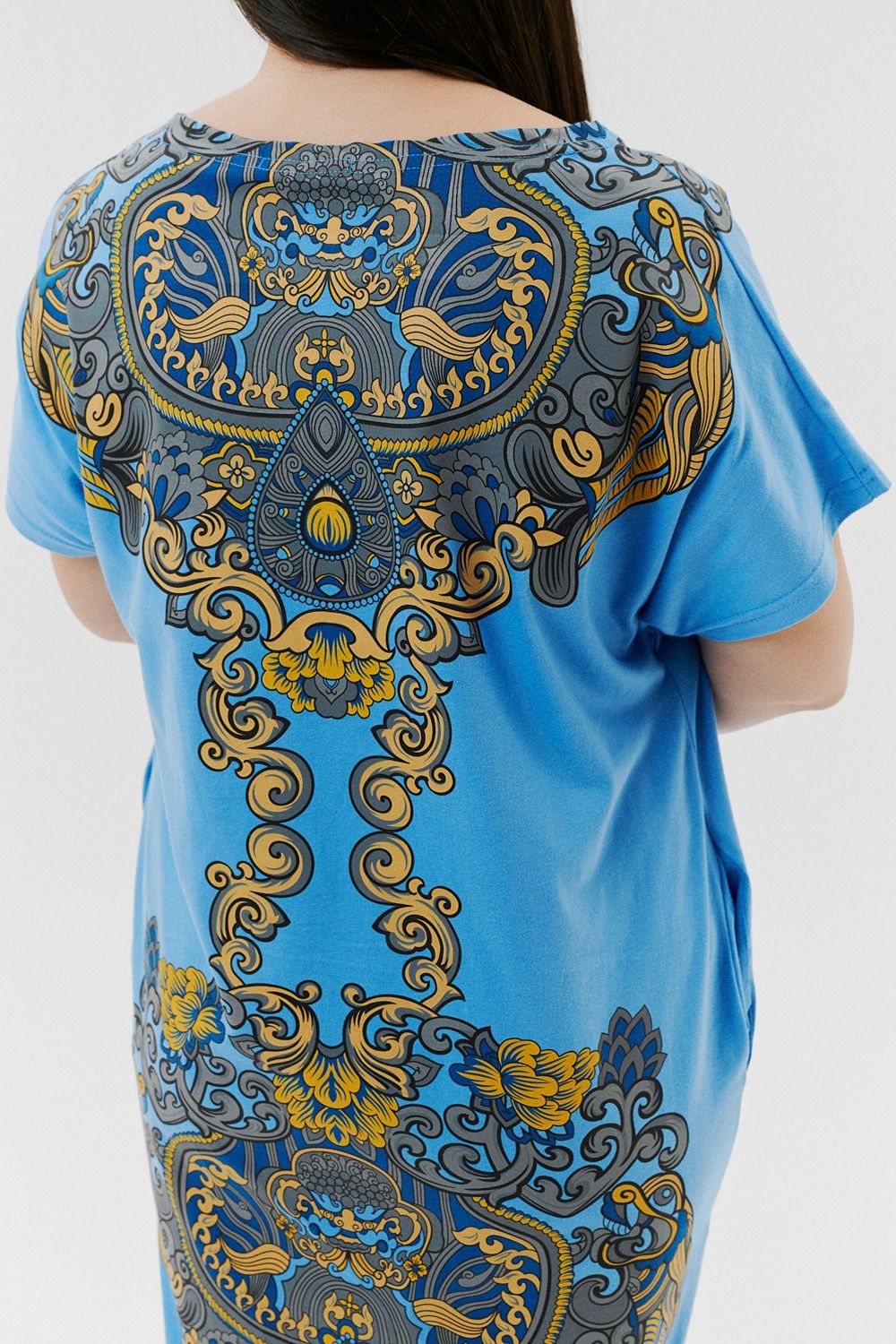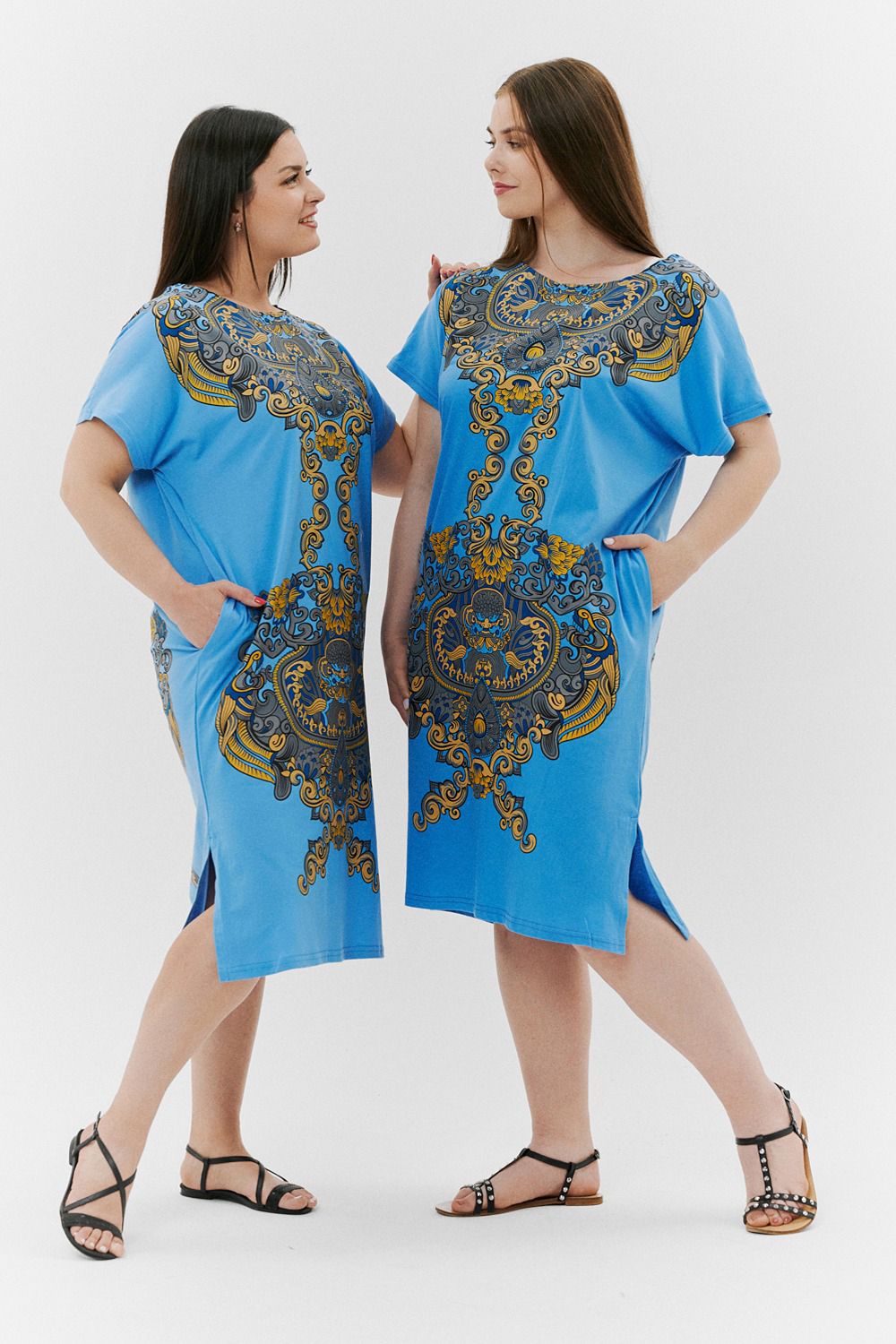 Туника женская прямого силуэта, рукав цельнокроенный короткий, в боковых швах внутренние карманы, внизу - разрезы. На полочке и спинке принт.
