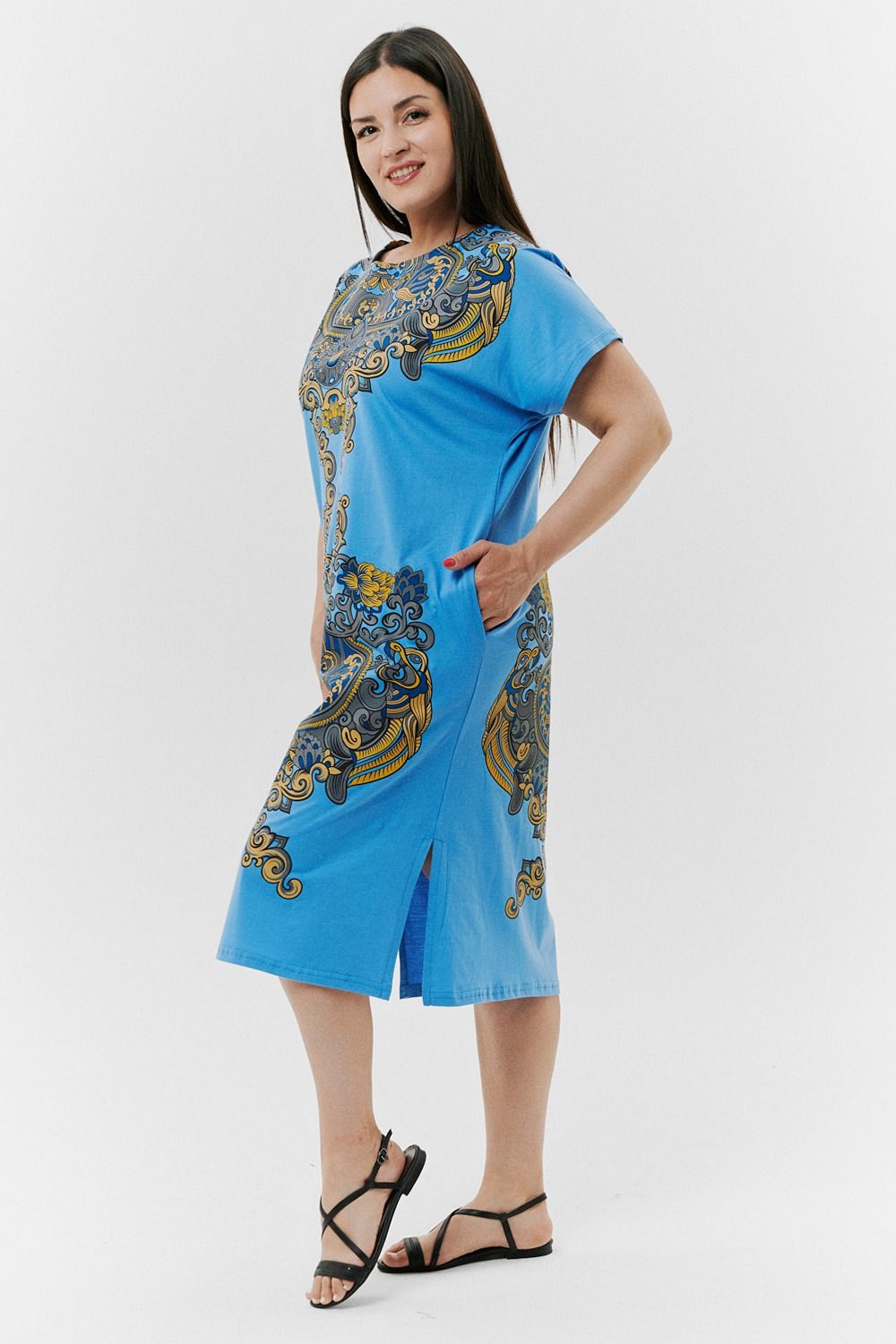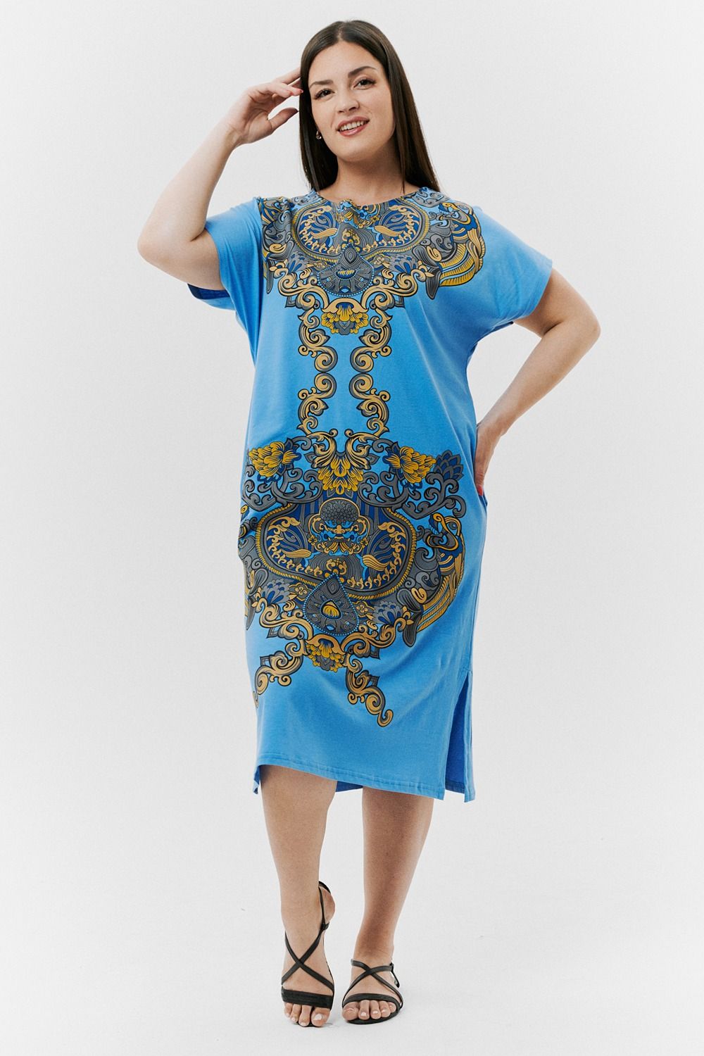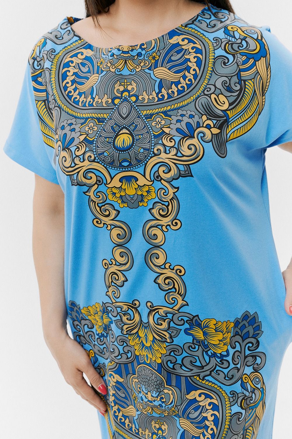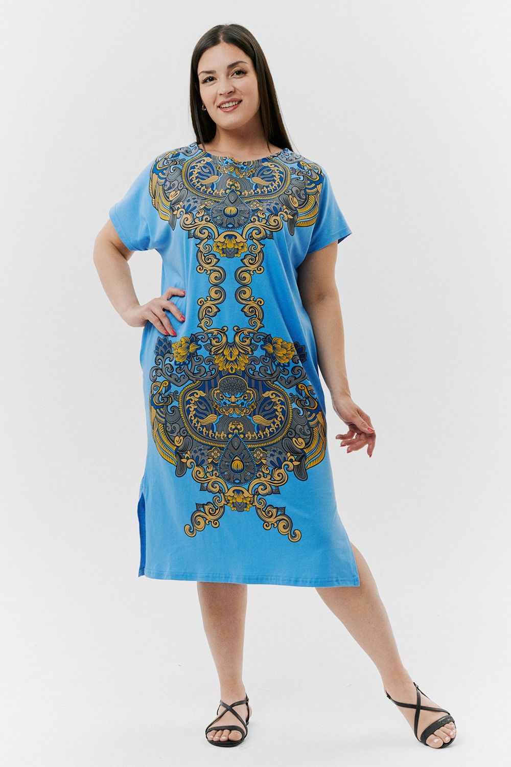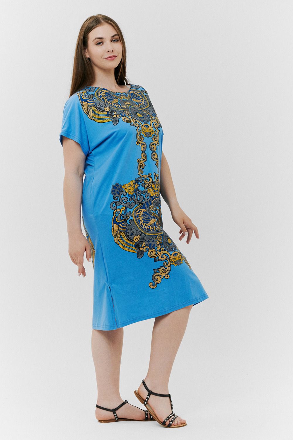 Туника женская прямого силуэта, рукав цельнокроенный короткий, в боковых швах внутренние карманы, внизу - разрезы. На полочке и спинке принт.