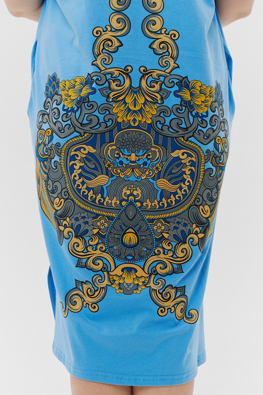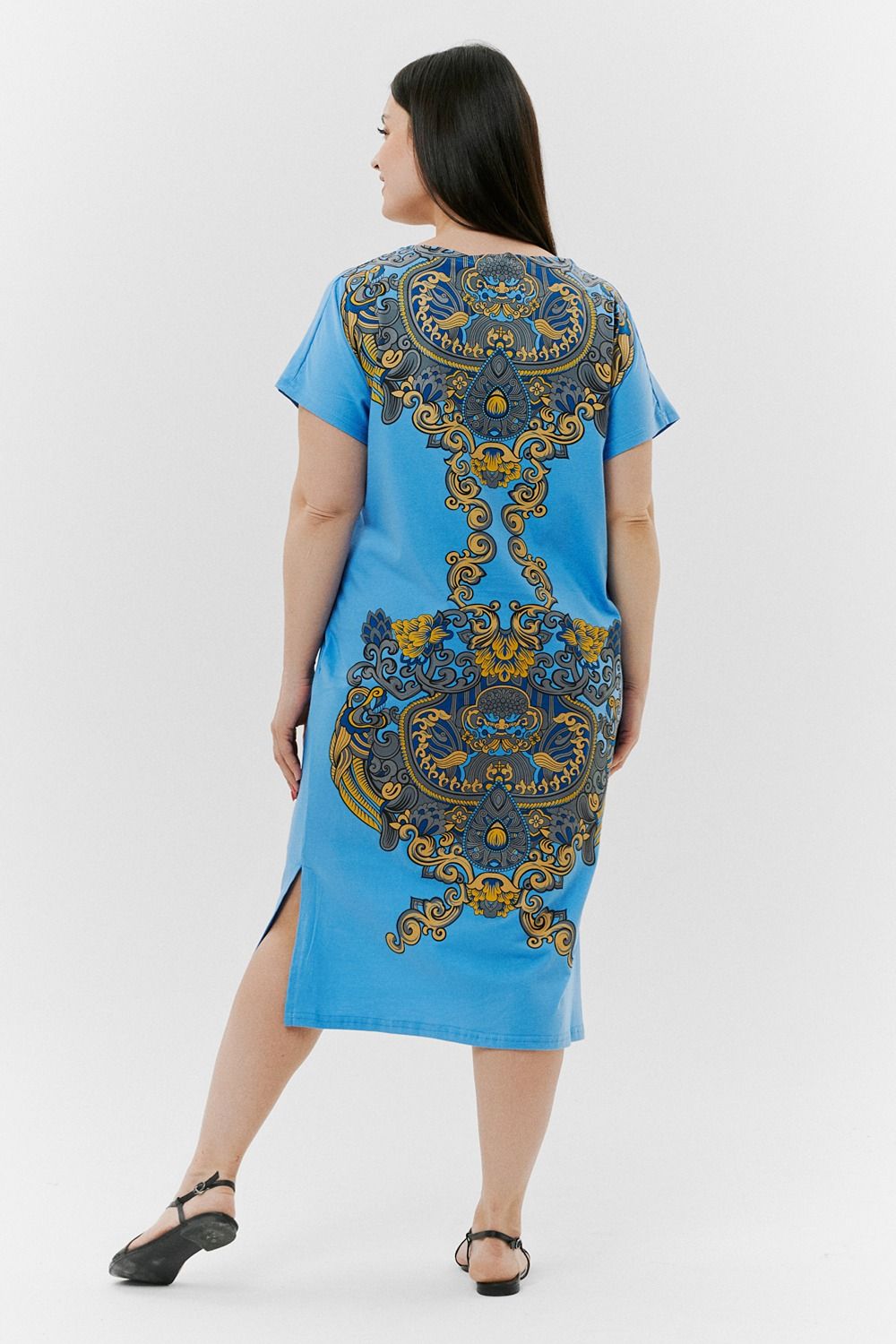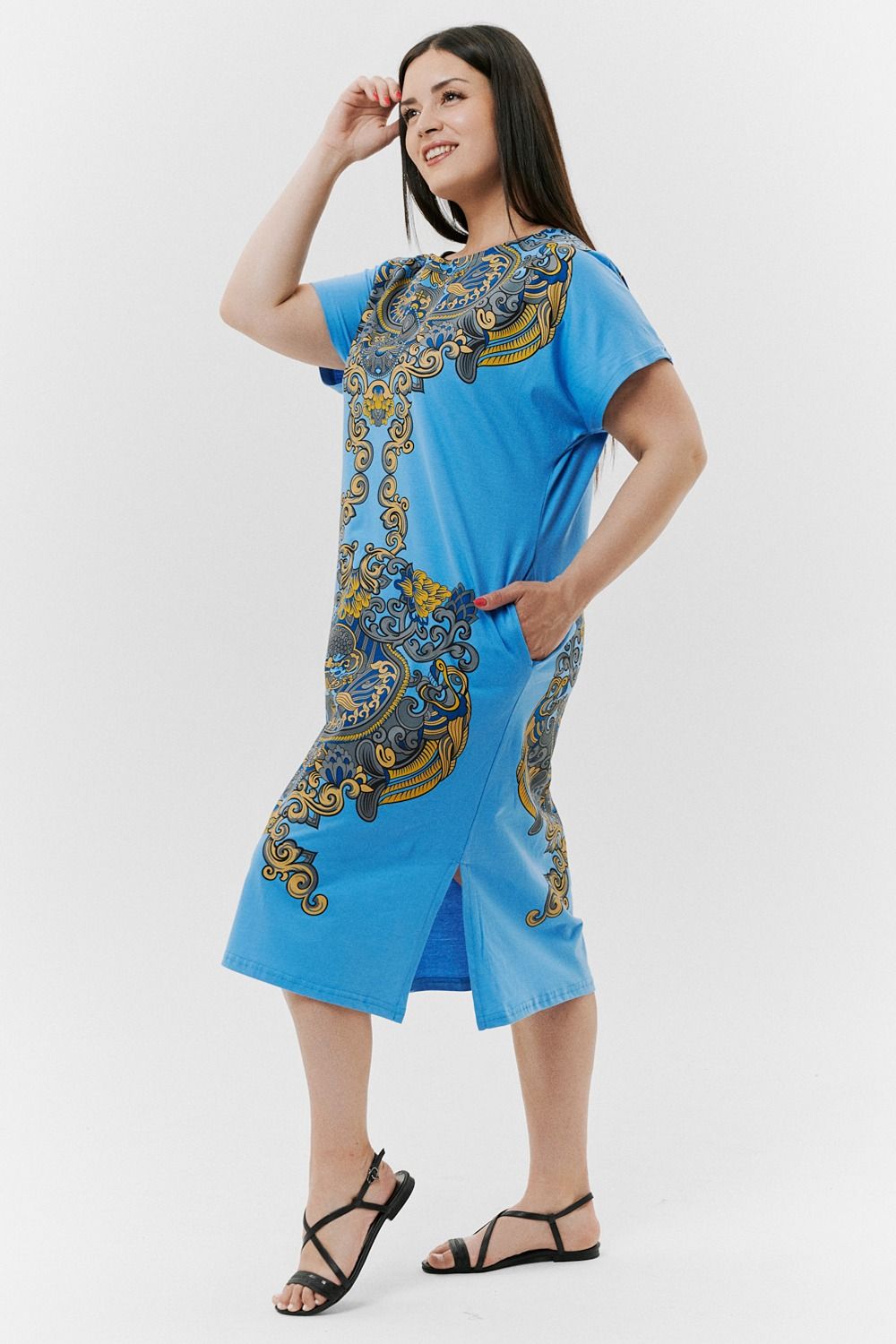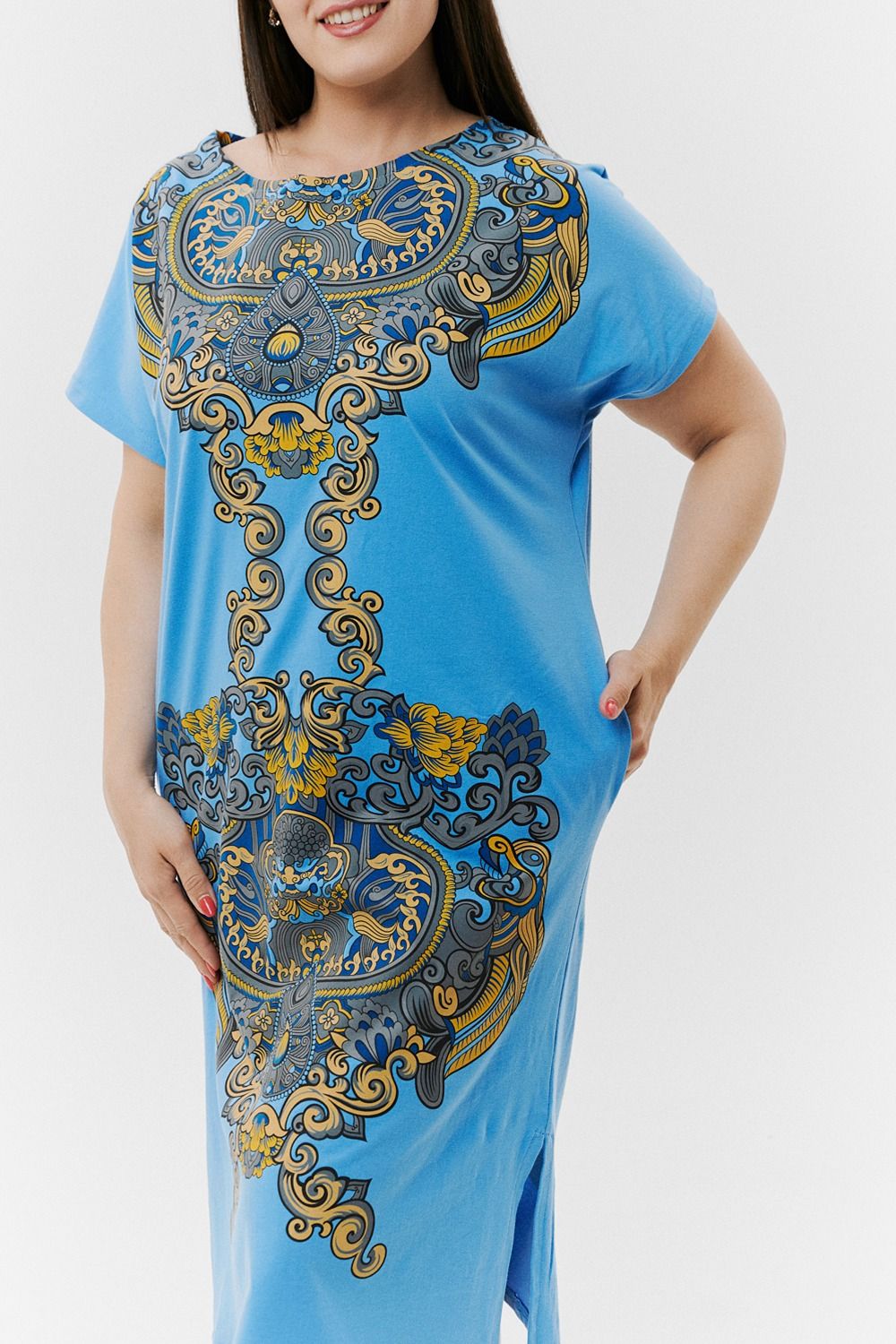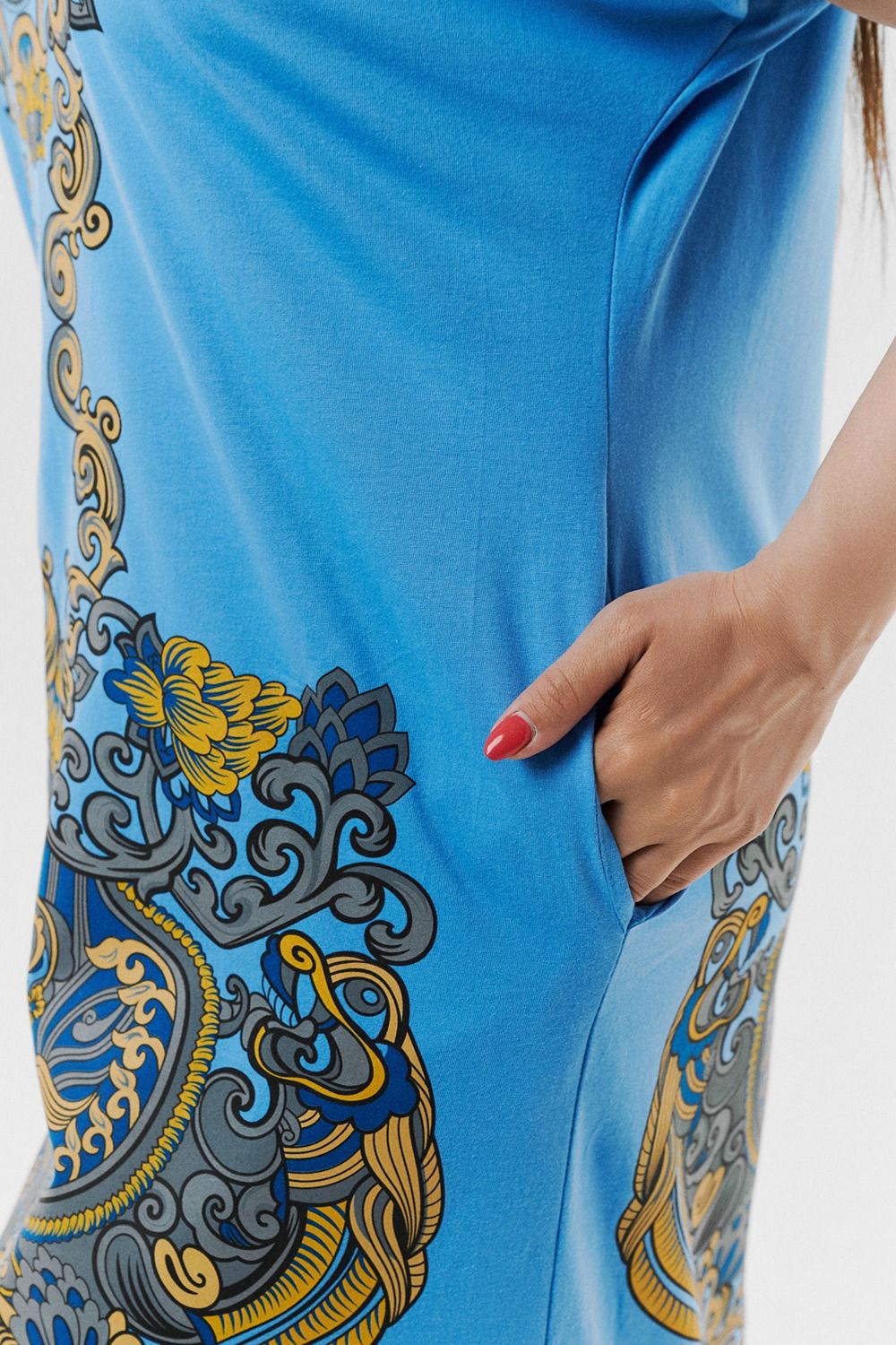 Туника женская прямого силуэта, рукав цельнокроенный короткий, в боковых швах внутренние карманы, внизу - разрезы. На полочке и спинке принт.
