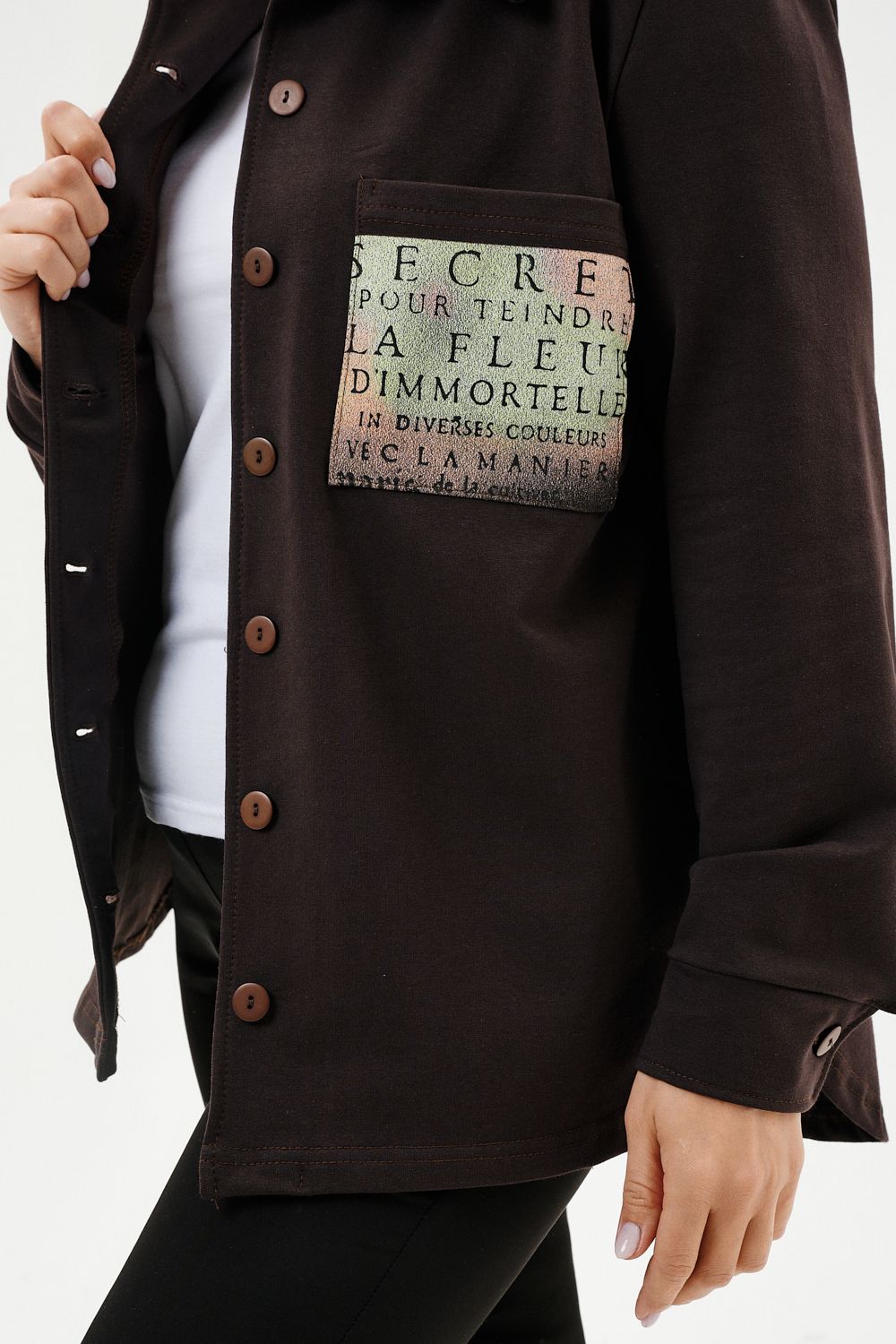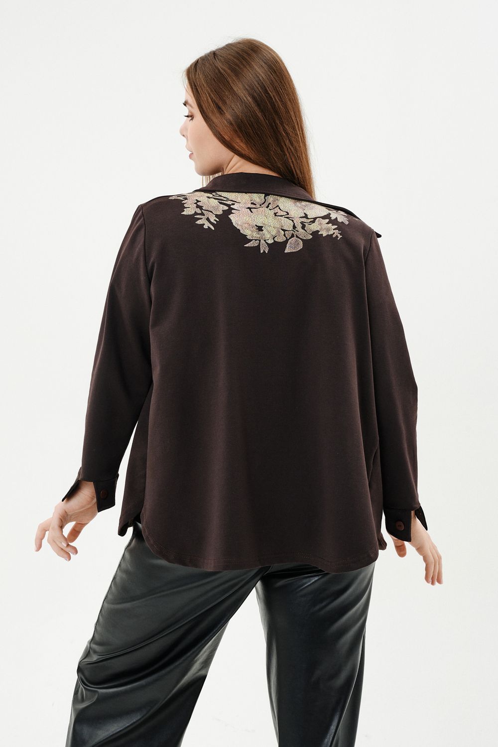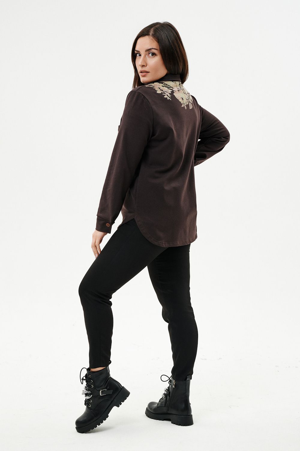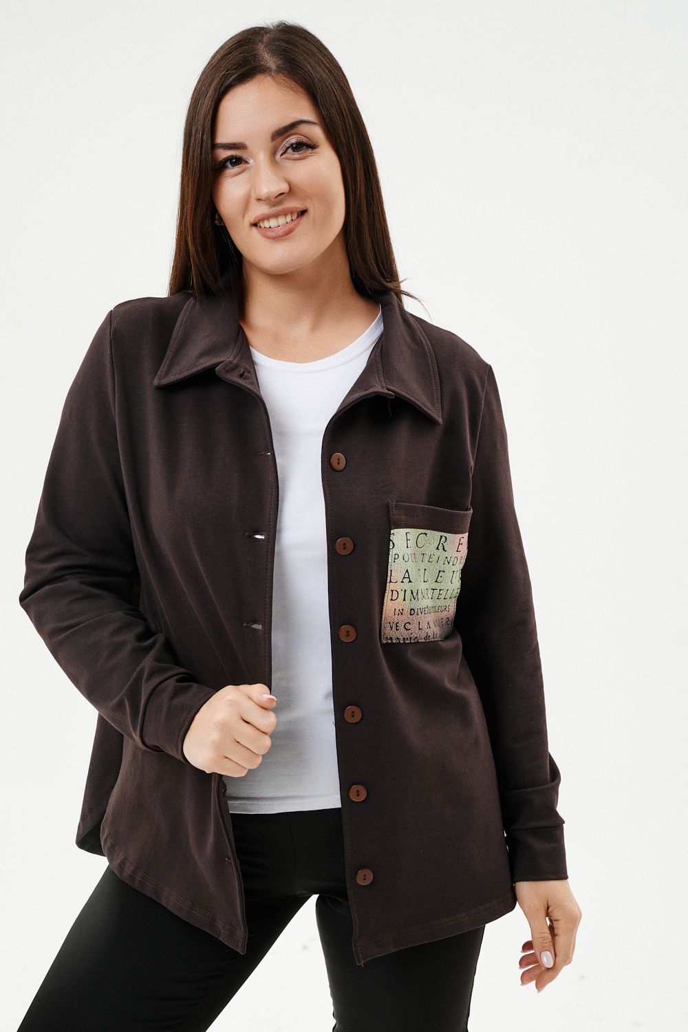 Туника женская прямого силуэта. Воротник отложной. Застежка на петли-пуговицы. Низ фигурный. Рукав втачной с манжетою. На левой части полочки нагрудный карман. Стилизованный принт в верхней части спинки, под воротником и на нагрудном кармане.