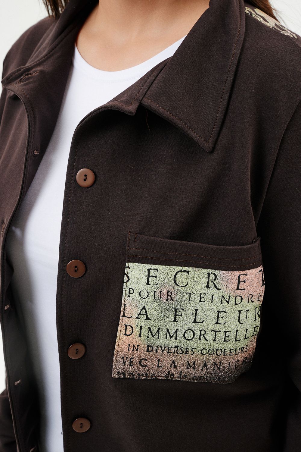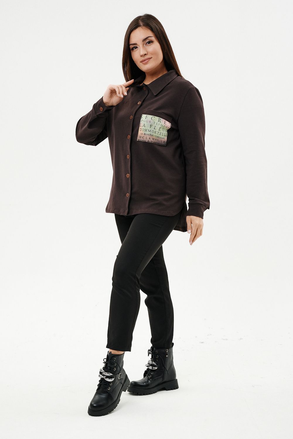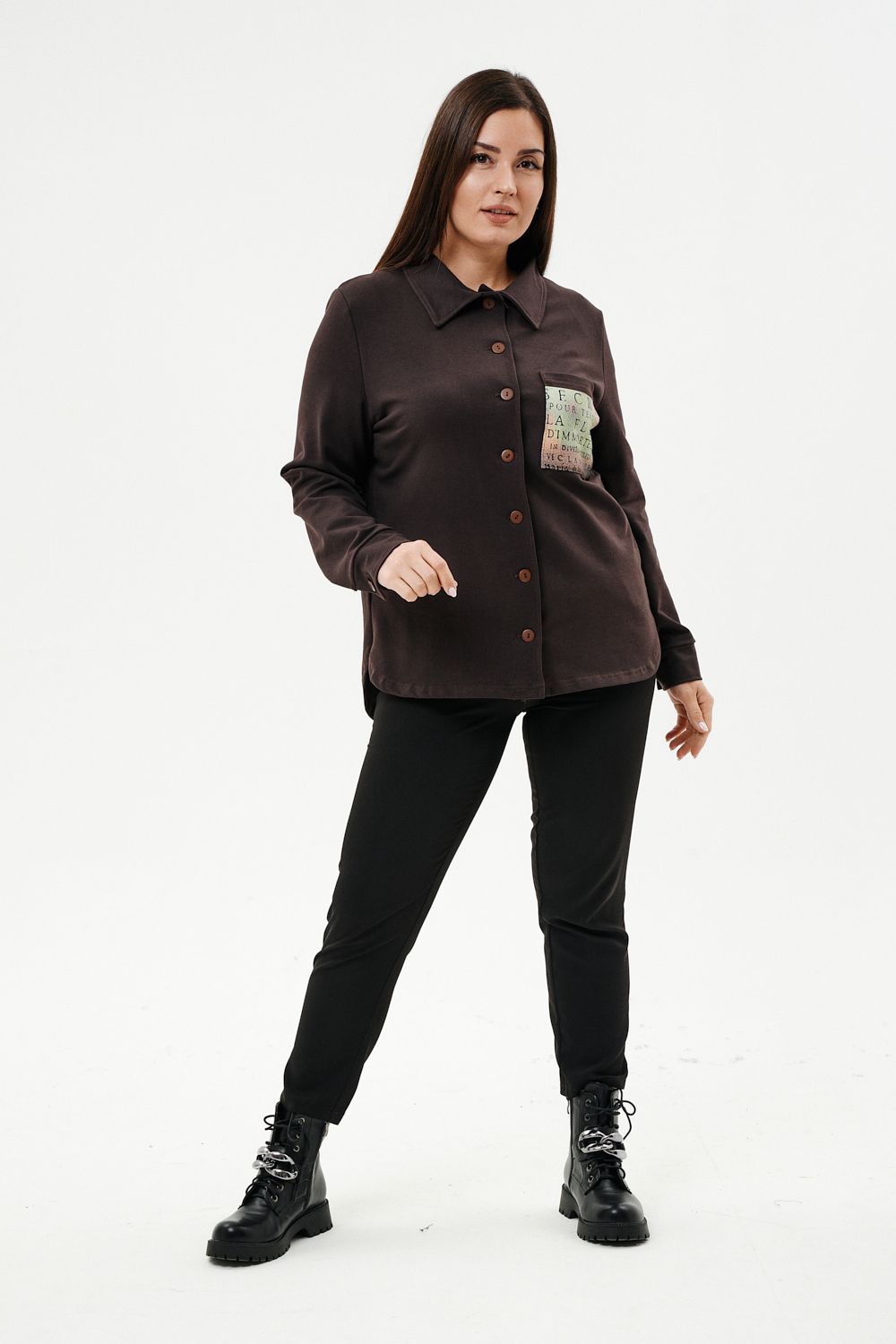Туника женская прямого силуэта. Воротник отложной. Застежка на петли-пуговицы. Низ фигурный. Рукав втачной с манжетою. На левой части полочки нагрудный карман. Стилизованный принт в верхней части спинки, под воротником и на нагрудном кармане.