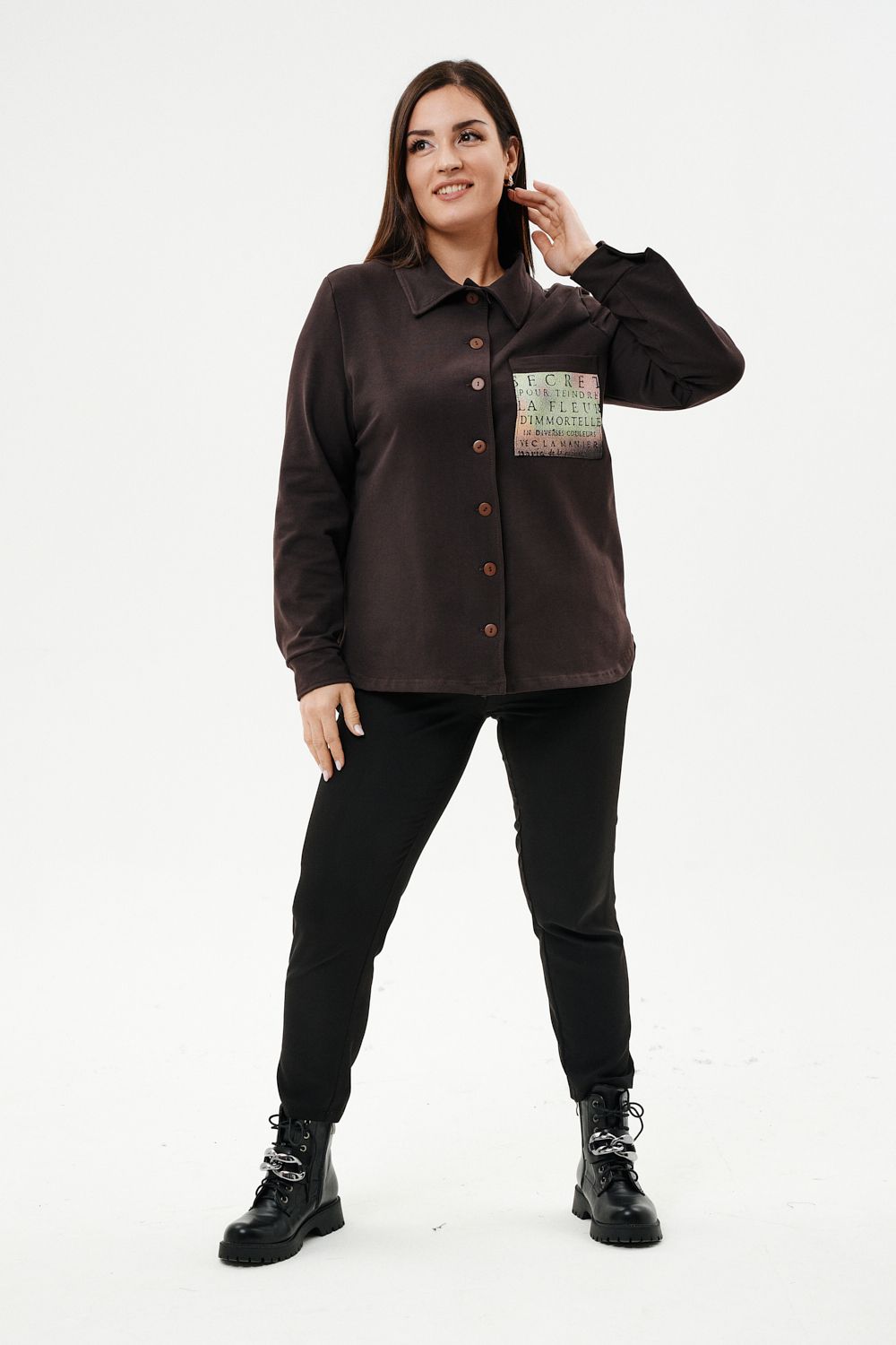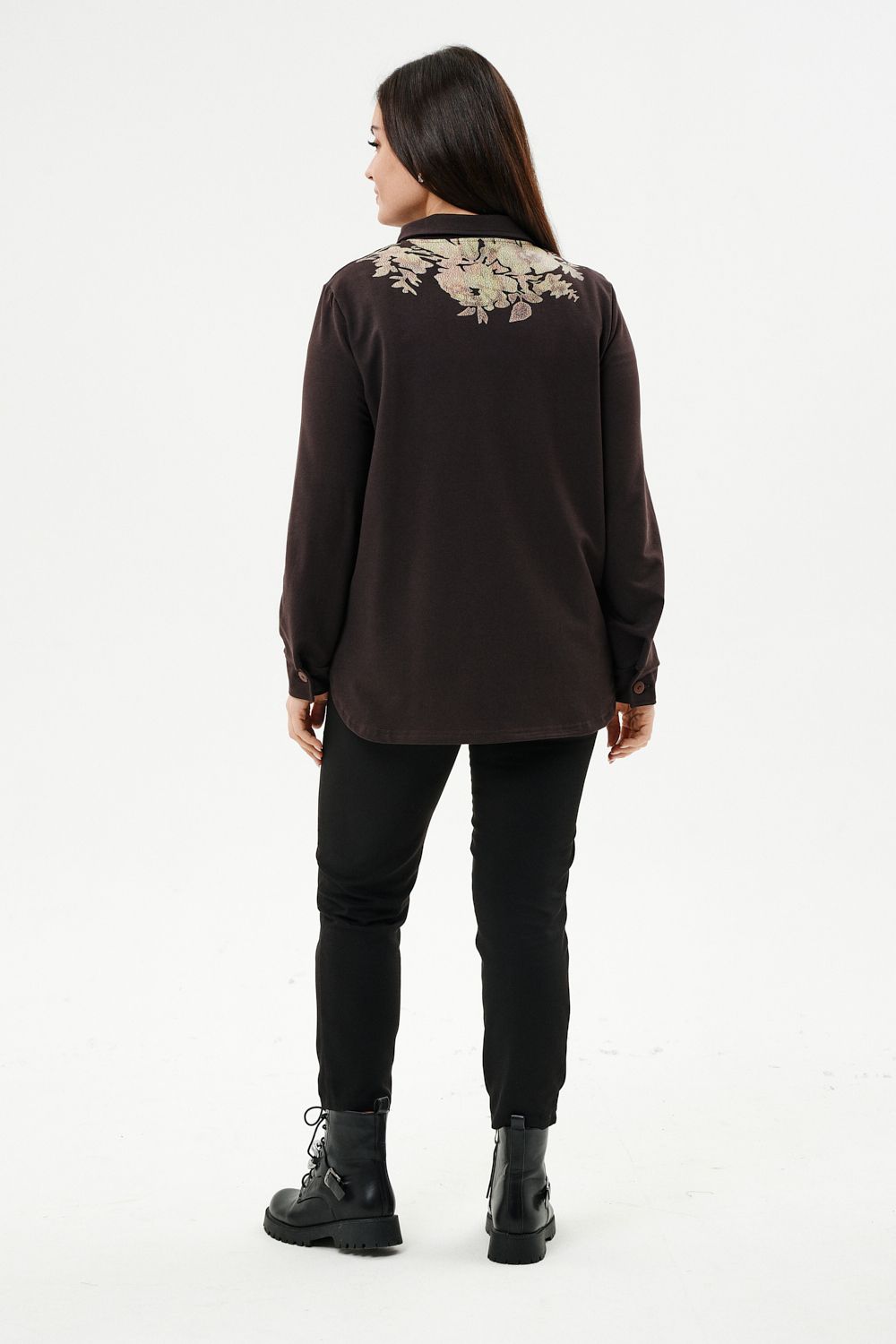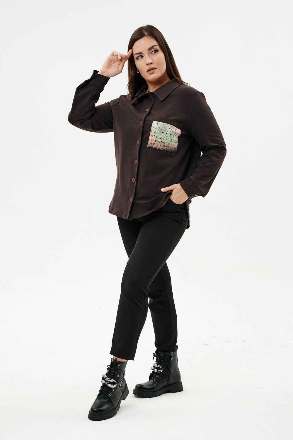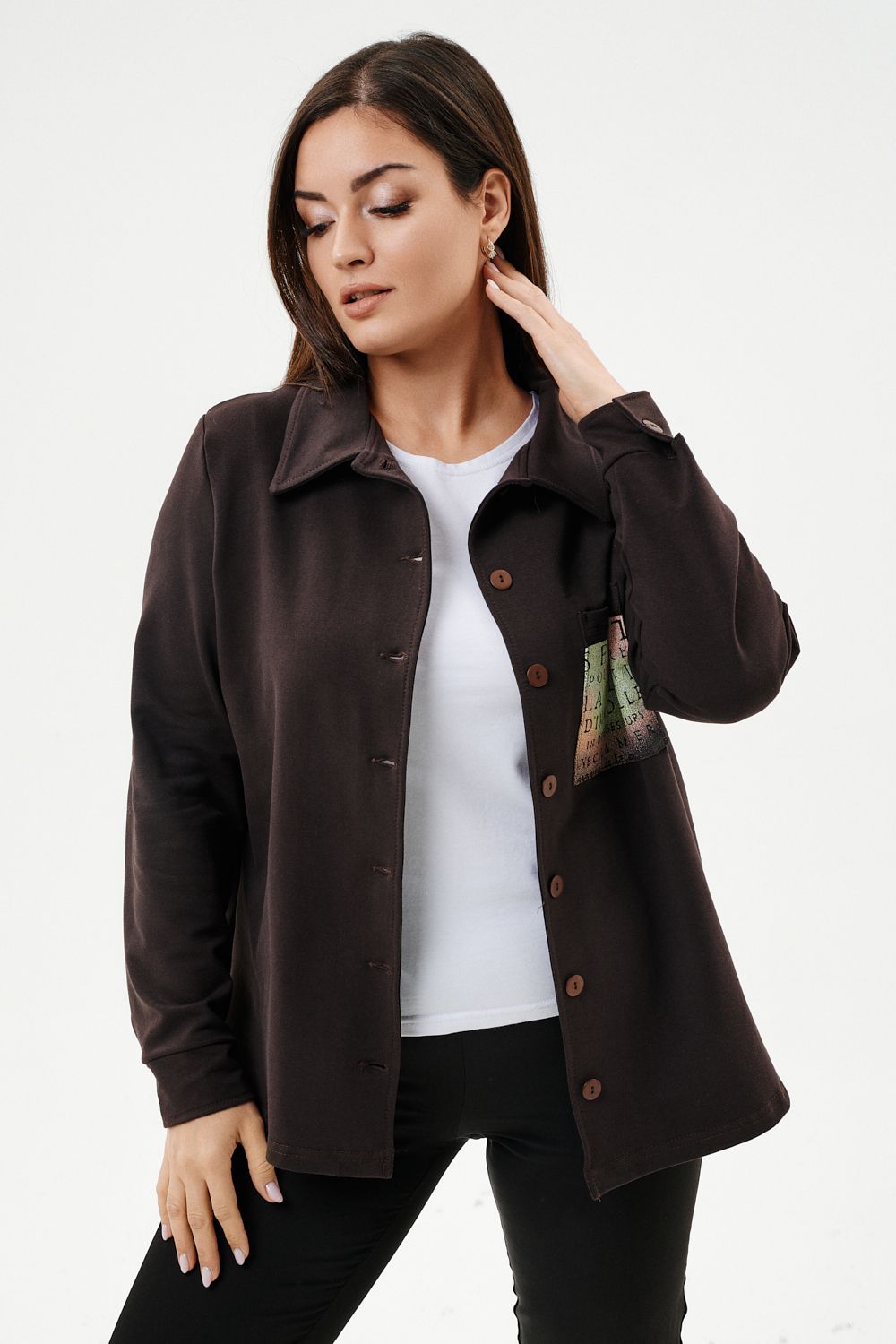 Туника женская прямого силуэта. Воротник отложной. Застежка на петли-пуговицы. Низ фигурный. Рукав втачной с манжетою. На левой части полочки нагрудный карман. Стилизованный принт в верхней части спинки, под воротником и на нагрудном кармане.