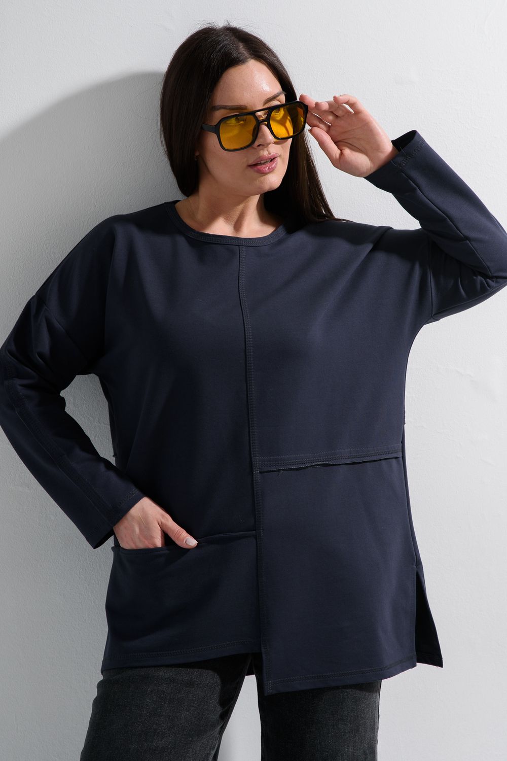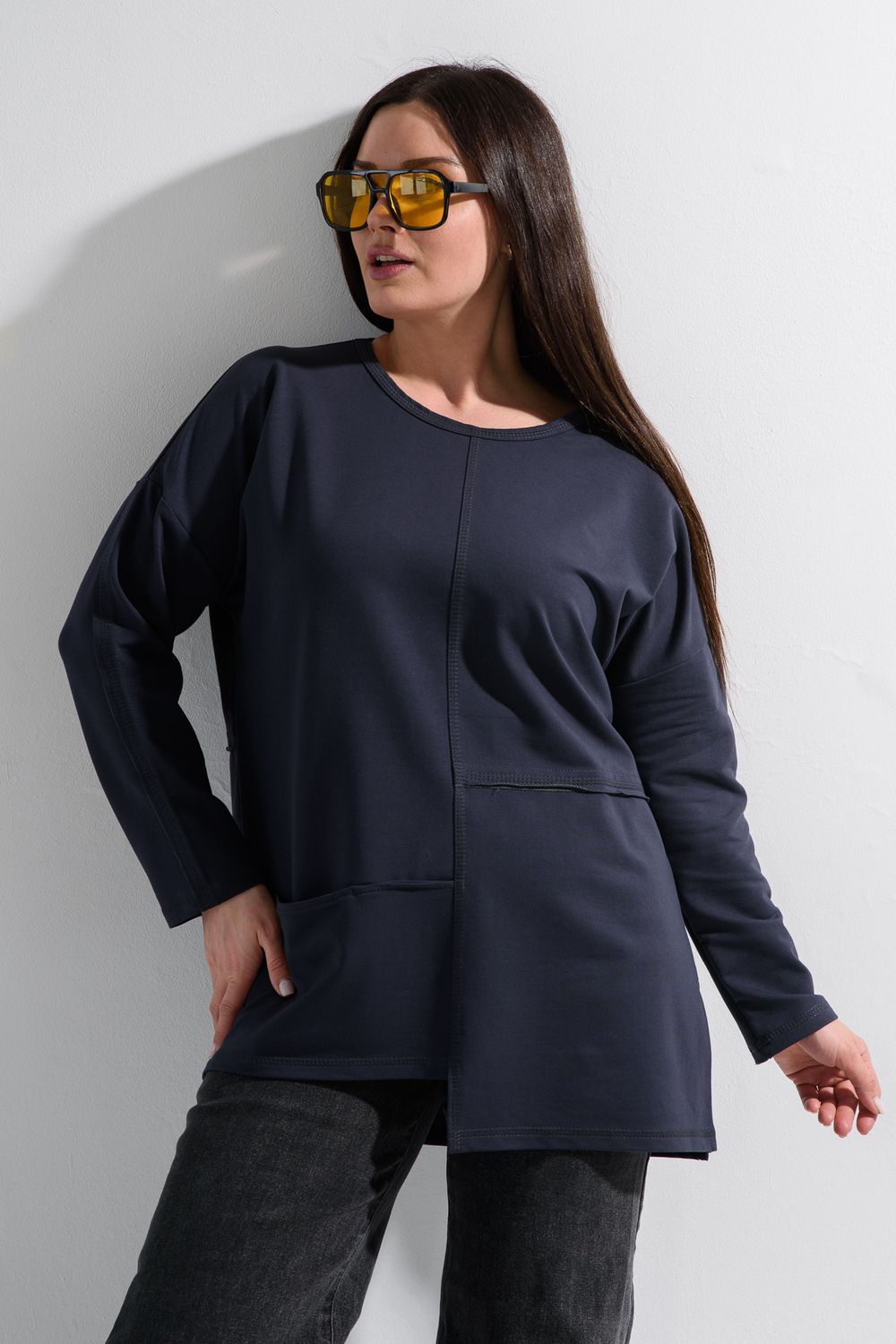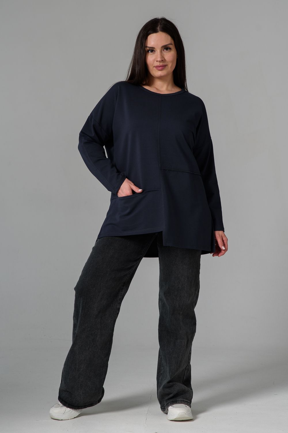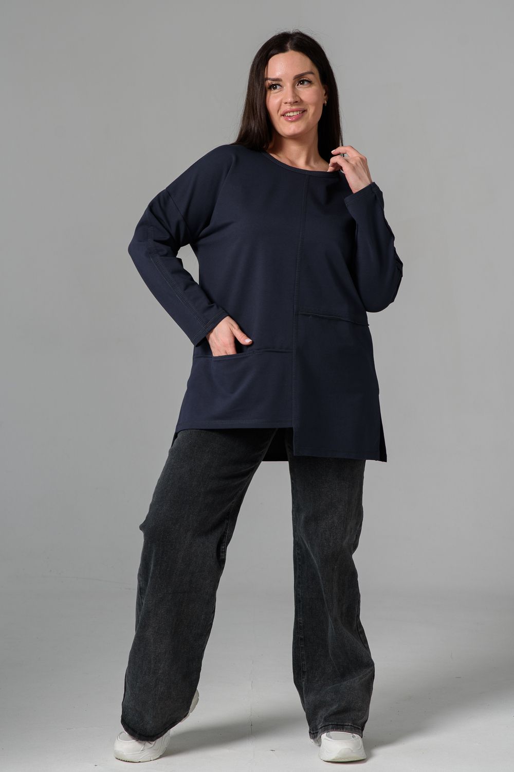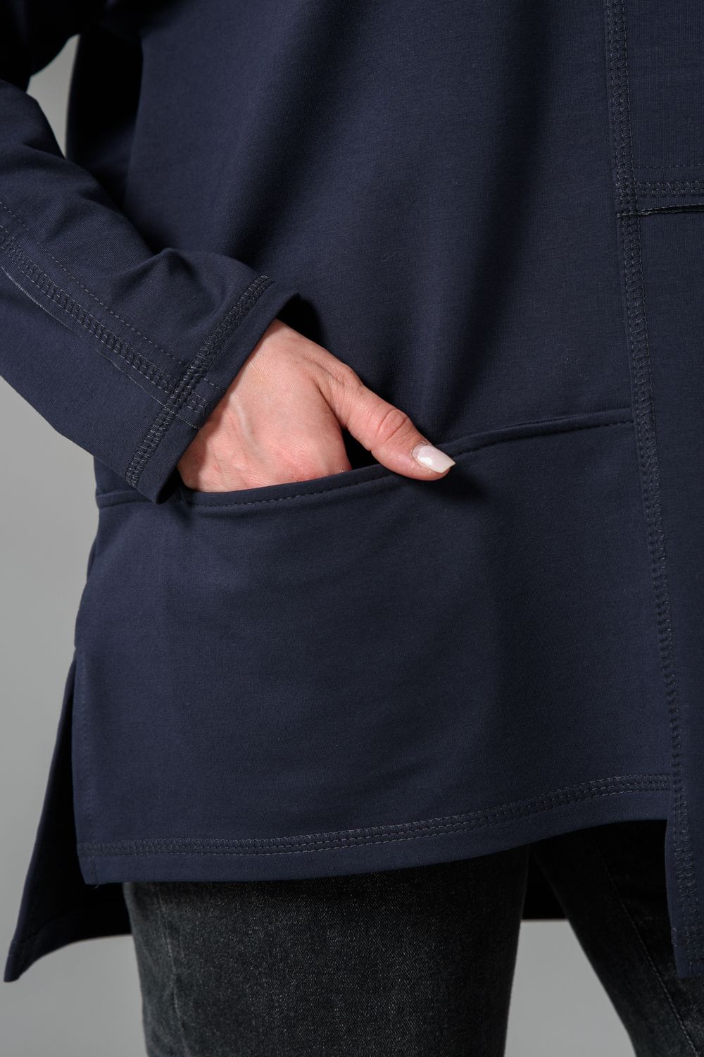 Туника прямого силуэта, горловина круглая, рукав длинный, цельнокроенный со швом, состоит из передней и задней частей. Полочка из четырех частей: на правой части внутренний горизонтальный карман в шве, на левой горизонтальный шов с открытыми срезами, аналогичный шов на спинке. В боковых швах разрезы.