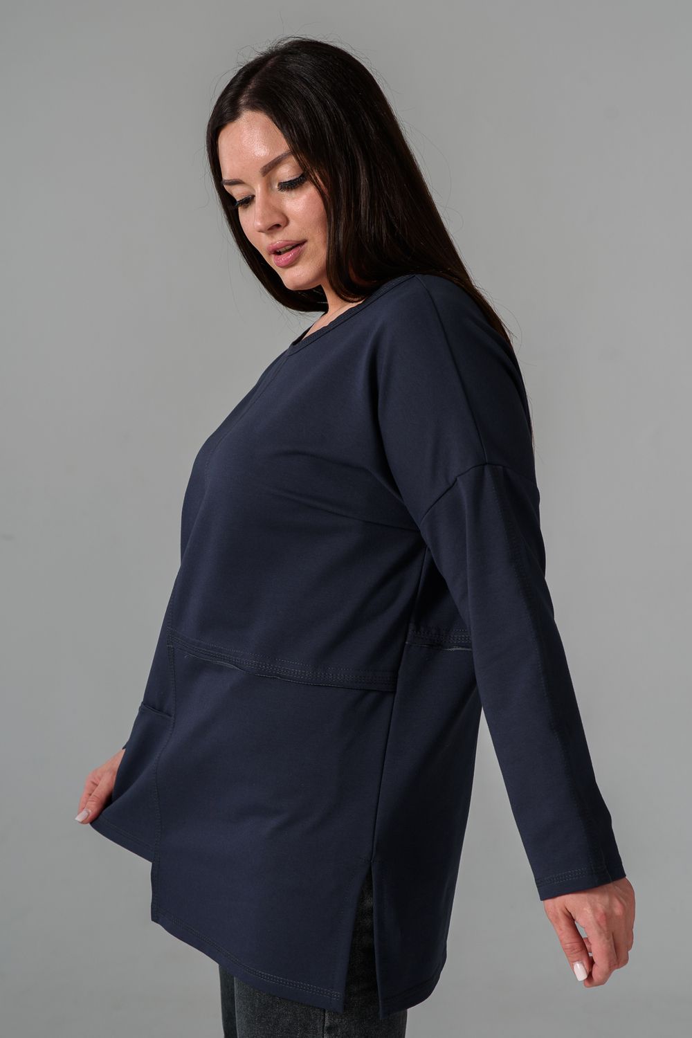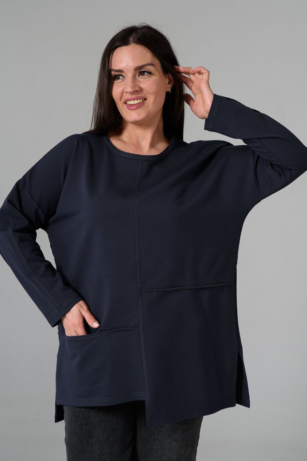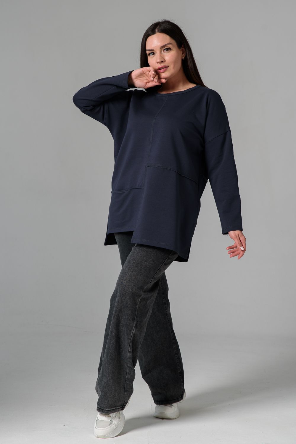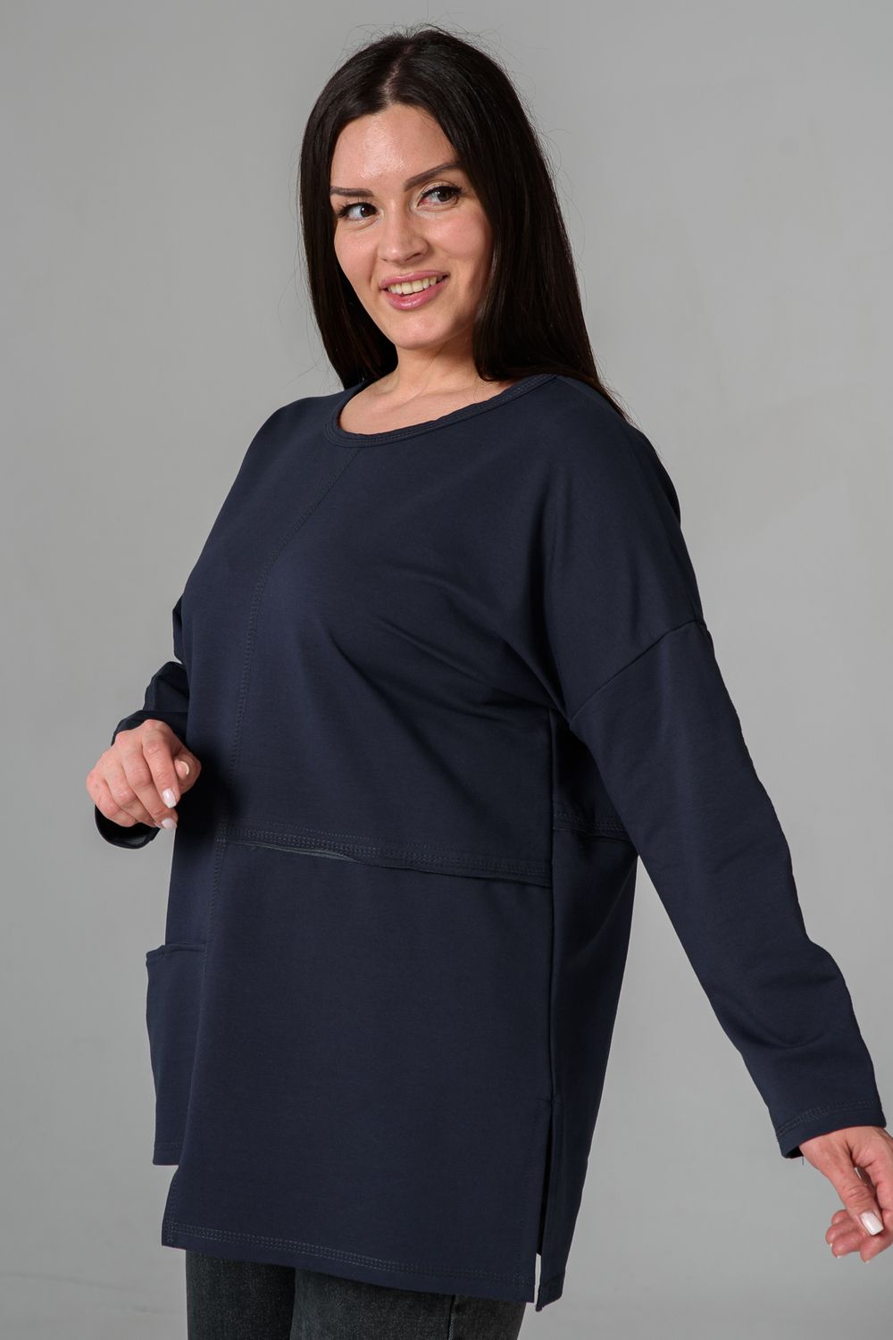 Туника прямого силуэта, горловина круглая, рукав длинный, цельнокроенный со швом, состоит из передней и задней частей. Полочка из четырех частей: на правой части внутренний горизонтальный карман в шве, на левой горизонтальный шов с открытыми срезами, аналогичный шов на спинке. В боковых швах разрезы.
