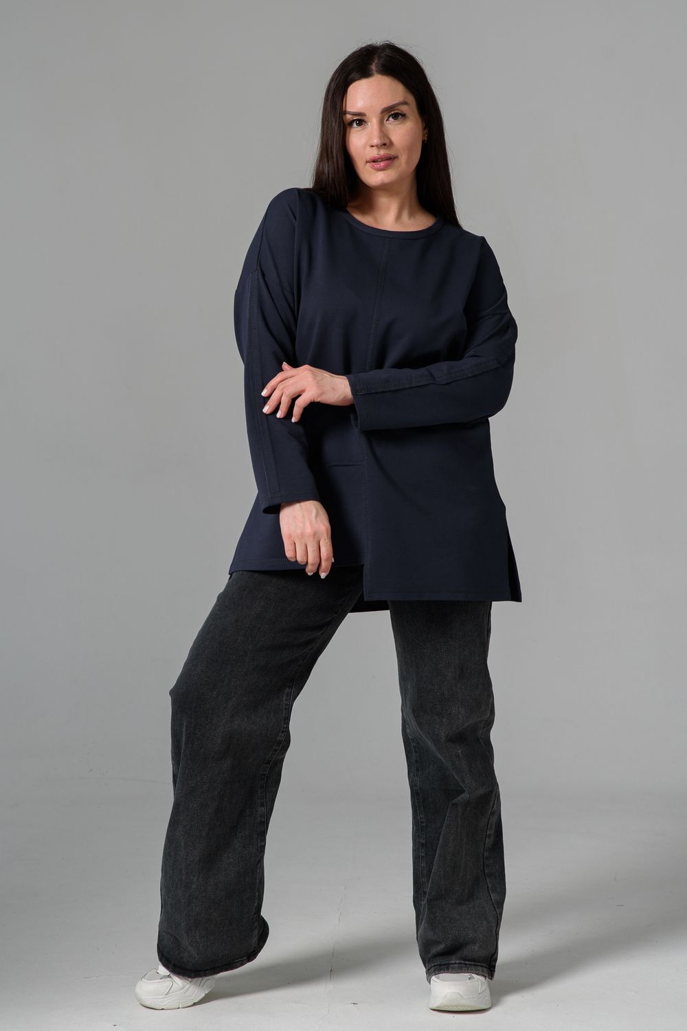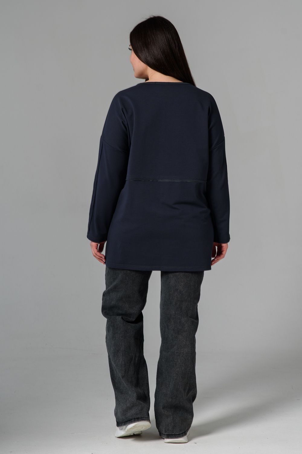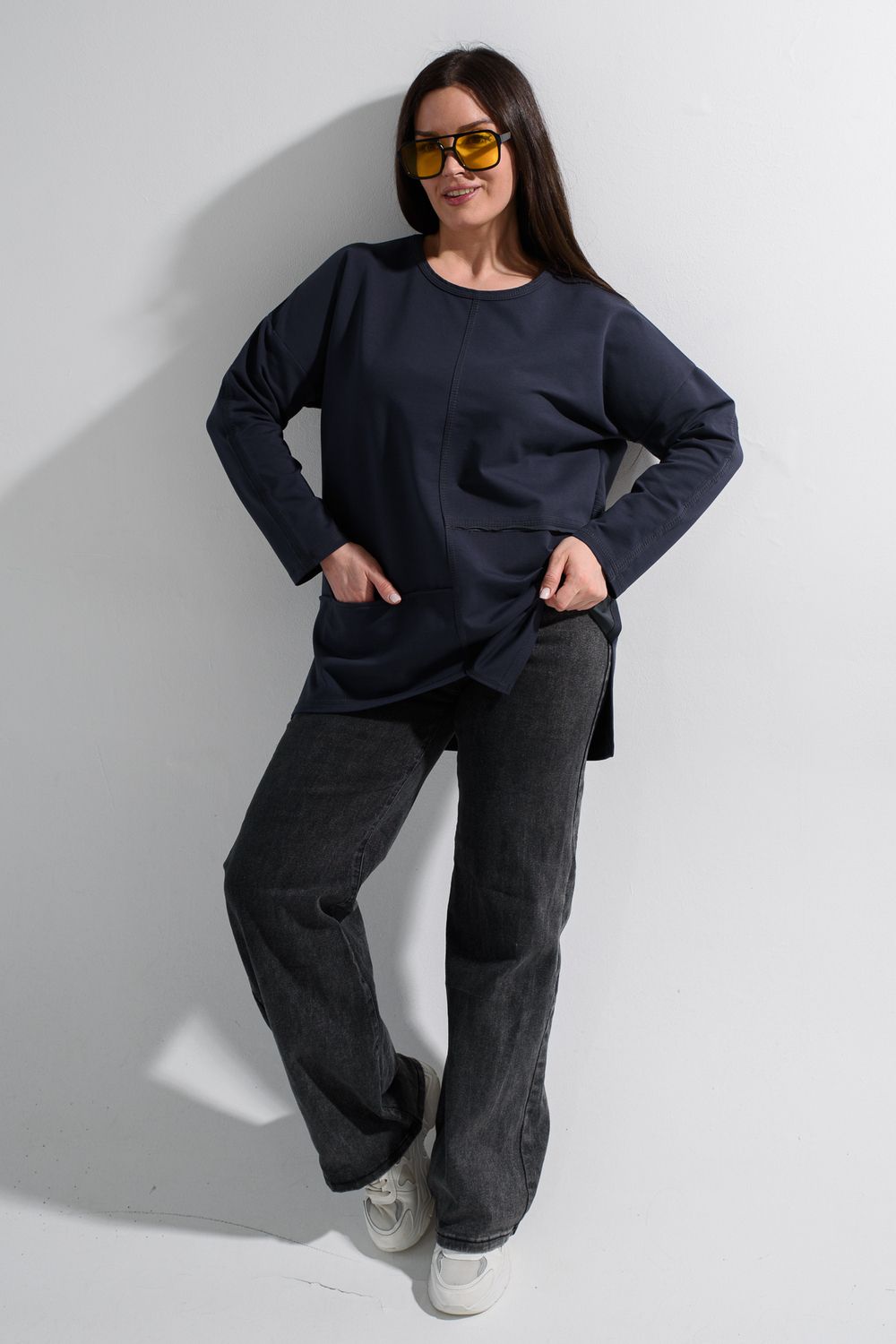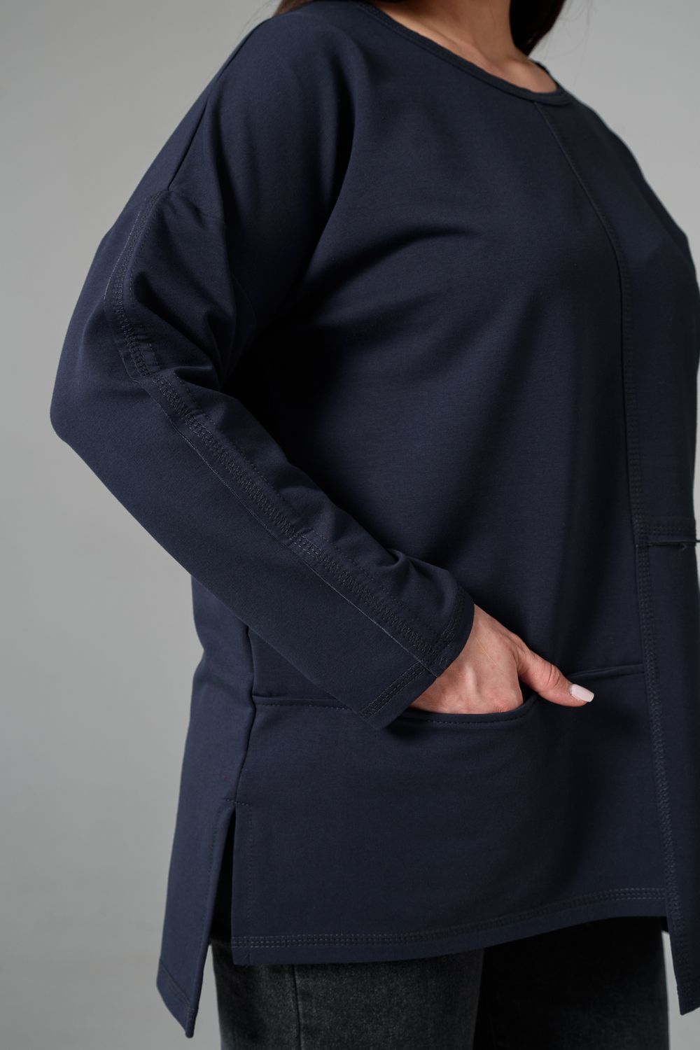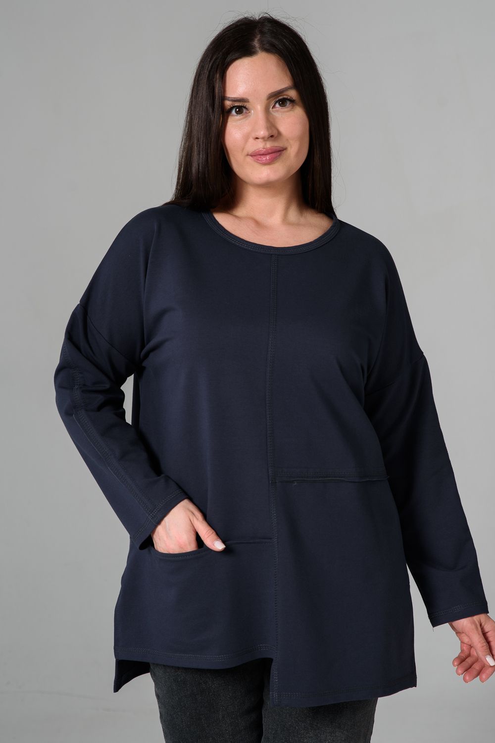 Туника прямого силуэта, горловина круглая, рукав длинный, цельнокроенный со швом, состоит из передней и задней частей. Полочка из четырех частей: на правой части внутренний горизонтальный карман в шве, на левой горизонтальный шов с открытыми срезами, аналогичный шов на спинке. В боковых швах разрезы.