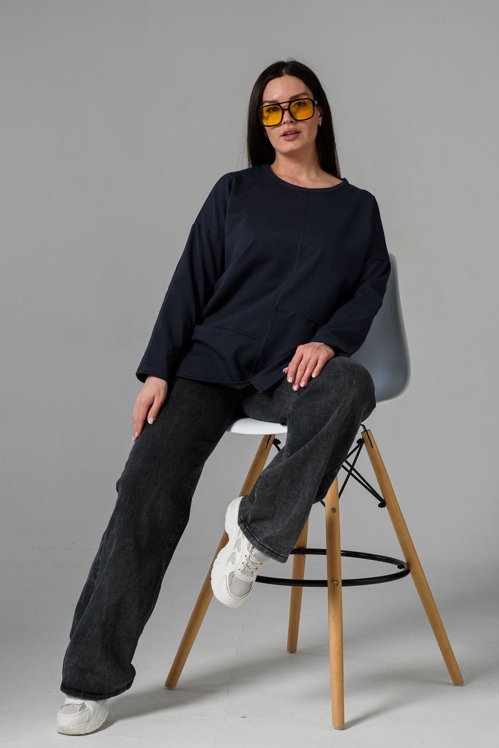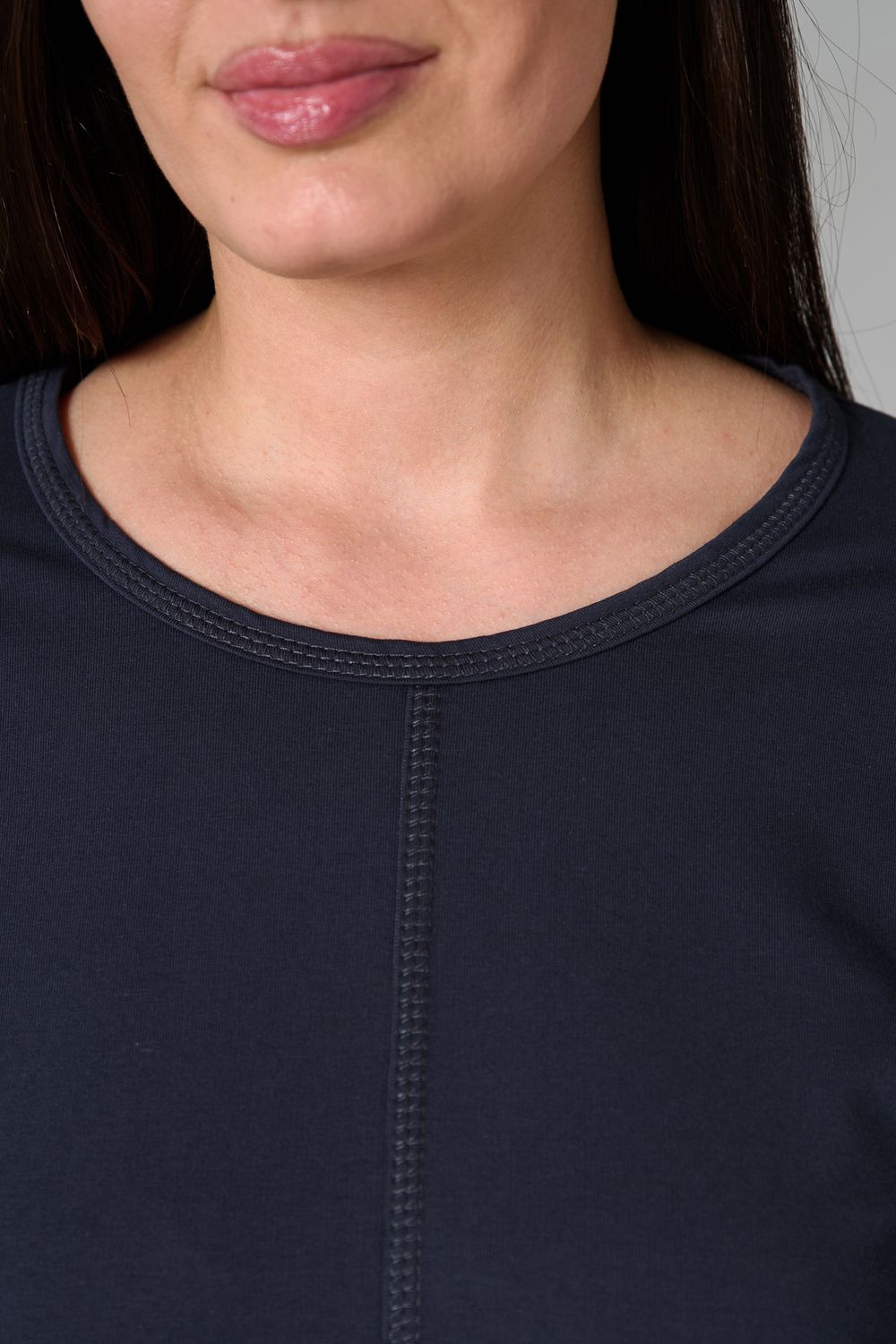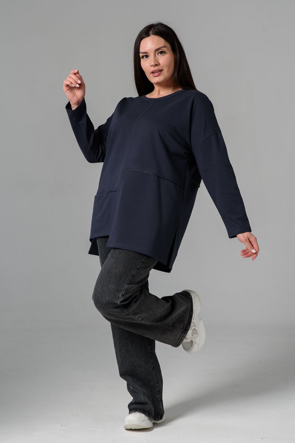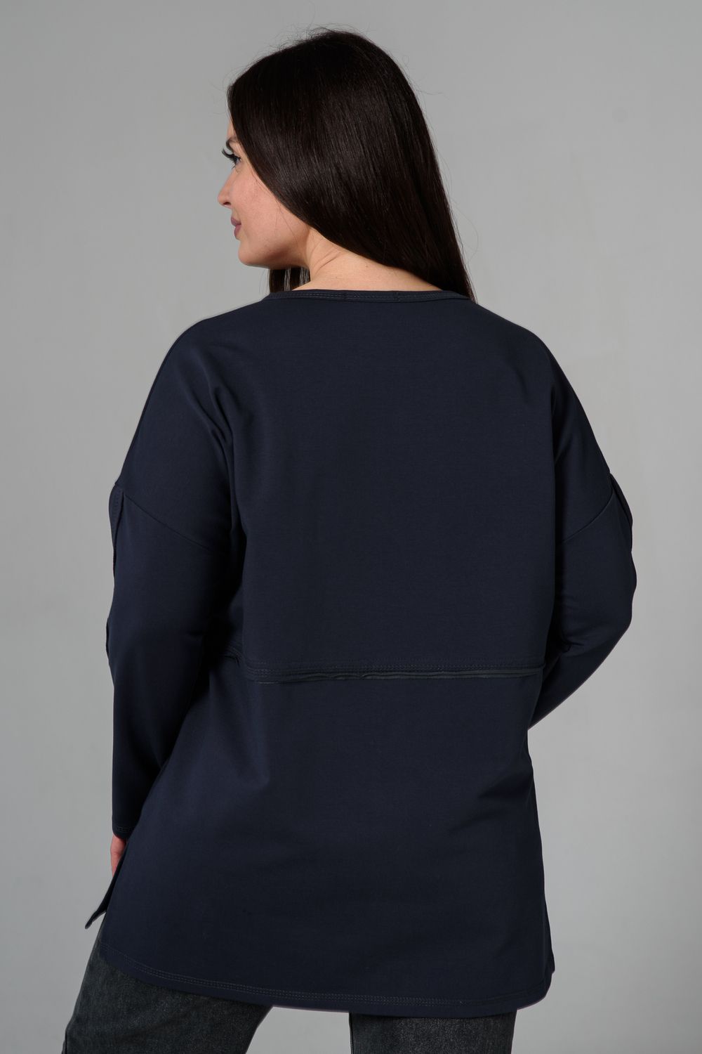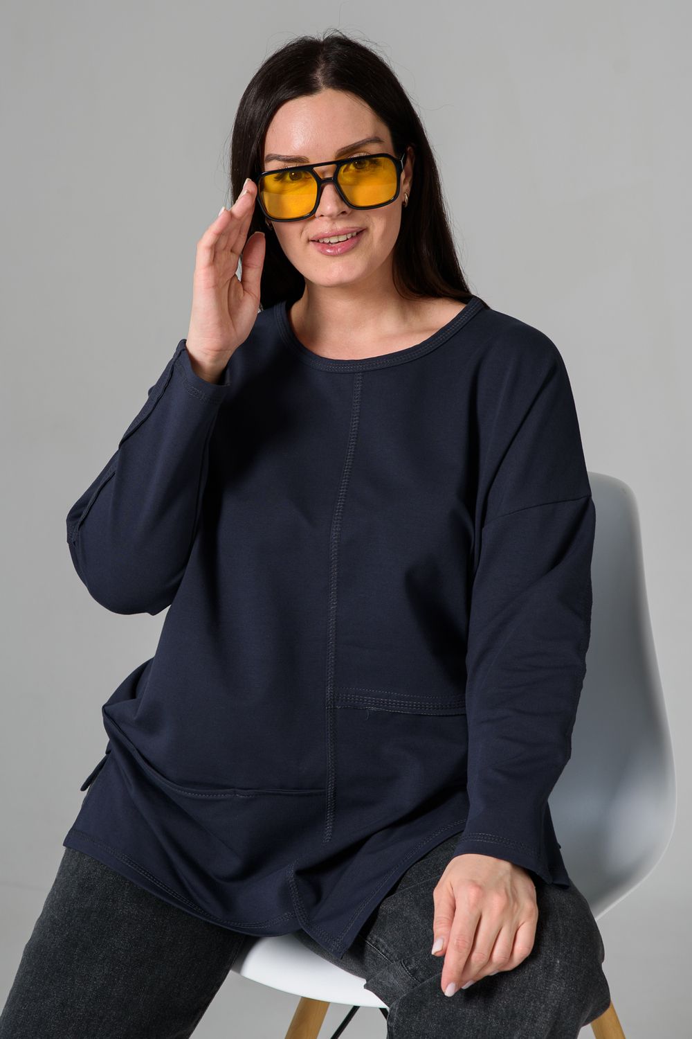Туника прямого силуэта, горловина круглая, рукав длинный, цельнокроенный со швом, состоит из передней и задней частей. Полочка из четырех частей: на правой части внутренний горизонтальный карман в шве, на левой горизонтальный шов с открытыми срезами, аналогичный шов на спинке. В боковых швах разрезы.