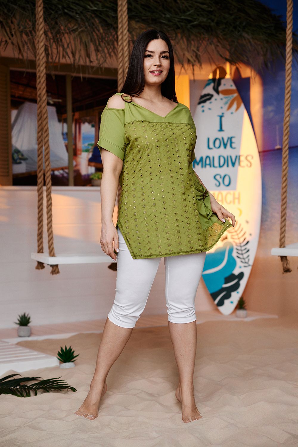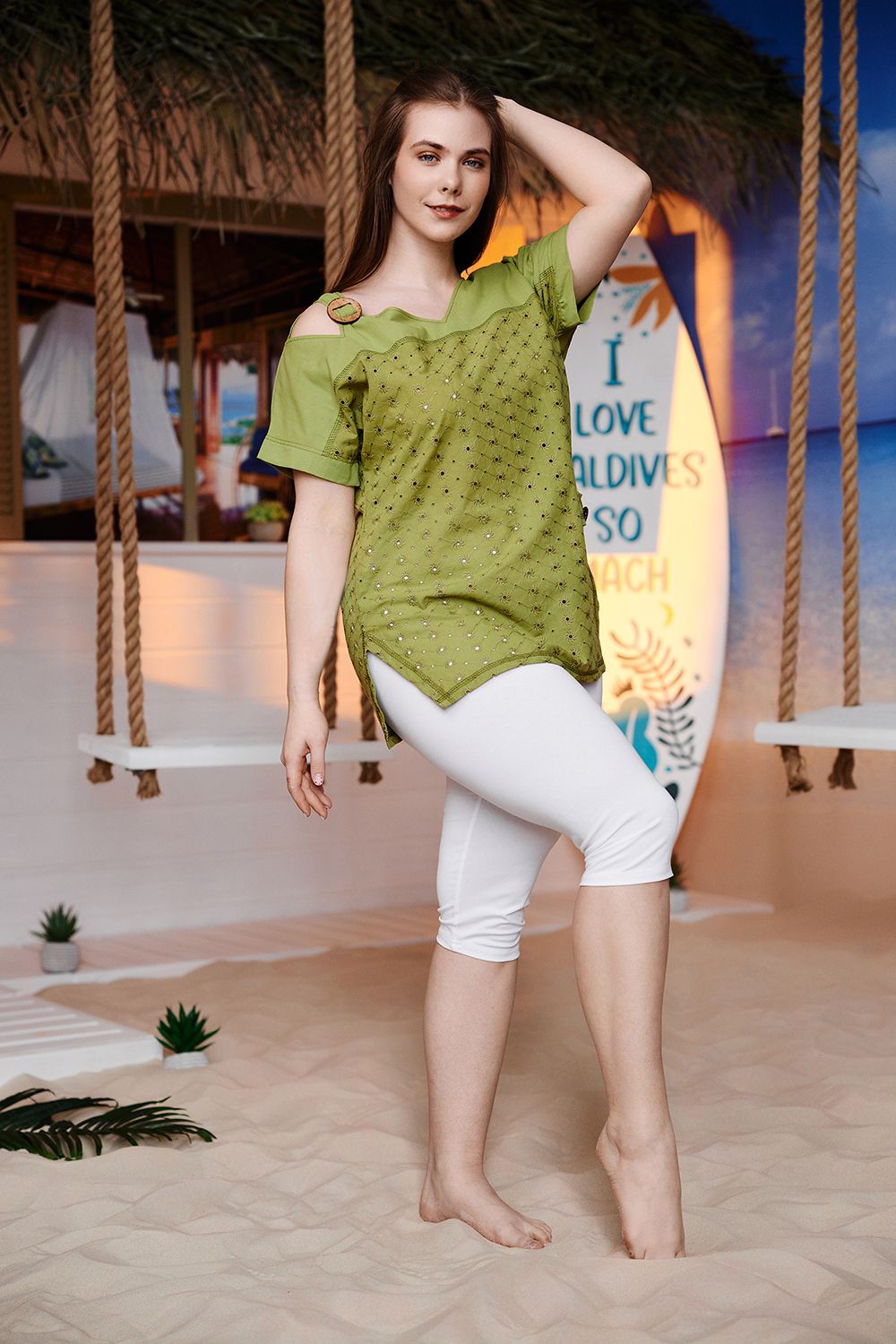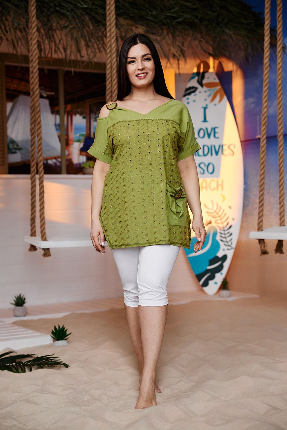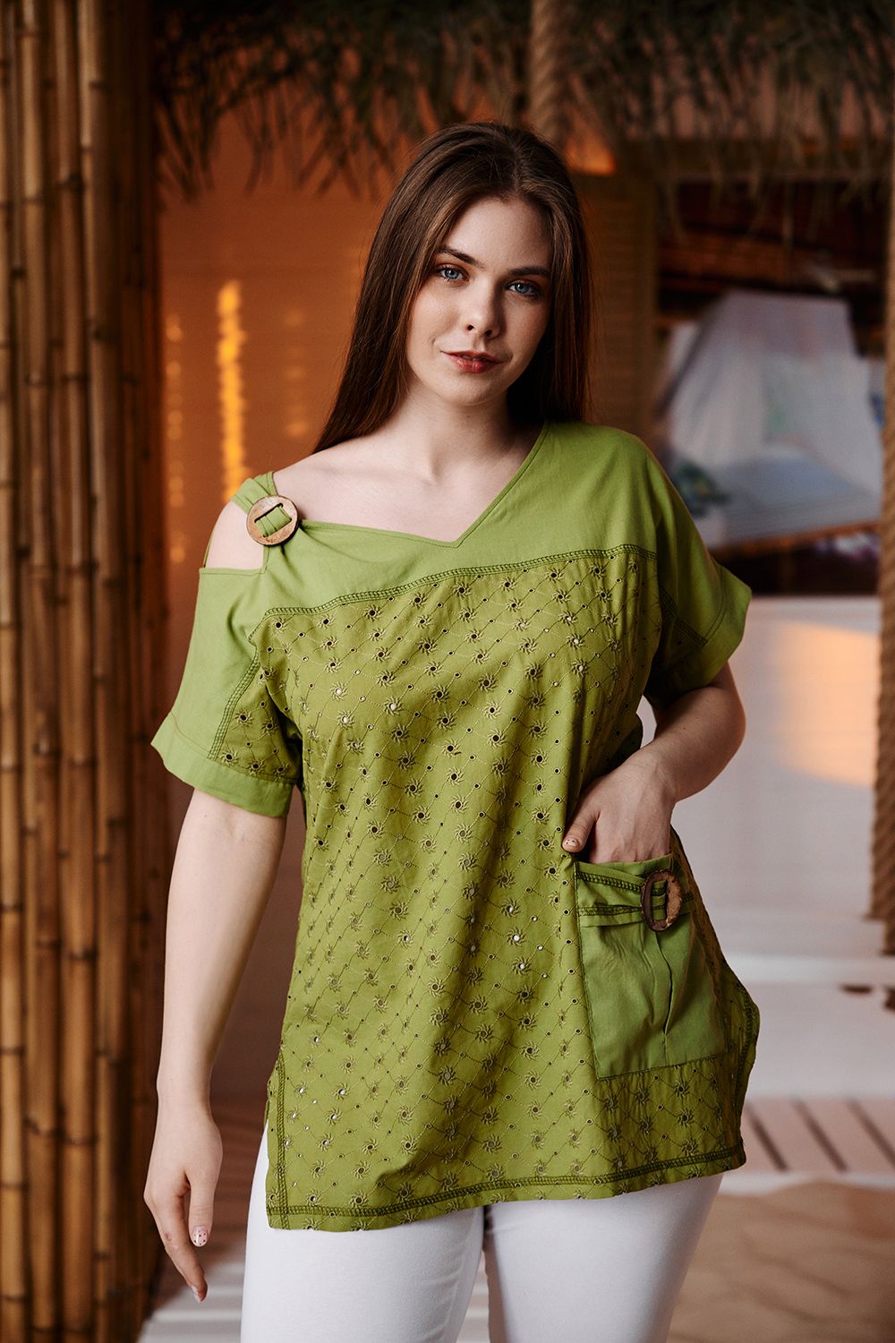 Туника женская, полуприлегающего силуэта. Вырез асимметричный, с одной стороны бретель с кокосовой пуговицей. На полочке и спинке кокетка из отделочной ткани. Рукав цельнокроеный до локтя на манжете. На полочке накладной карман со складкой и декоративной пуговицей.