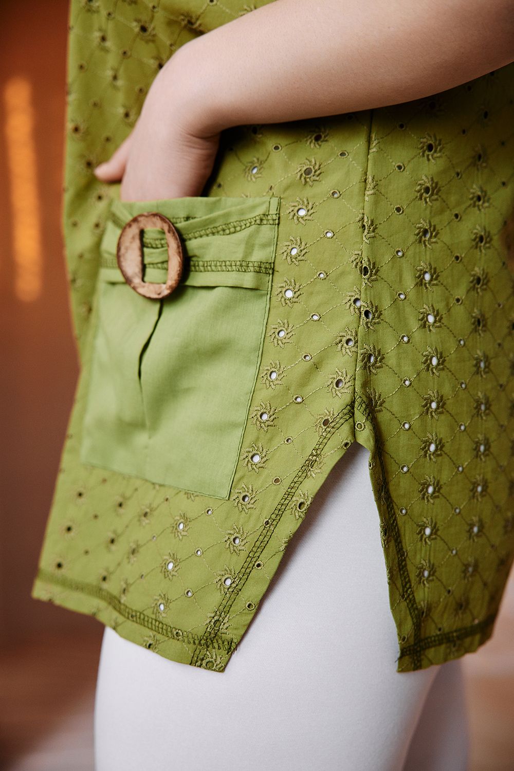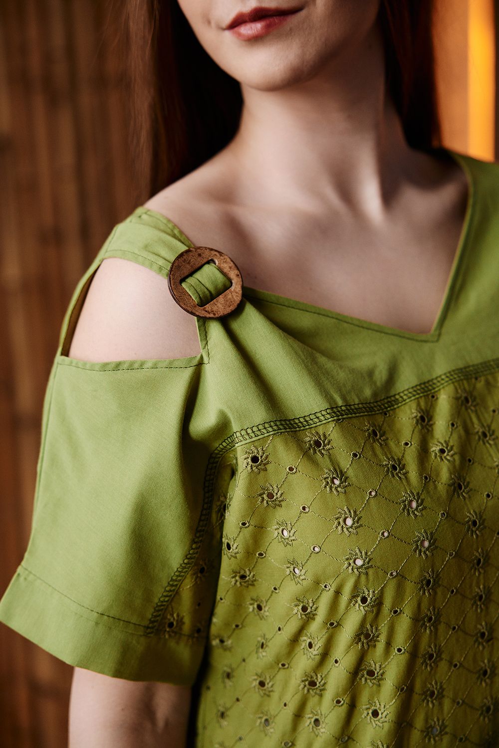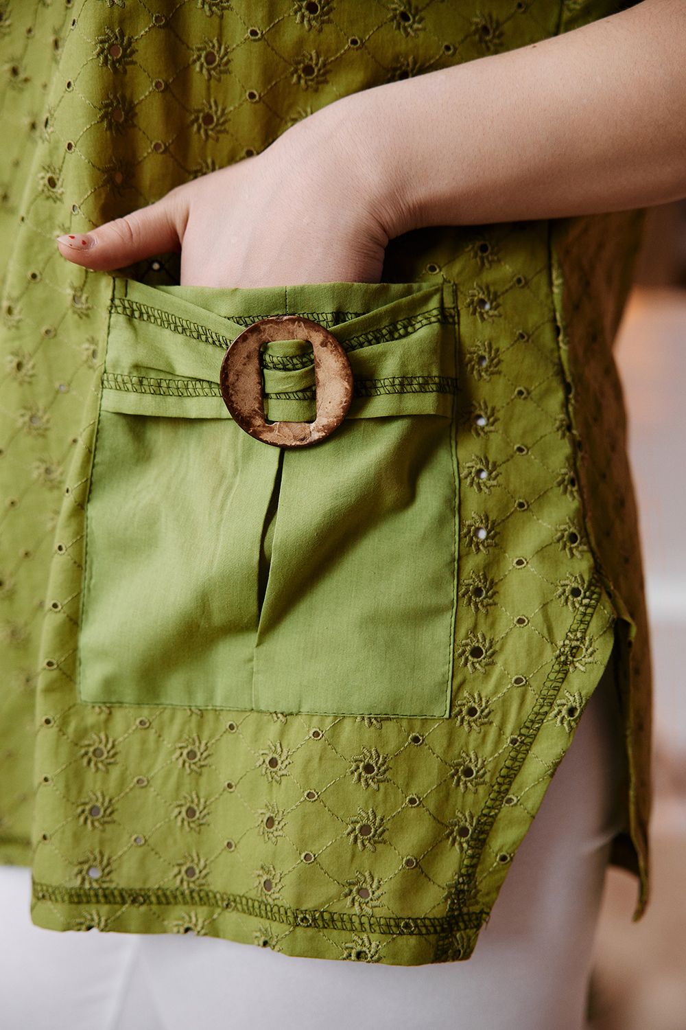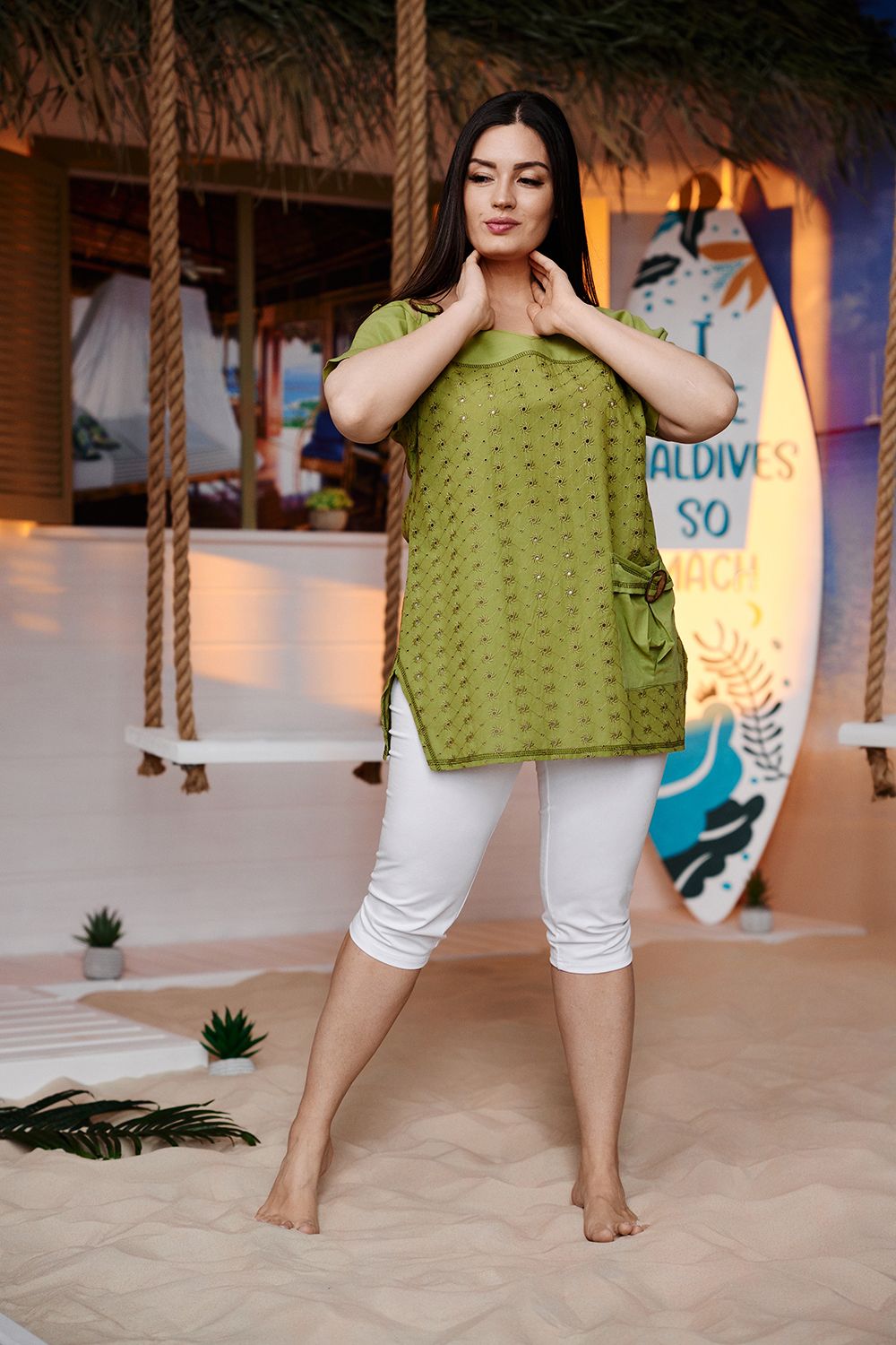 Туника женская, полуприлегающего силуэта. Вырез асимметричный, с одной стороны бретель с кокосовой пуговицей. На полочке и спинке кокетка из отделочной ткани. Рукав цельнокроеный до локтя на манжете. На полочке накладной карман со складкой и декоративной пуговицей.