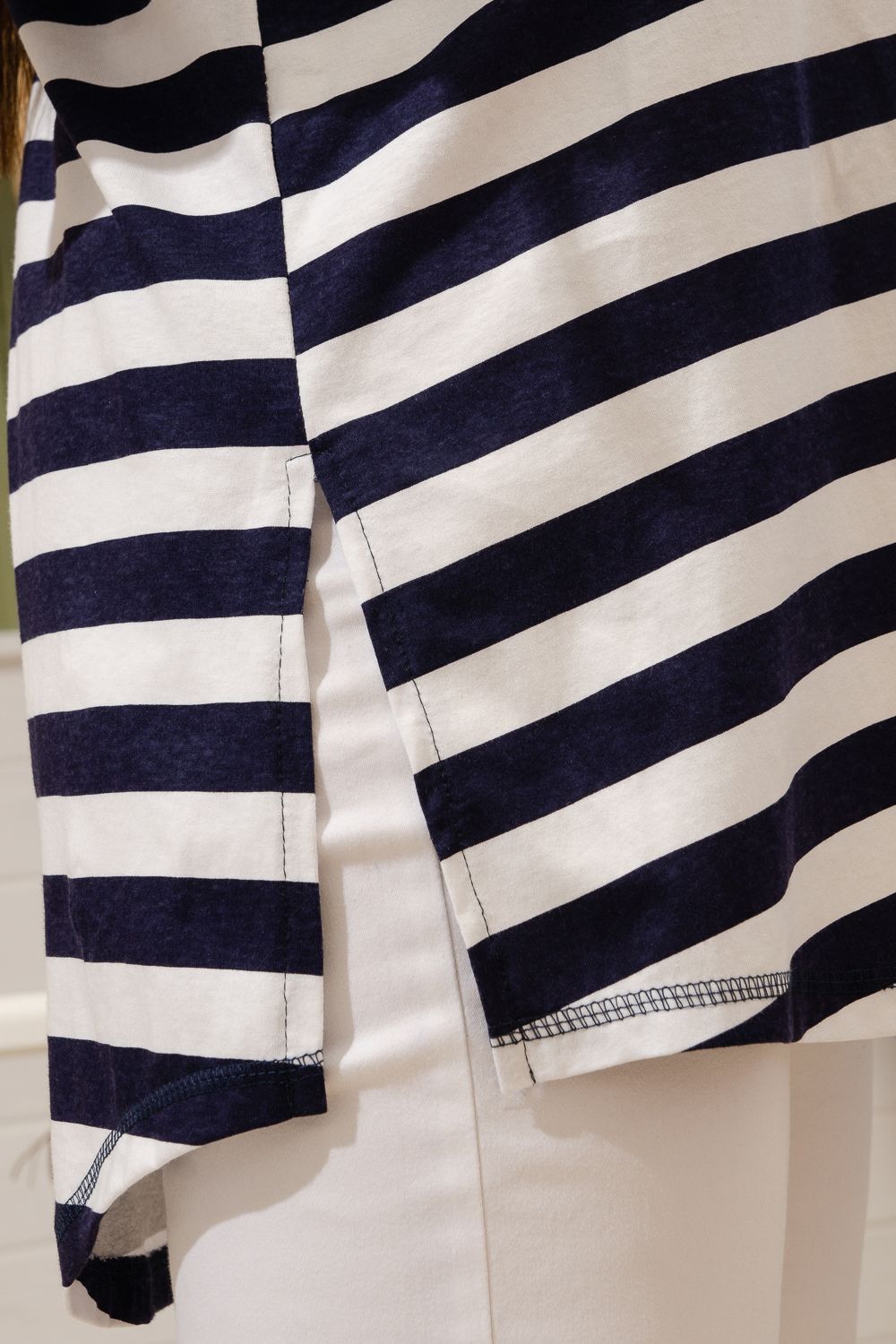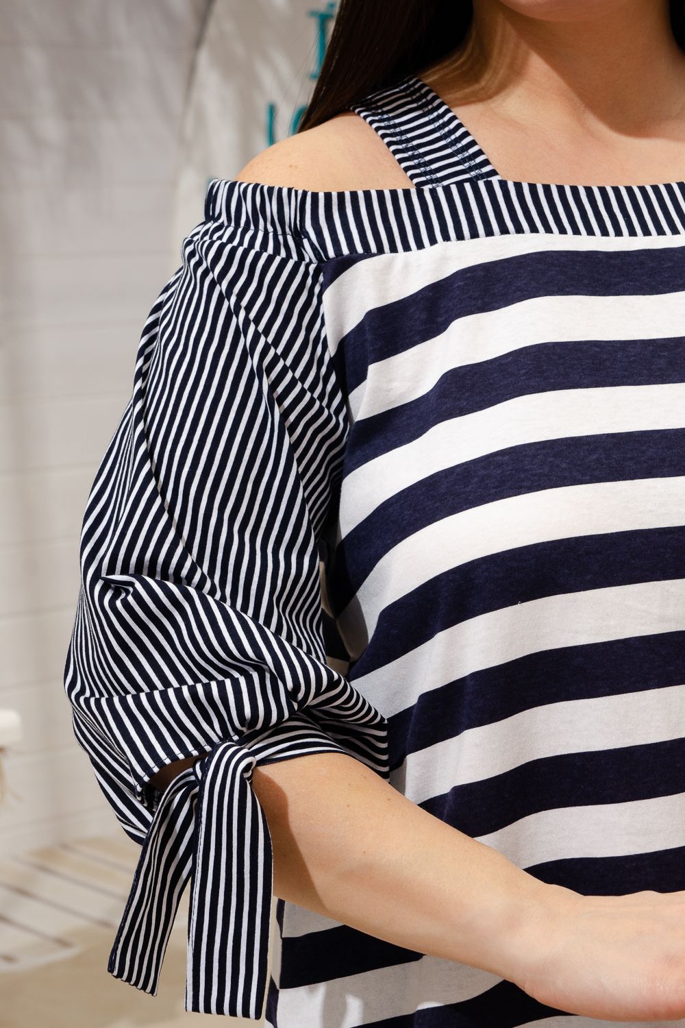 Туника с открытыми плечами на широких бретелях, расширенная к низу, в боковых швах разрезы, рукав ниже локтя, по низу рукава сборка, манжета с завязками. Сочетание в тунике крупной и мелкой полосы придает изделию особую неповторимость, морской стиль особенно актуален для лета.