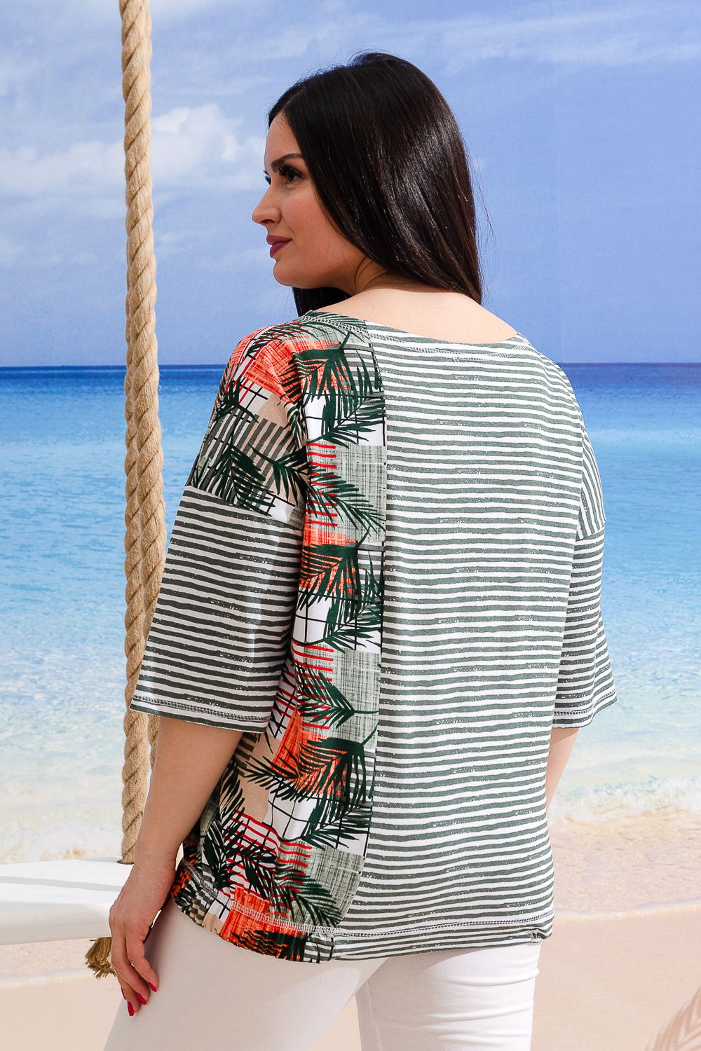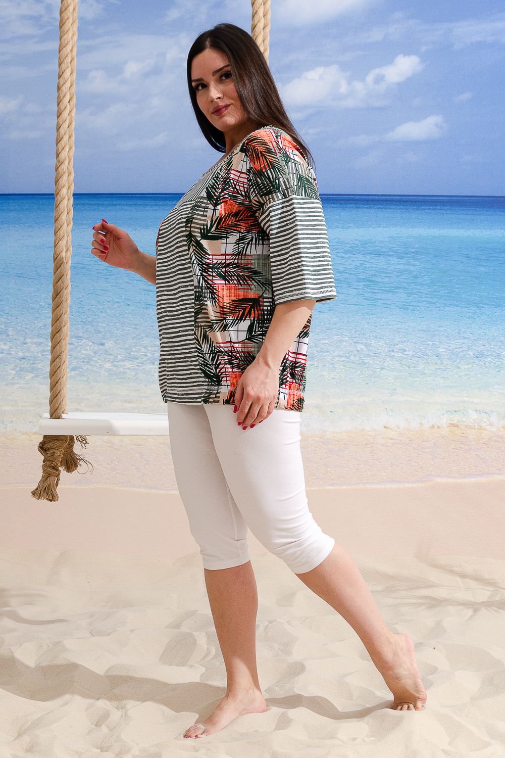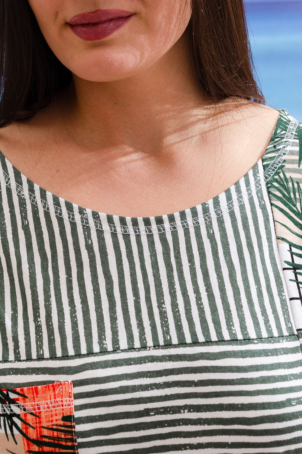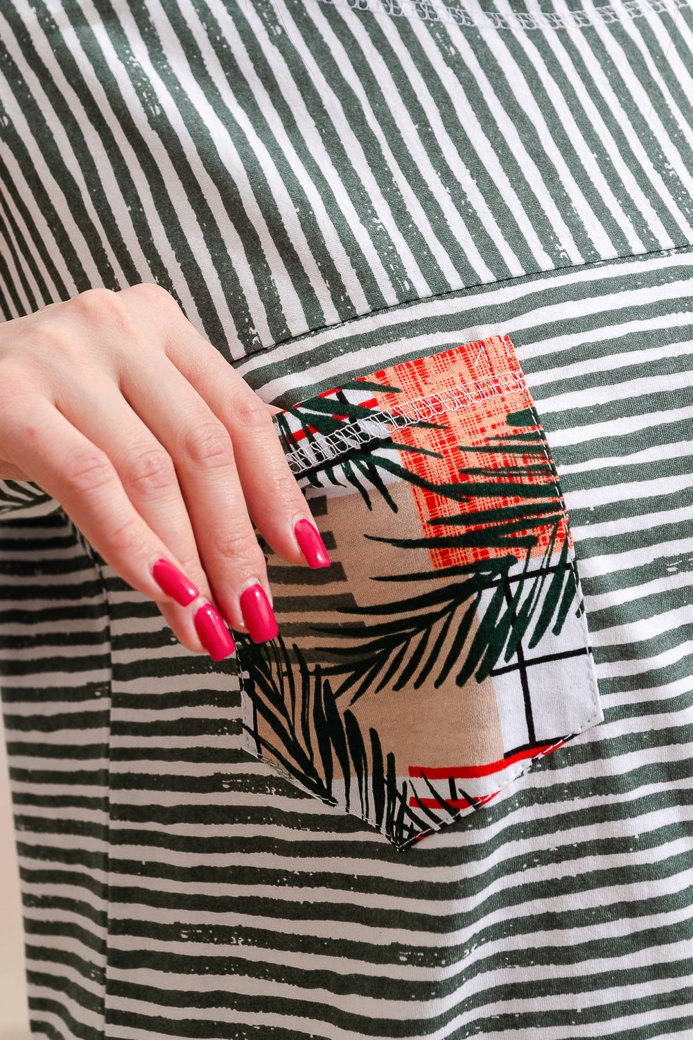 Туника женская, прямого силуэта. Горловина округлая, Рукав цельнокроенный со швом. Полочка состоит из трех частей, Спинка из двух, где удачно сочетаются ткани - компаньоны: средняя полоса и пальмы. На полочке нагрудный накладной карман. Низ туники с одной стороны собран на эластичную тесьму, с другой стороны: в люверсы продета бейка-утяжка.