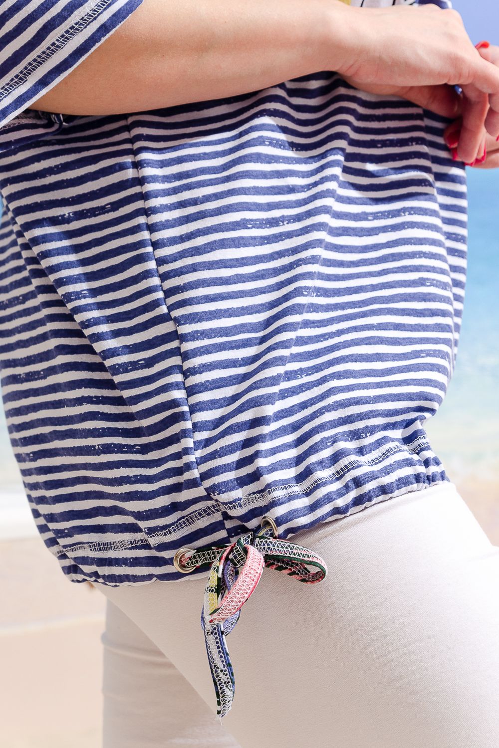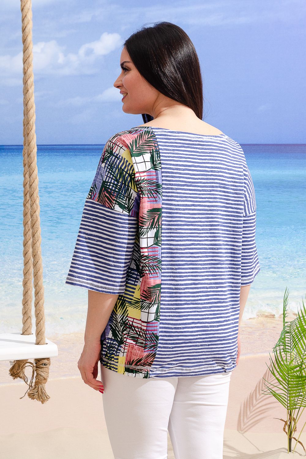 Туника женская, прямого силуэта. Горловина округлая, Рукав цельнокроенный со швом. Полочка состоит из трех частей, Спинка из двух, где удачно сочетаются ткани - компаньоны: средняя полоса и пальмы. На полочке нагрудный накладной карман. Низ туники с одной стороны собран на эластичную тесьму, с другой стороны: в люверсы продета бейка-утяжка.