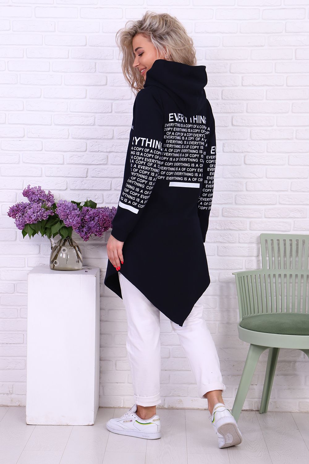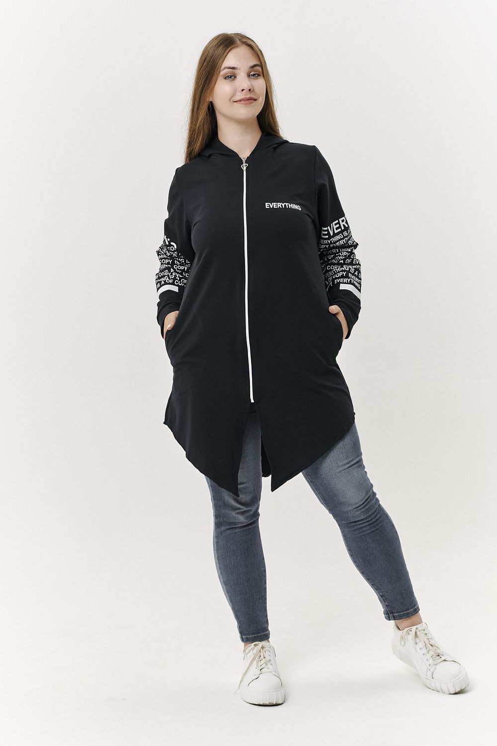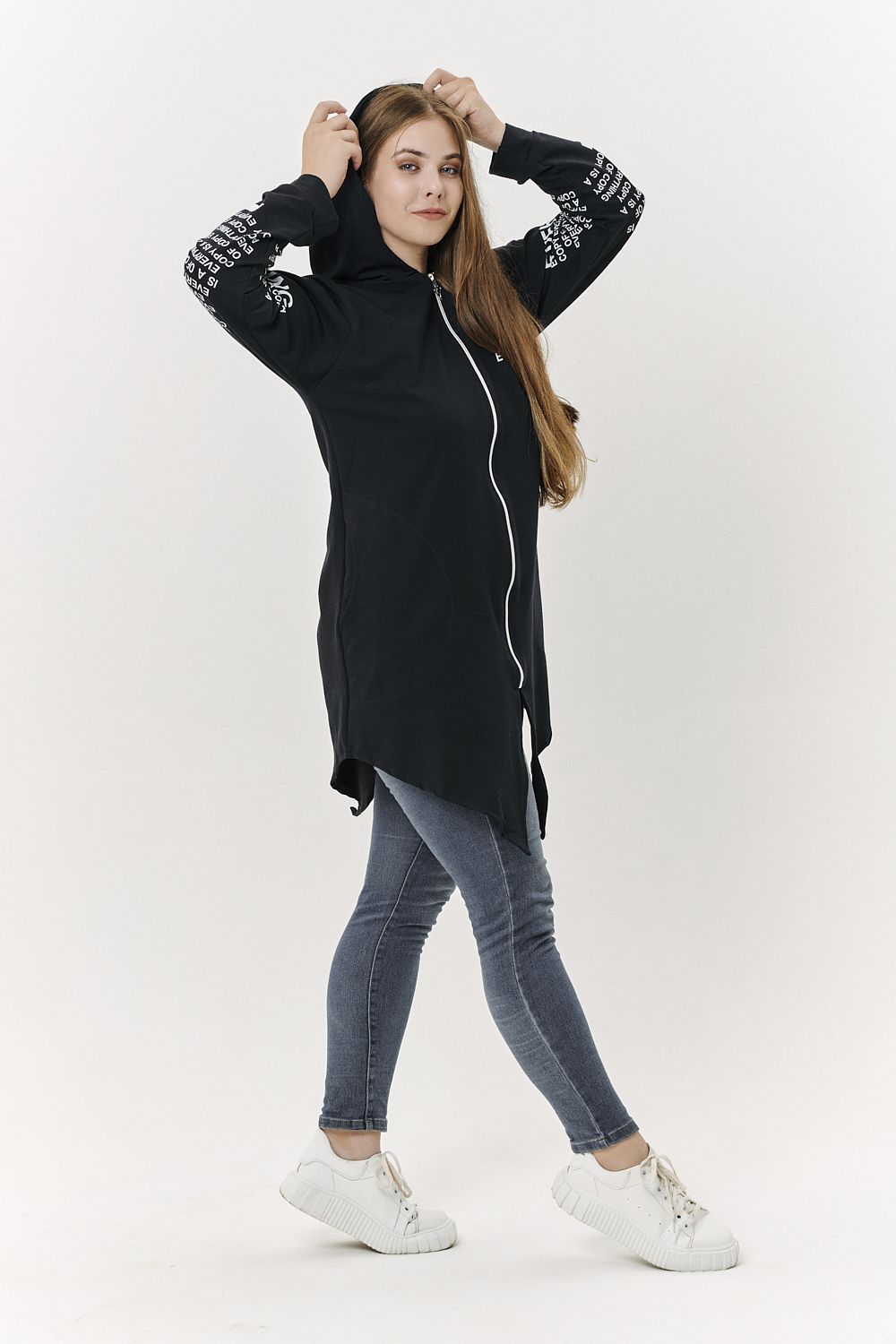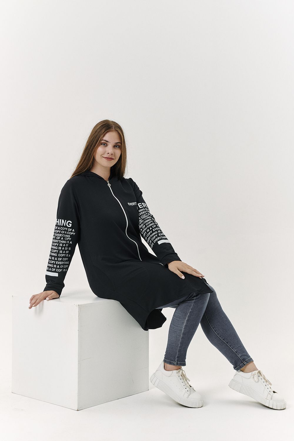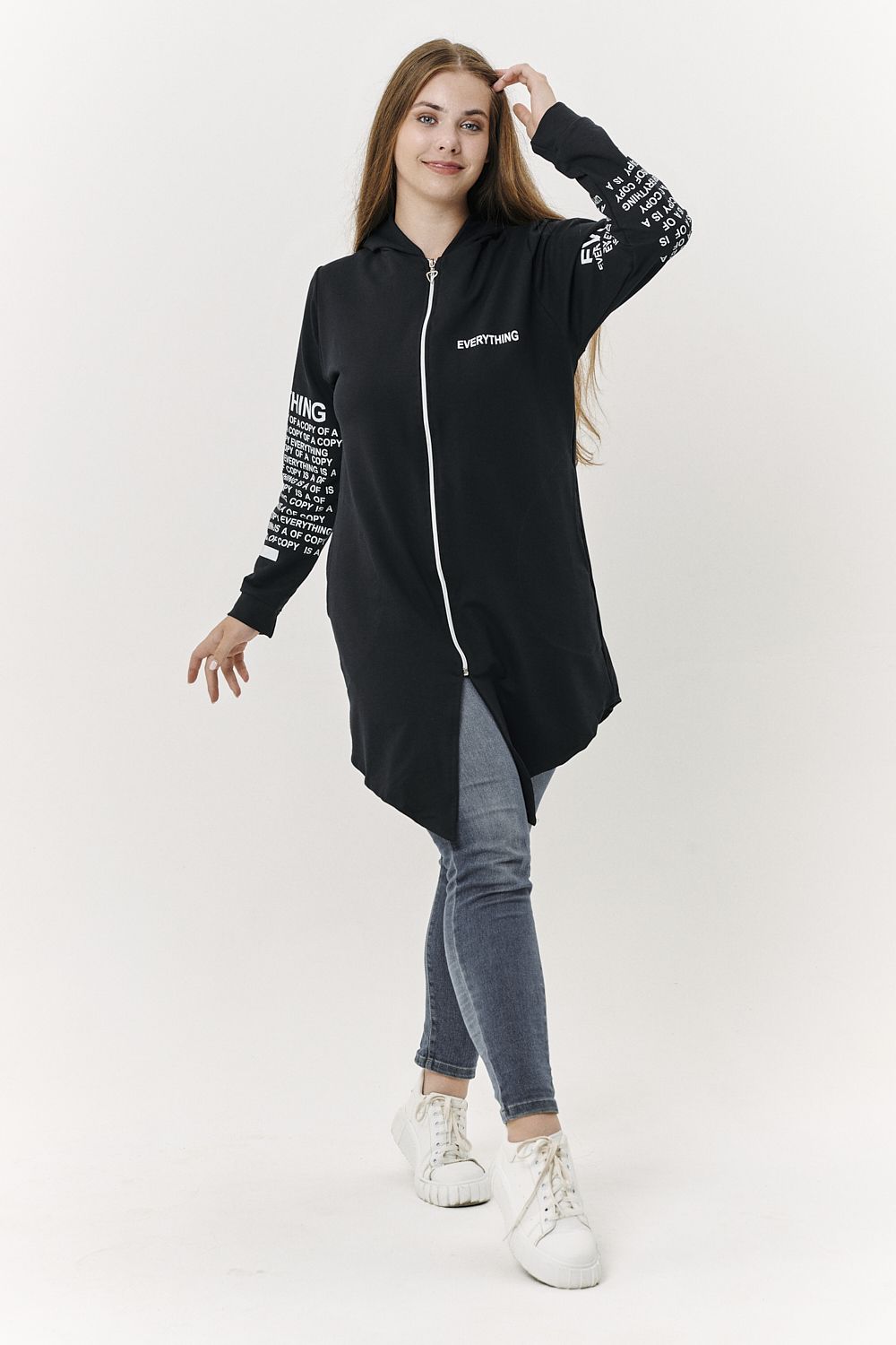Туника необычного кроя из футера с лайкрой. Длинные рукава, общая длина до коленей спереди, более коротко по бокам. На молнии, с капюшоном. Дизайн в виде принтов с надписями