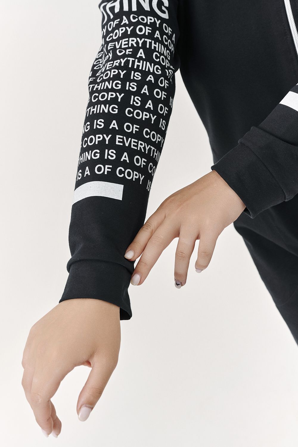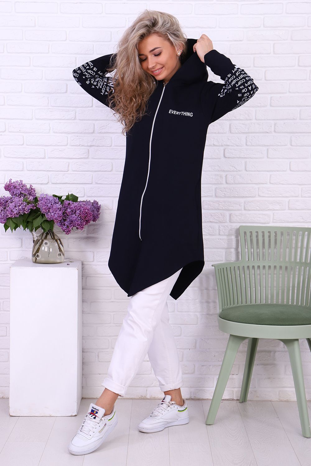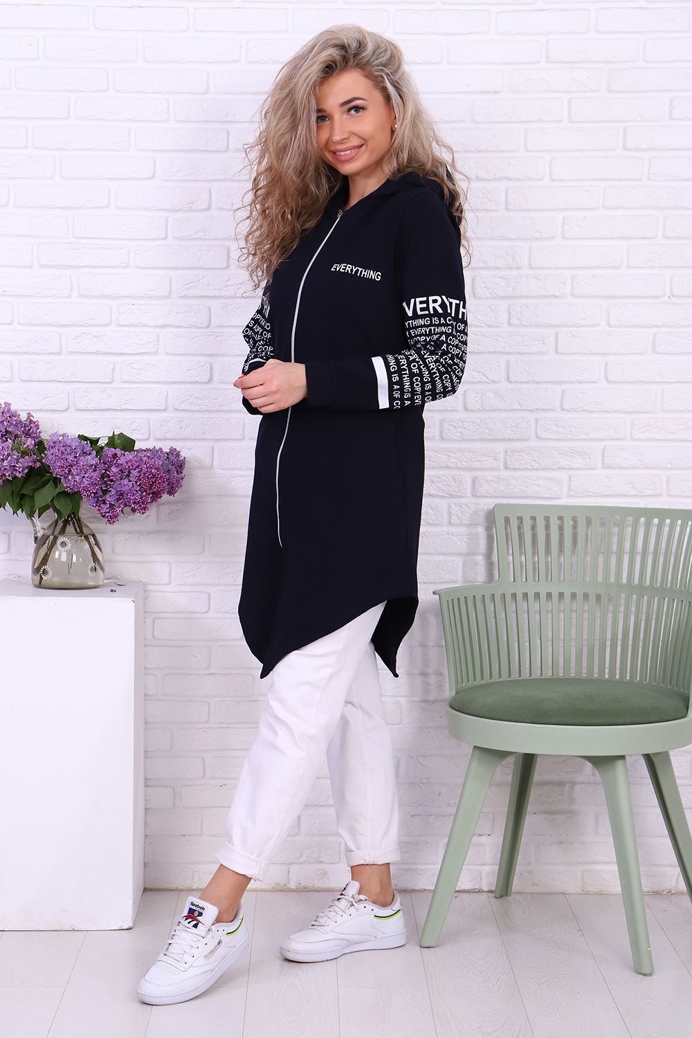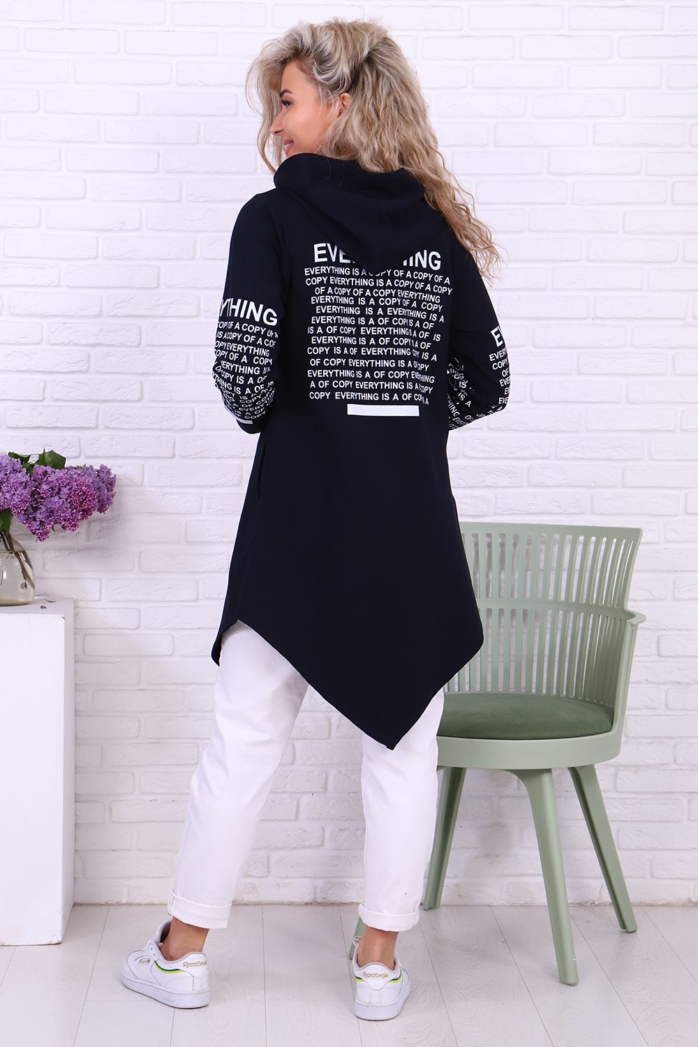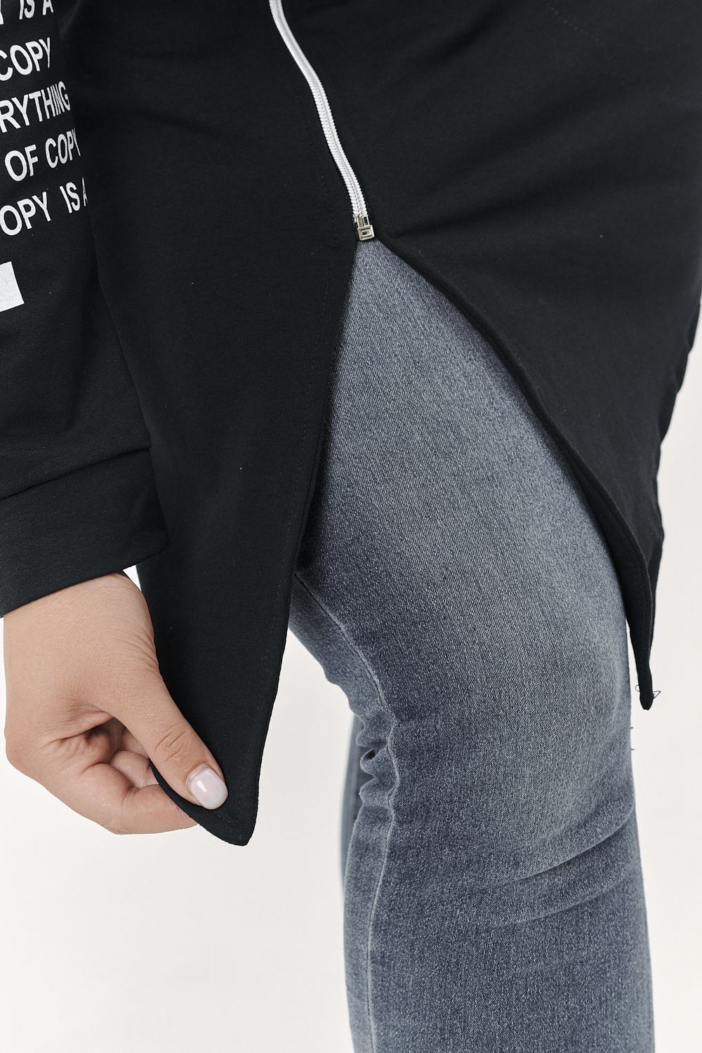 Туника необычного кроя из футера с лайкрой. Длинные рукава, общая длина до коленей спереди, более коротко по бокам. На молнии, с капюшоном. Дизайн в виде принтов с надписями