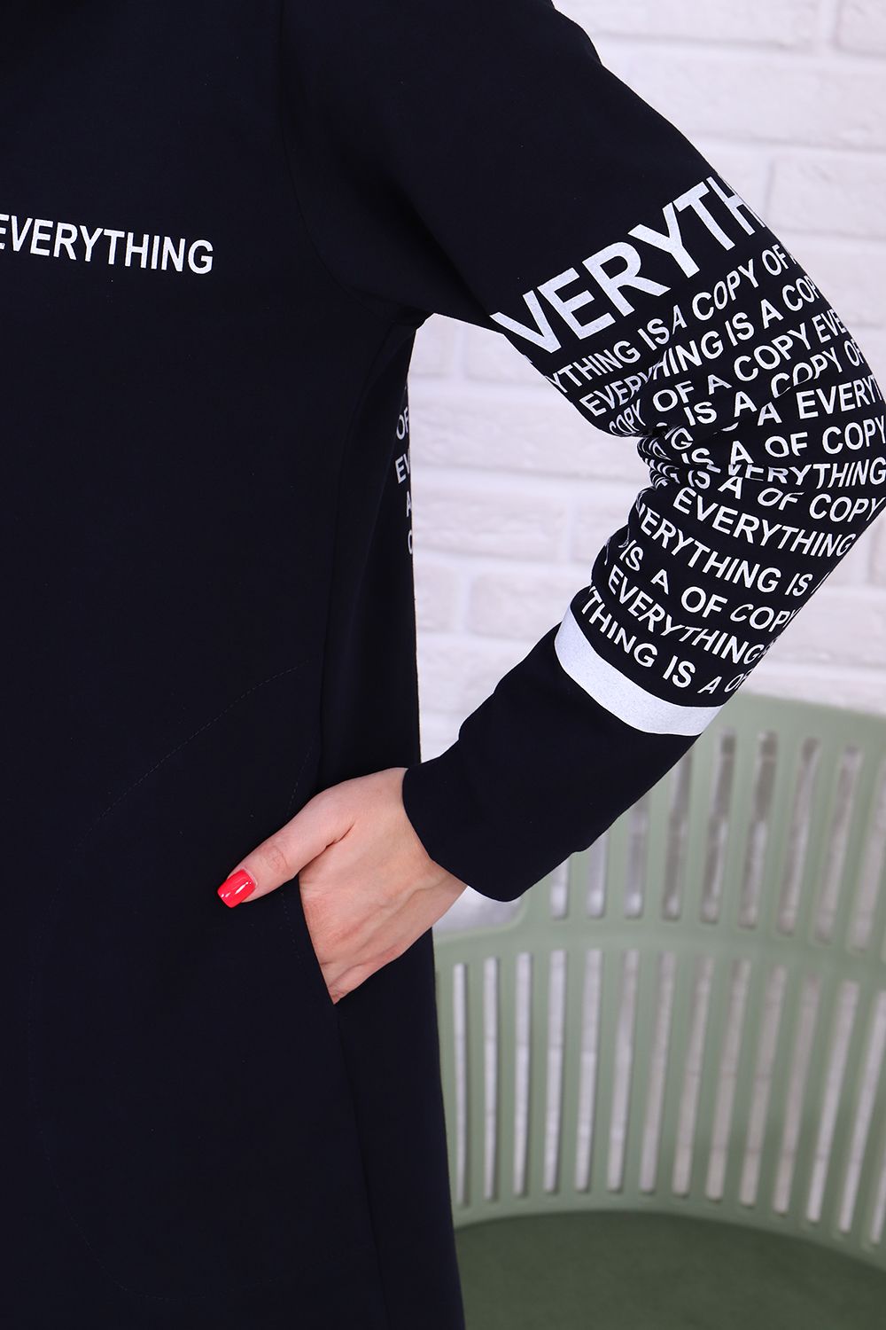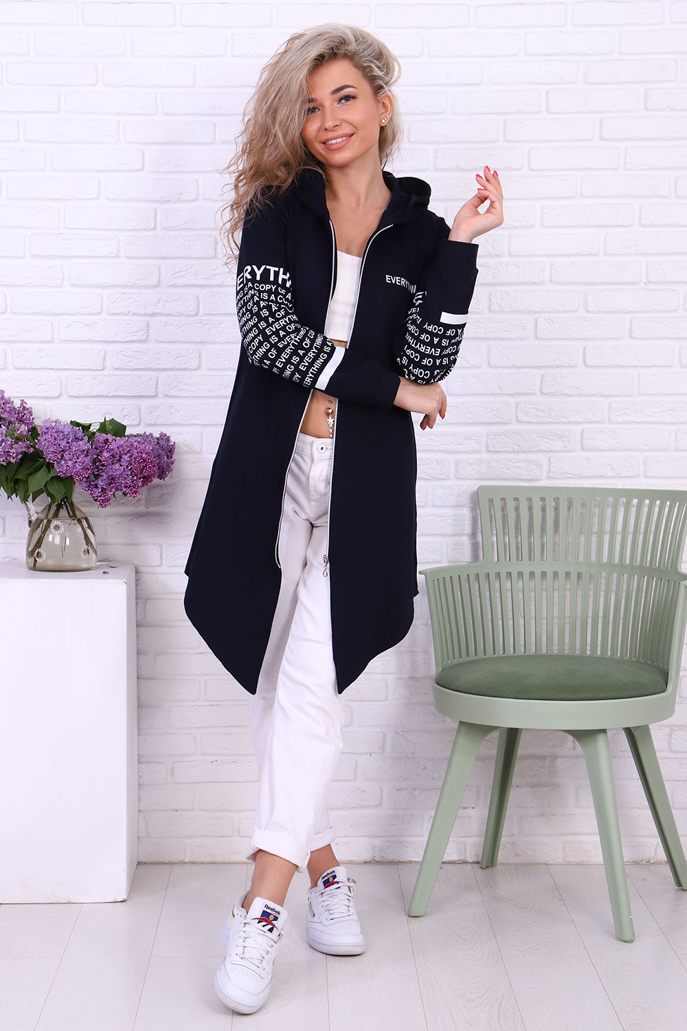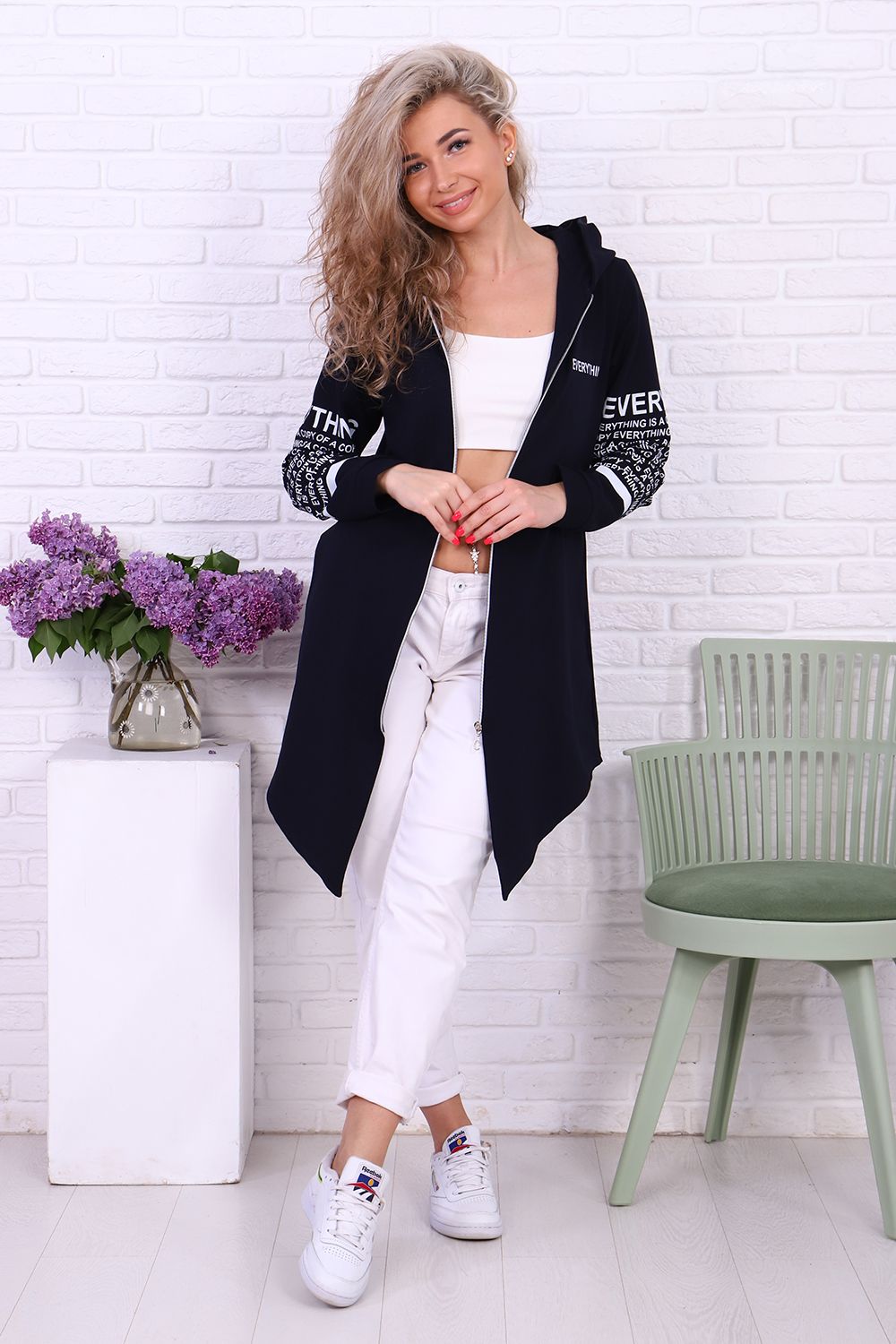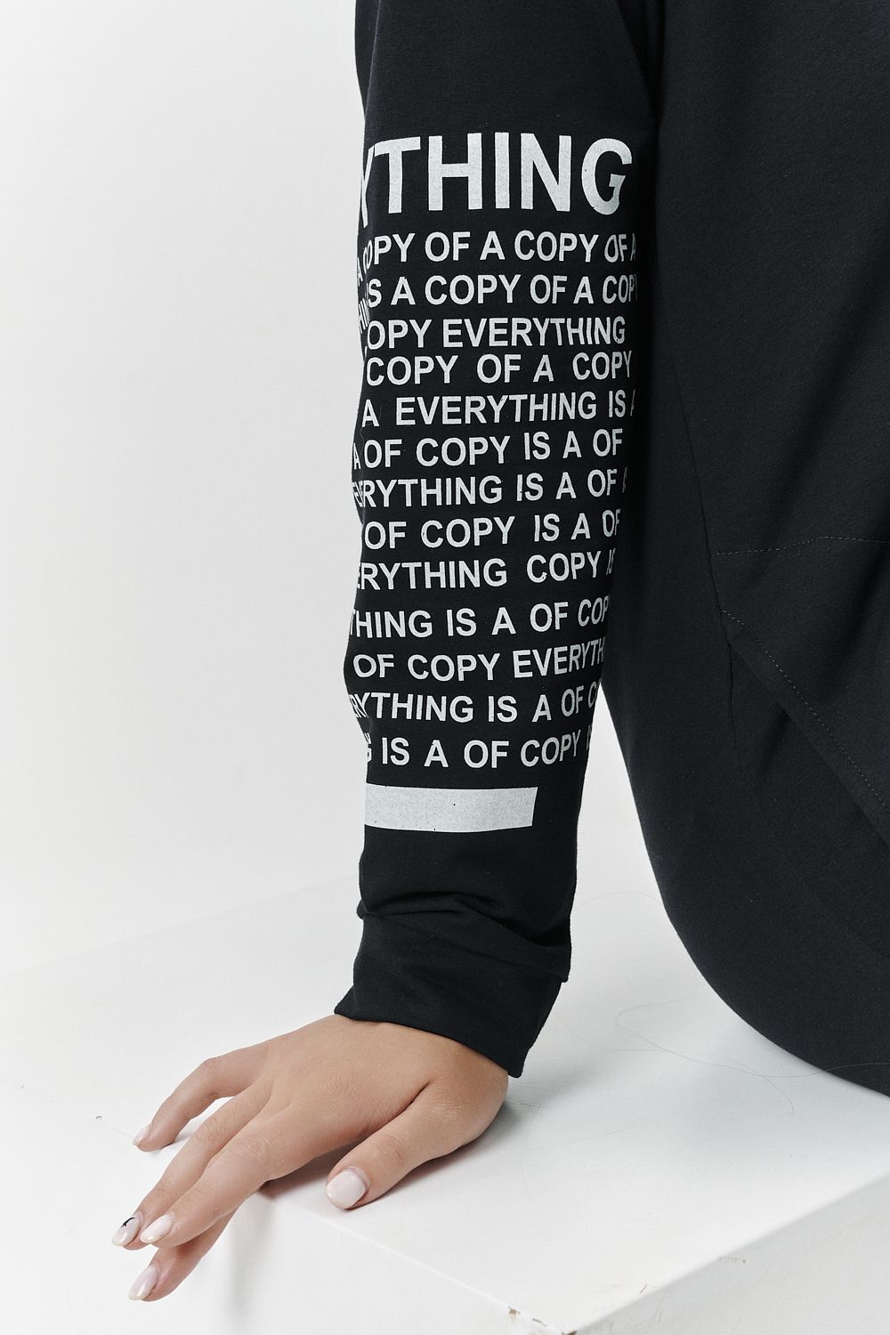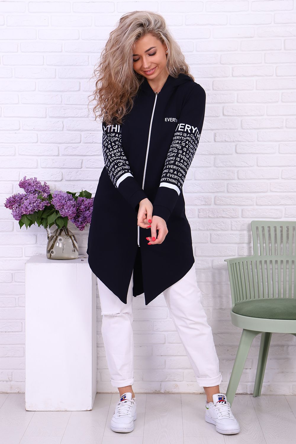 Туника необычного кроя из футера с лайкрой. Длинные рукава, общая длина до коленей спереди, более коротко по бокам. На молнии, с капюшоном. Дизайн в виде принтов с надписями