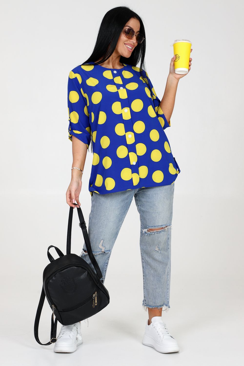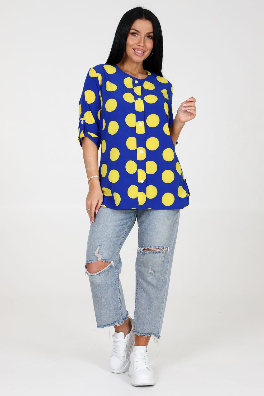 Женская туника свободного кроя из ткани прадо - удобная и стильная многофункциональная одежда для модных женщин. Изготовлена из высококачественной ткани, состоящей на 97% из полиэстера и 3% из эластана, она обеспечивает комфорт и отличную посадку. Эта модель туники имеет полочку, которая украшена планкой с декоративными пуговицами, добавляющими особый шарм к изделию. Выточки на полочке придают ей дополнительно аккуратный и женственный вид. Рукава и низ изделия завершены патами, что создает интересный и элегантный общий образ. Туника также украшена стильным рисунком в виде гороха, который придает ей игривость и неотразимость. Благодаря свободному крою, она позволяет чувствовать себя комфортно и свободно в любой ситуации. Эта туника идеально подходит для создания разнообразных образов - от повседневного до официального. Ее универсальность и классический дизайн делают ее незаменимой частью гардероба каждой модницы.