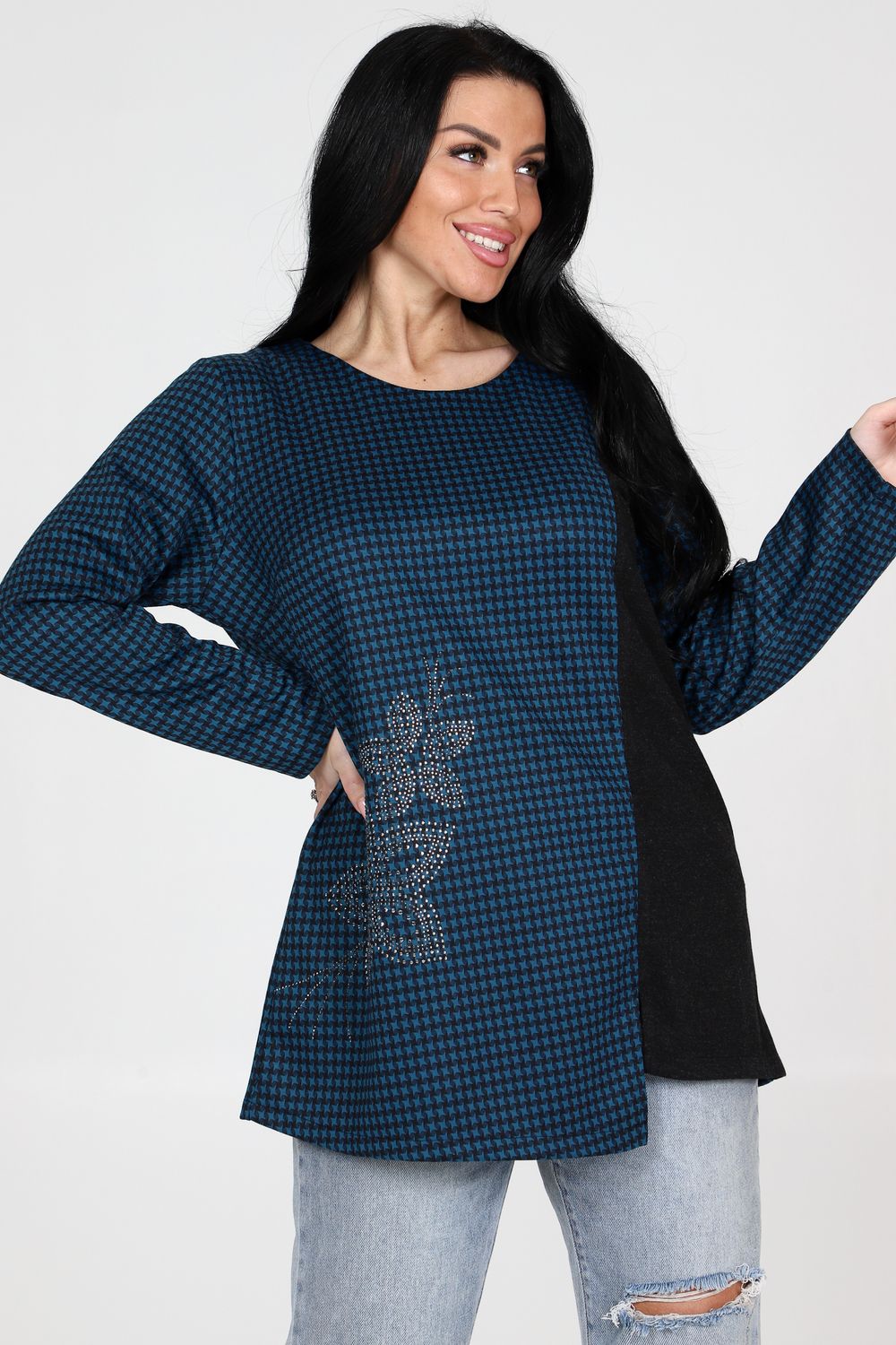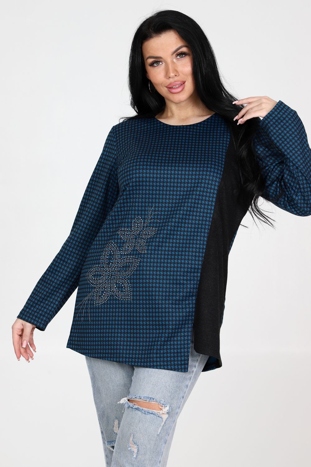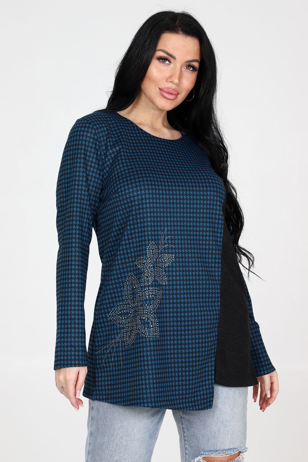 Приобретите стильную и приталенную тунику с округлой горловиной и длинными рукавами прямо сейчас! Изготовленная с использованием высококачественных материалов, туника сразу же привлечет внимание своей изысканной отделочной тканью на полочке, которая придаст ей уникальный шарм. На полочке украшены декоративные стразы, которые придают этой тунике блеск и элегантность. Комбинация приталенного кроя и разреза по низу обеспечивает не только модный вид, но также подчеркивает фигуру, делая ваш образ еще более привлекательным. Туника подходит для различных мероприятий – от повседневных выходов до особых случаев. Она отлично комбинируется с джинсами, юбками или брюками, позволяя вам создавать уникальные и стильные образы для каждого случая.