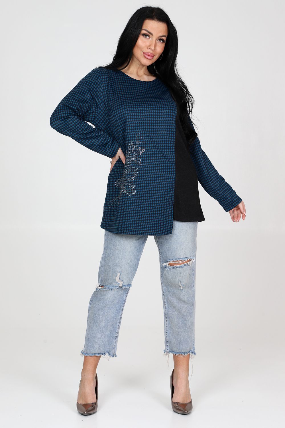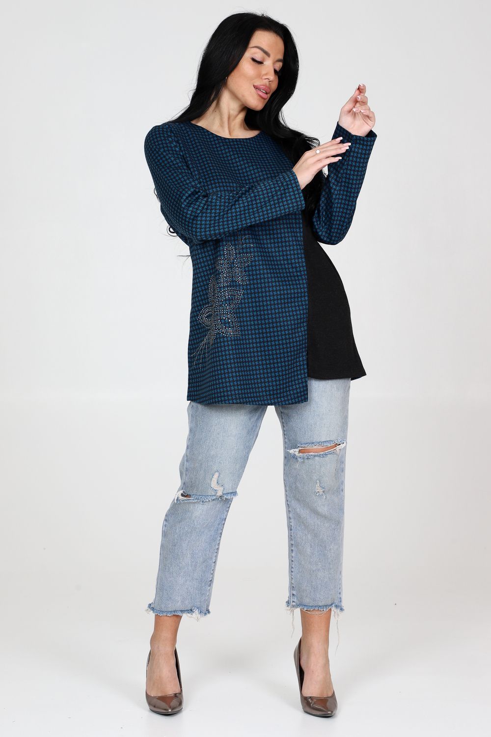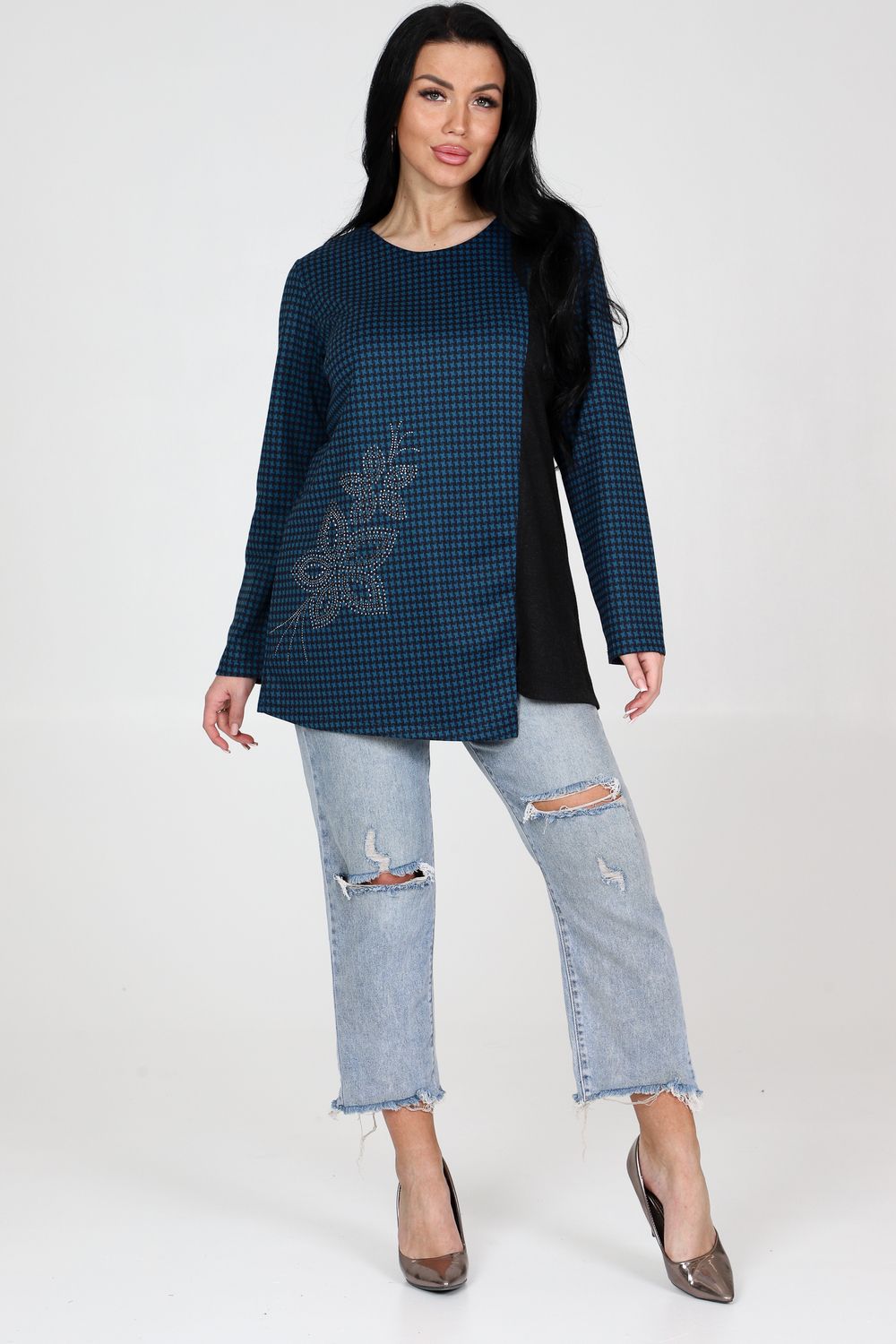 Приобретите стильную и приталенную тунику с округлой горловиной и длинными рукавами прямо сейчас! Изготовленная с использованием высококачественных материалов, туника сразу же привлечет внимание своей изысканной отделочной тканью на полочке, которая придаст ей уникальный шарм. На полочке украшены декоративные стразы, которые придают этой тунике блеск и элегантность. Комбинация приталенного кроя и разреза по низу обеспечивает не только модный вид, но также подчеркивает фигуру, делая ваш образ еще более привлекательным. Туника подходит для различных мероприятий – от повседневных выходов до особых случаев. Она отлично комбинируется с джинсами, юбками или брюками, позволяя вам создавать уникальные и стильные образы для каждого случая.