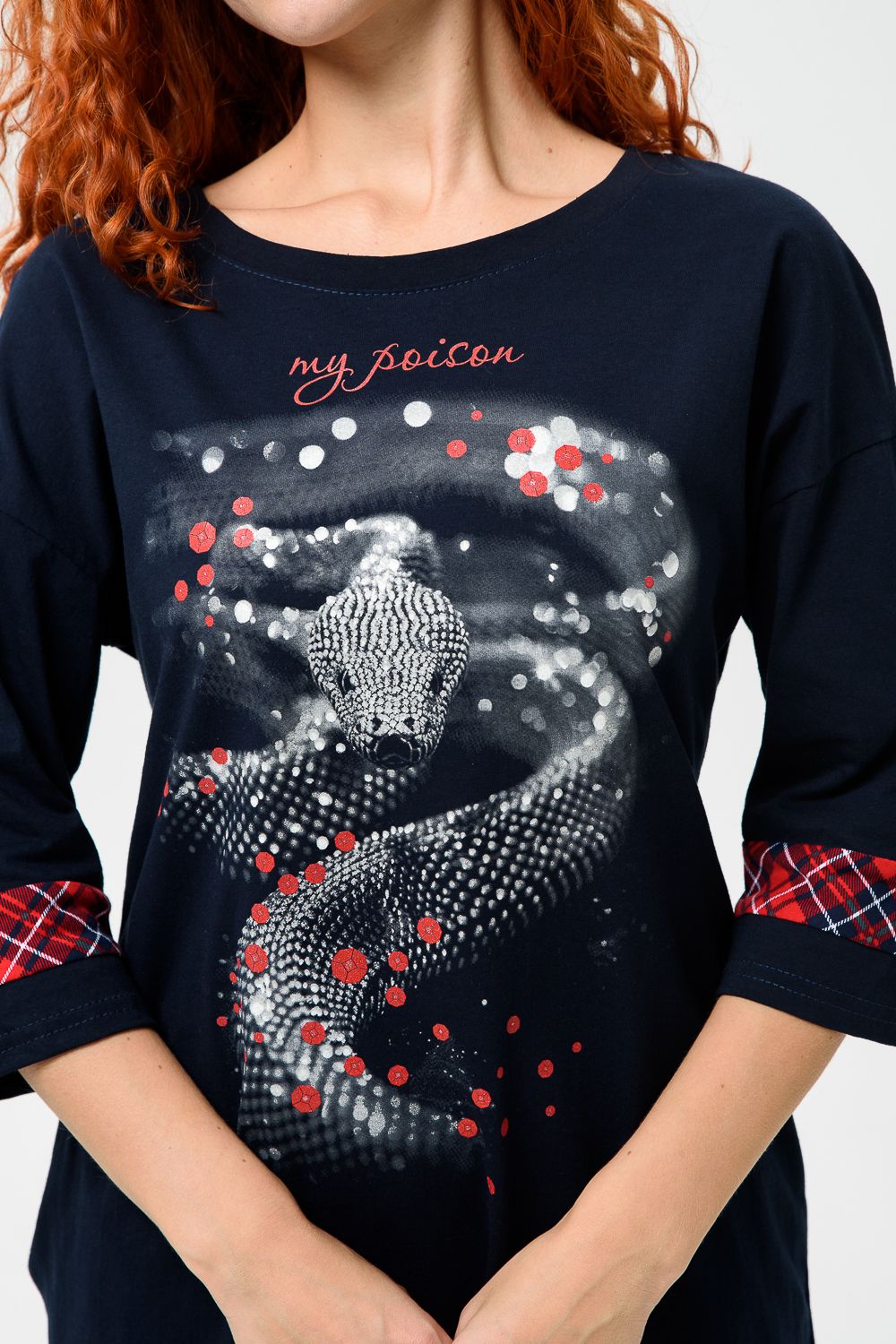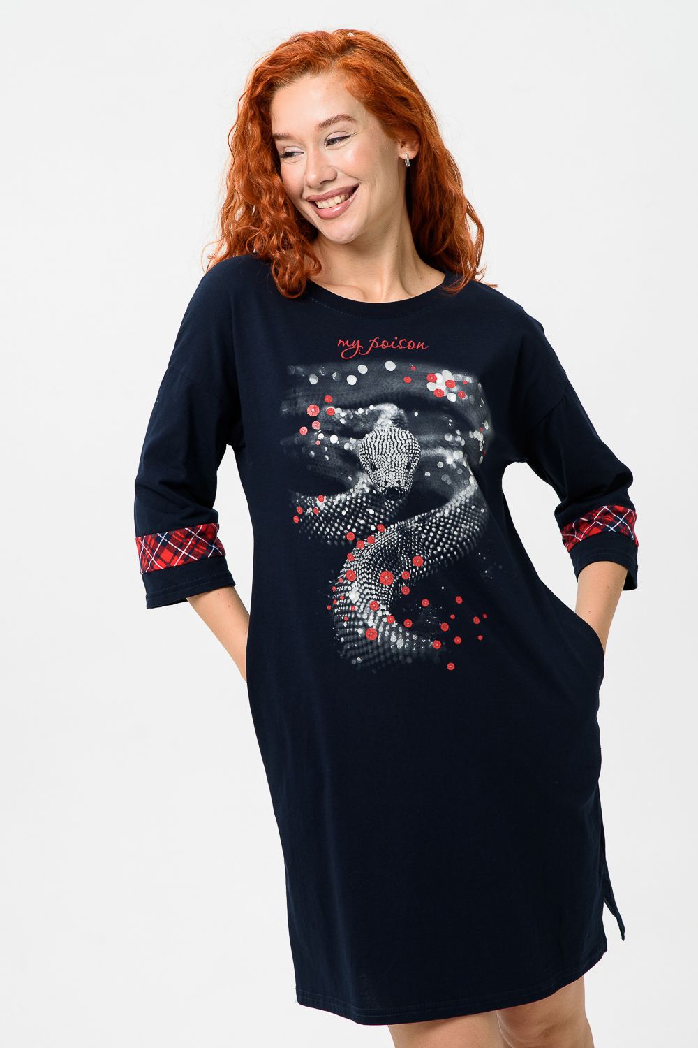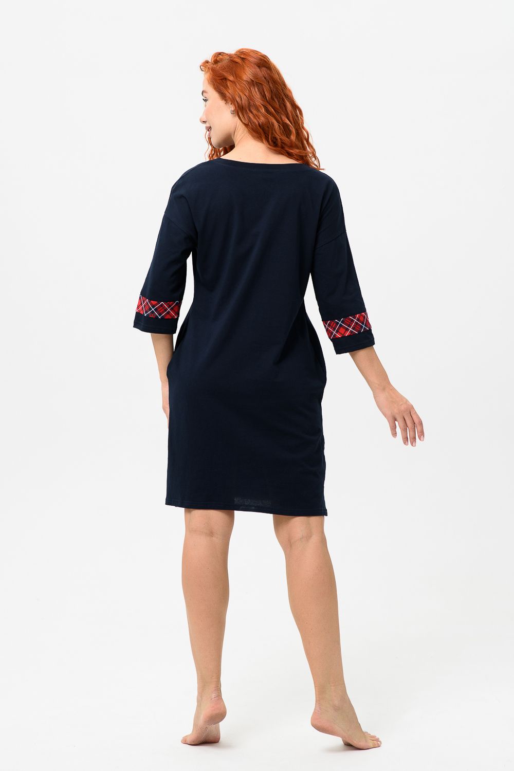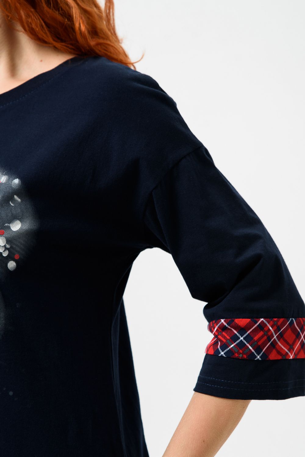Туника прямого силуэта, длиной выше колена, с округлой горловиной, с карманами в боковых швах. Рукав длиной 3/4. С разрезами в нижней части боковых швов. Горловина обработана обтачкой из основного полотна.